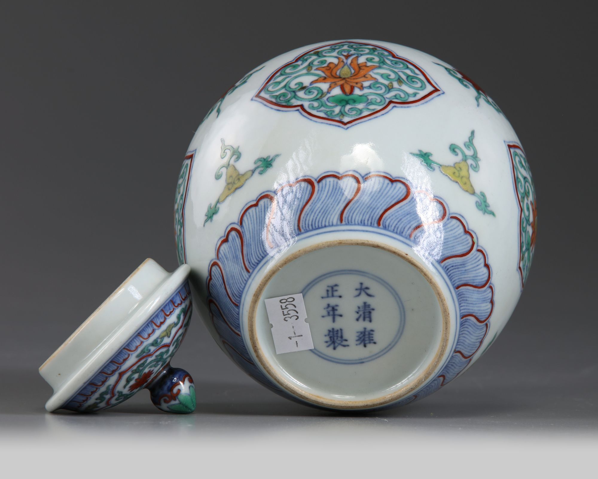 The jar is decorated with four cartouches enclosing lotus scrolls interspersed with a double row of lotus and trefoil cloud scroll, all below a petal band to the rim. The base with an apocryphal Yongzheng mark. The domed cover is similarly decorated and is surmounted by a lotus bud finial.