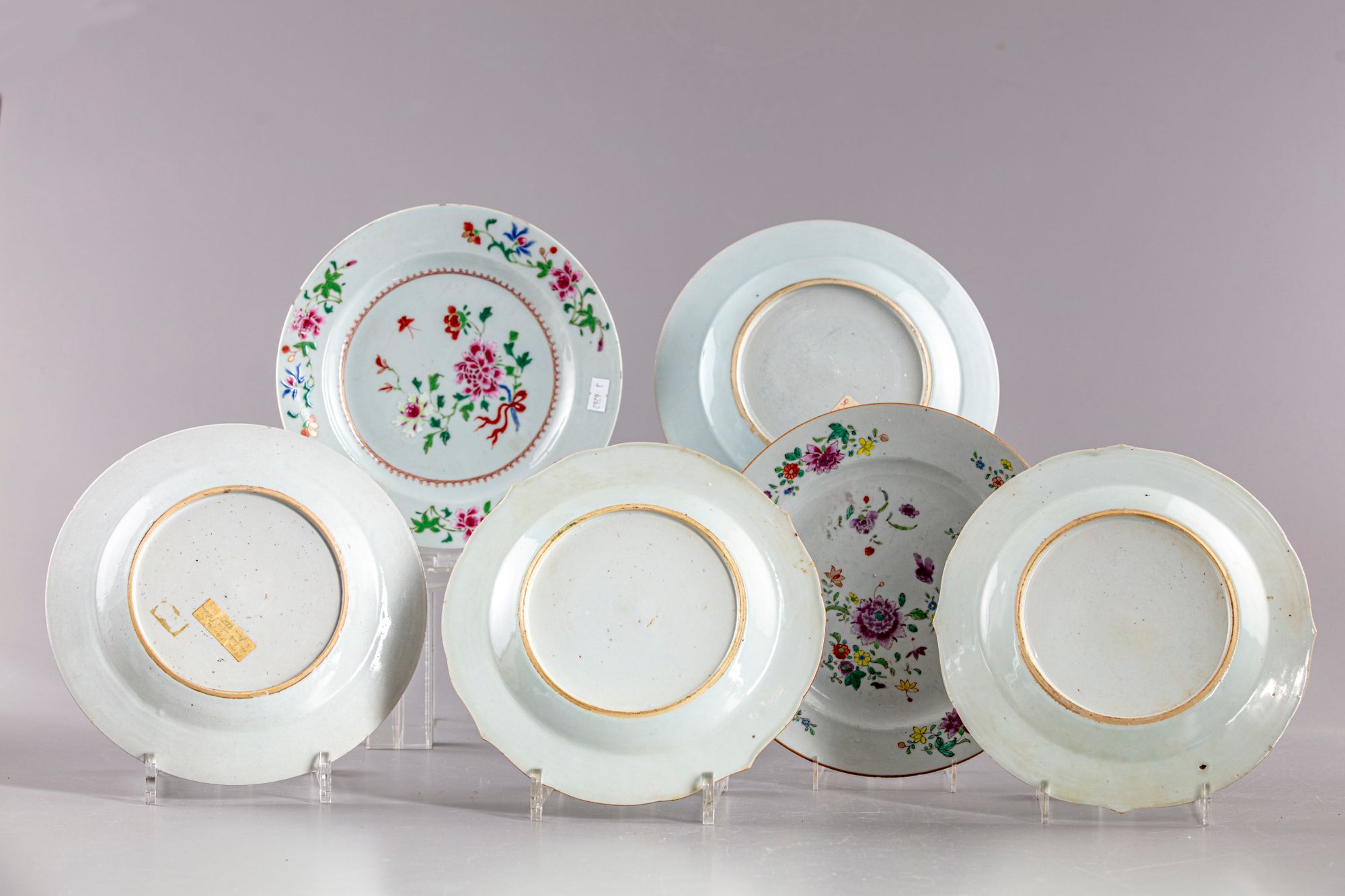 Six Chinese famille rose dishes, decorated with different flowers and foliage.