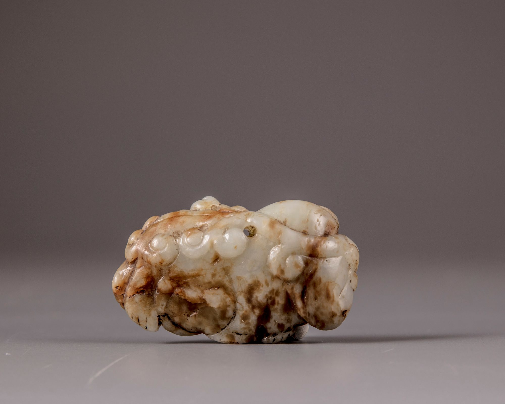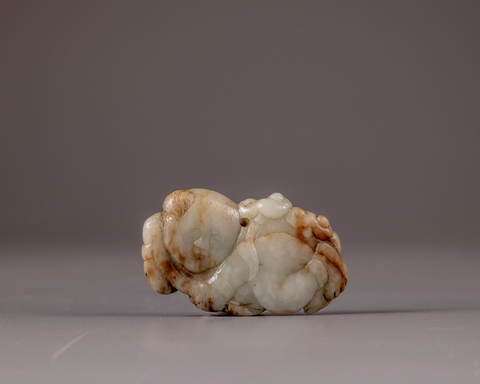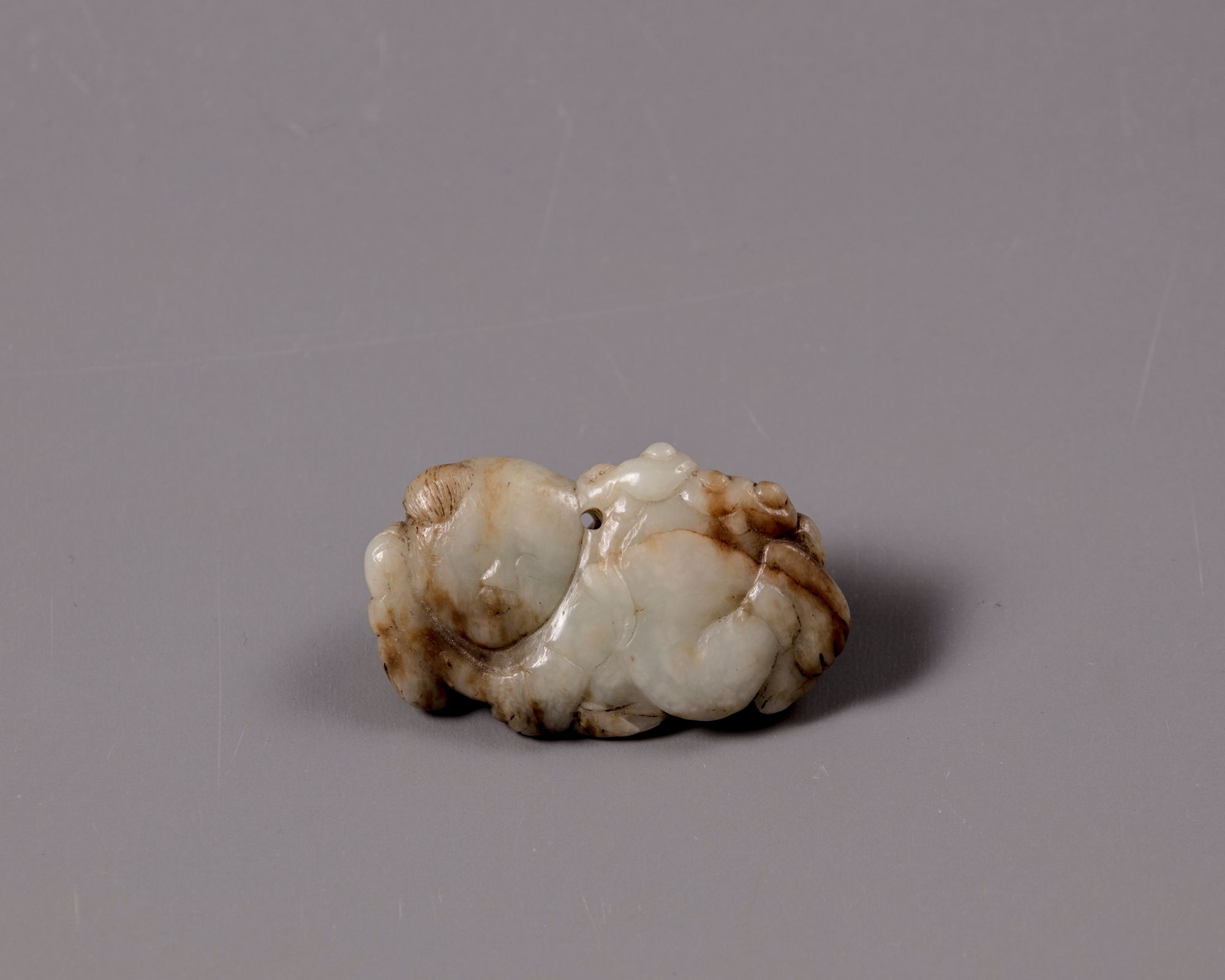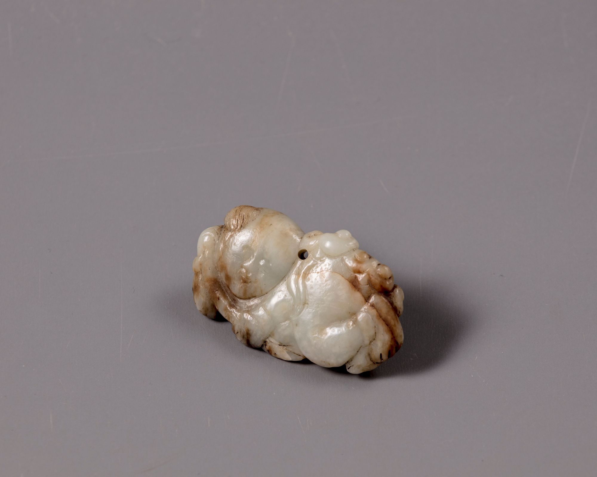 The jade figure is carved in the round as a smiling crouching boy, each of his hands grasping a lingzhi branch slung over his body. With an aperture for suspension by the side of his head. The stone is of a pale celadon tone with russet veins and inclusions.