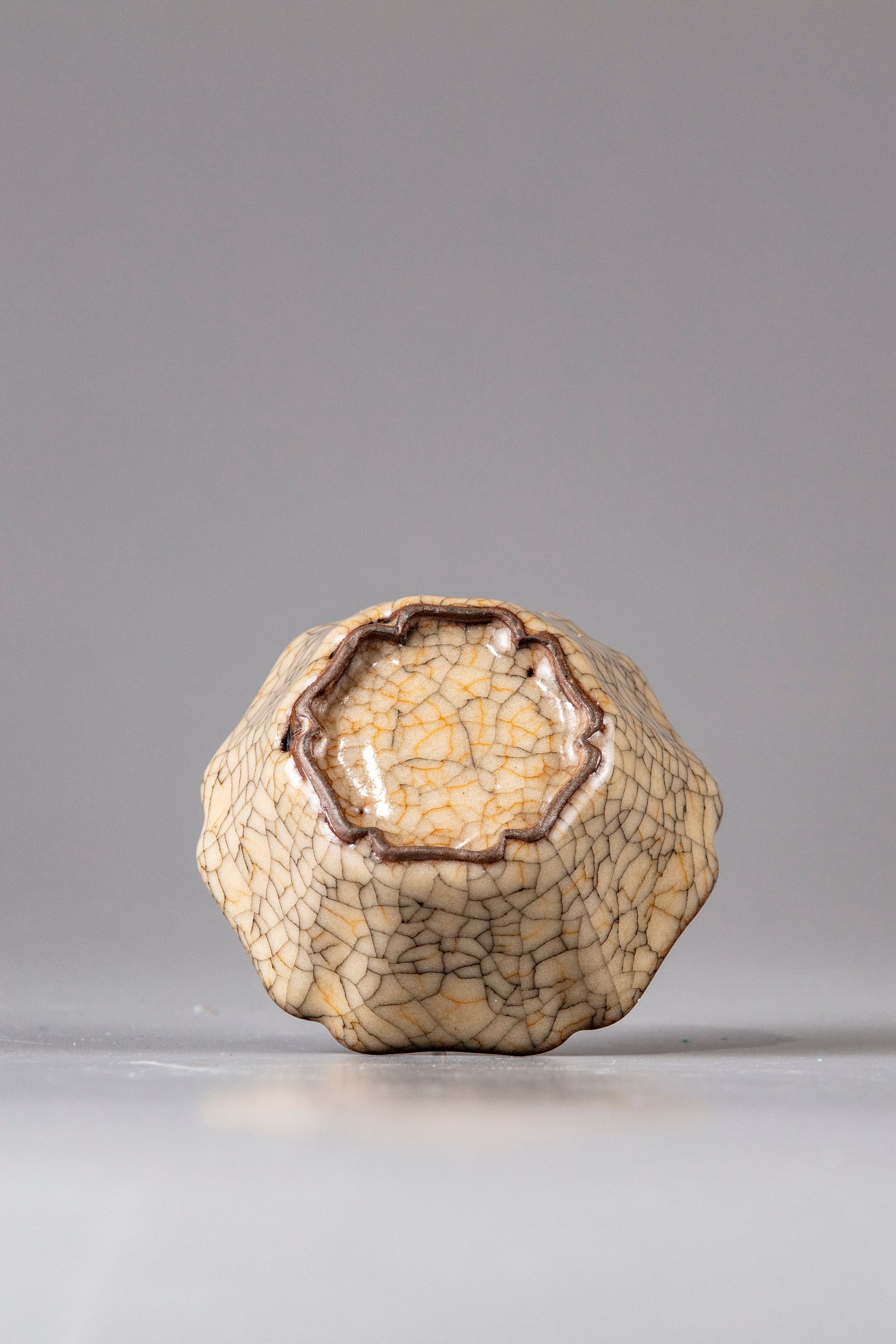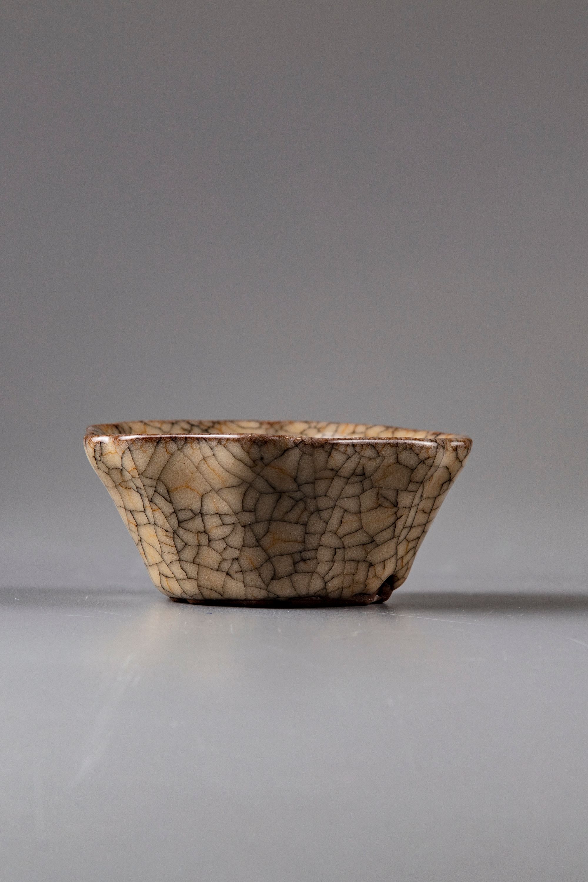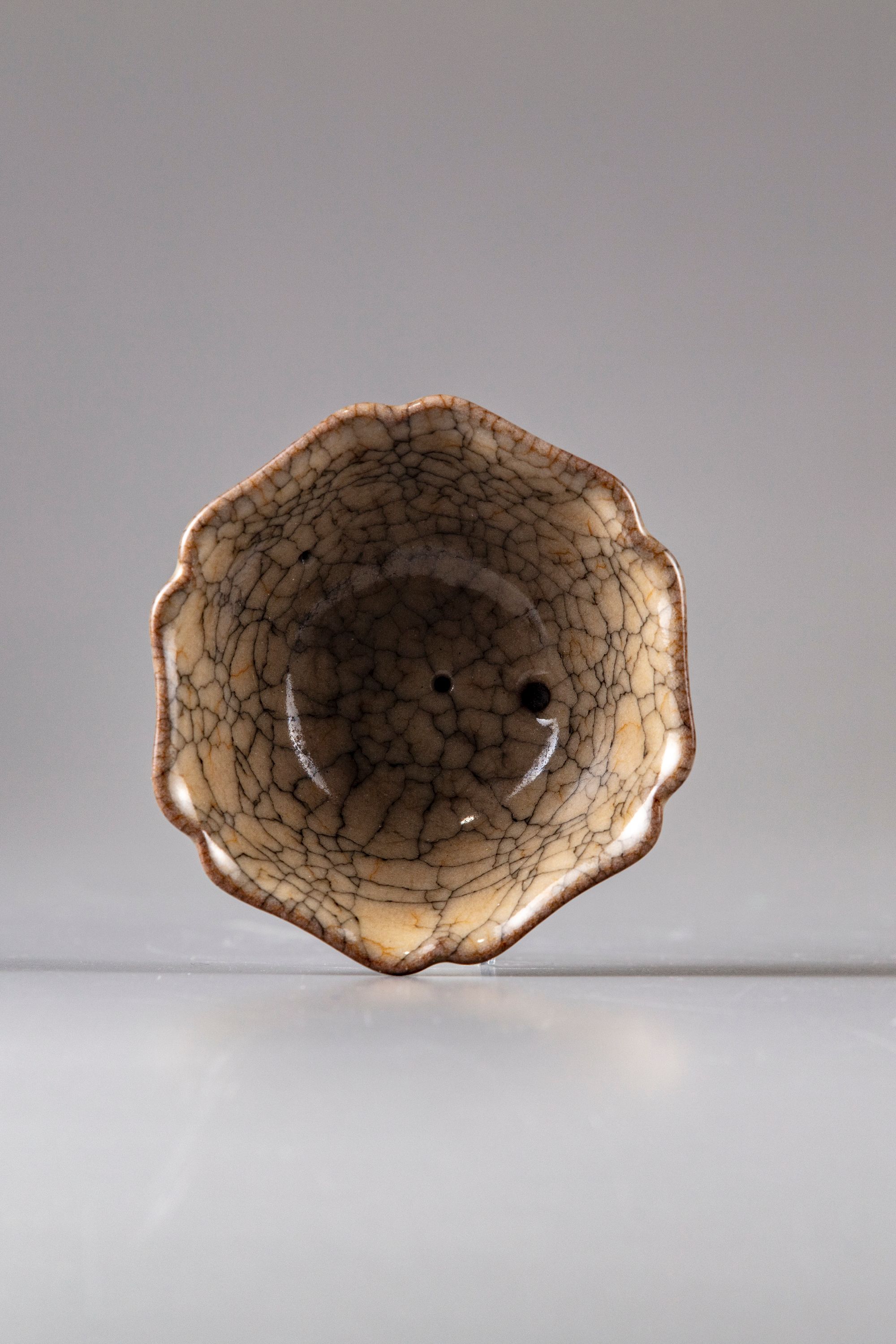 The hexagonal small bowl stands on a small unglazed base and covered with brownish crackled glaze .