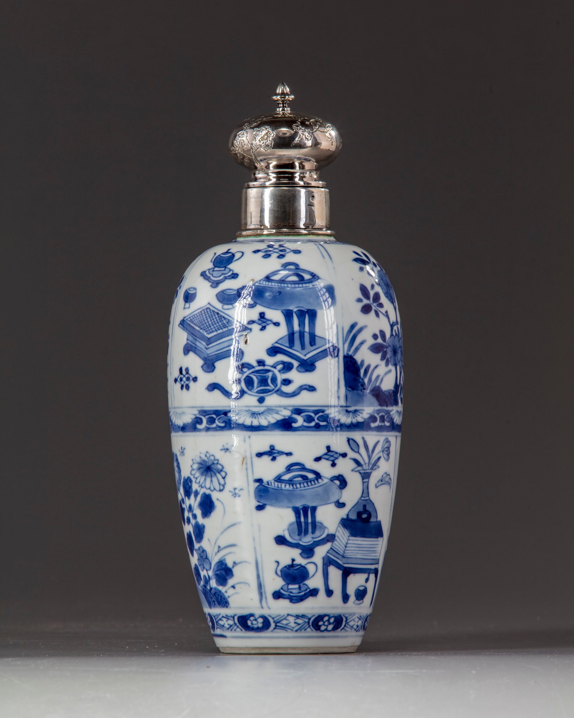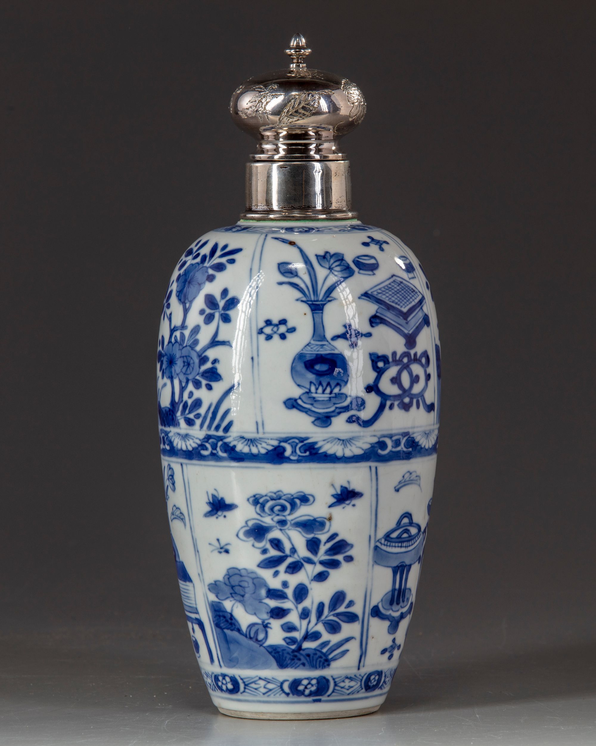 A Chinese porcelain jar with silver mounting, decorated with alternating panels enclosing flowering branches and precious objects" censers, tables and vases.
