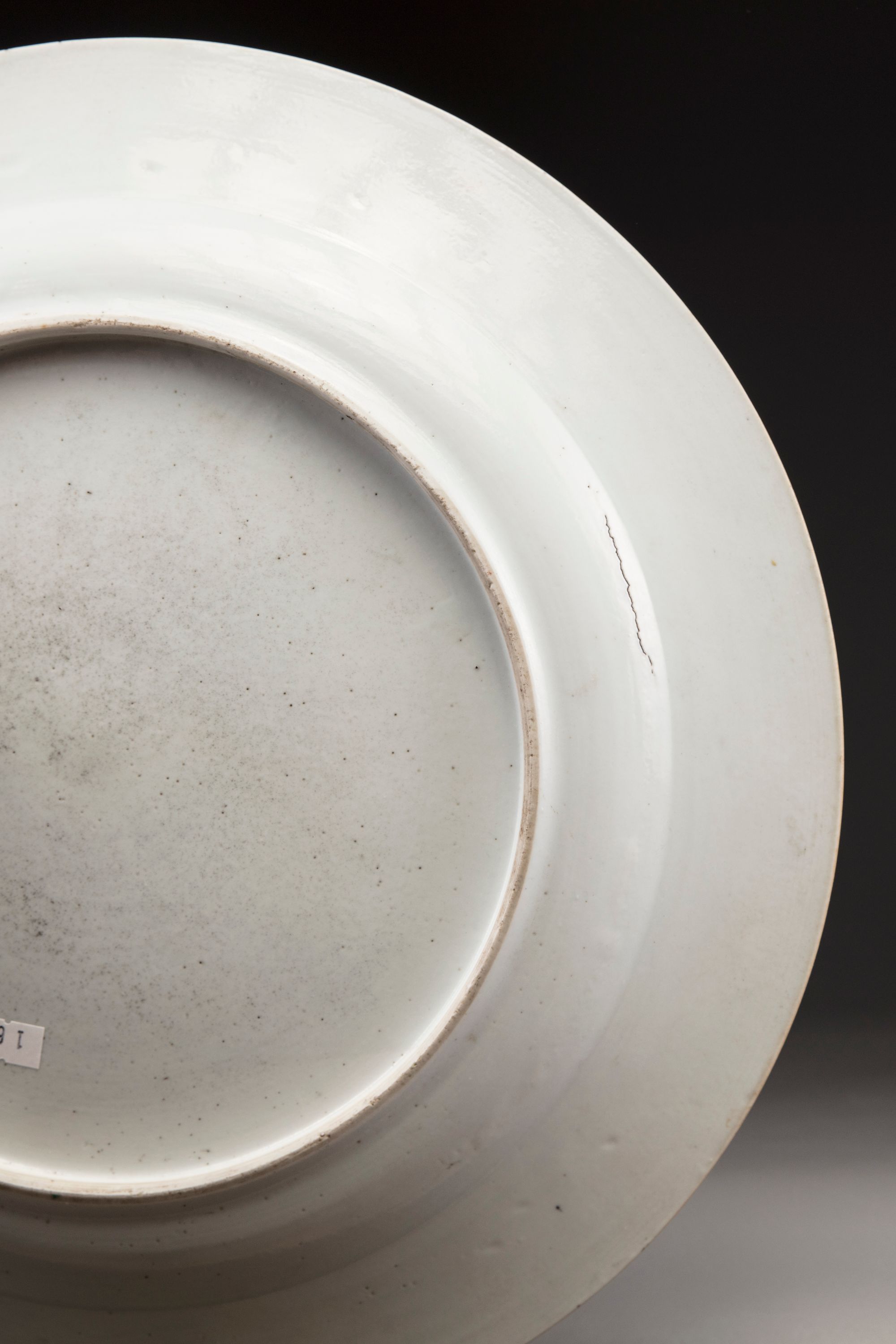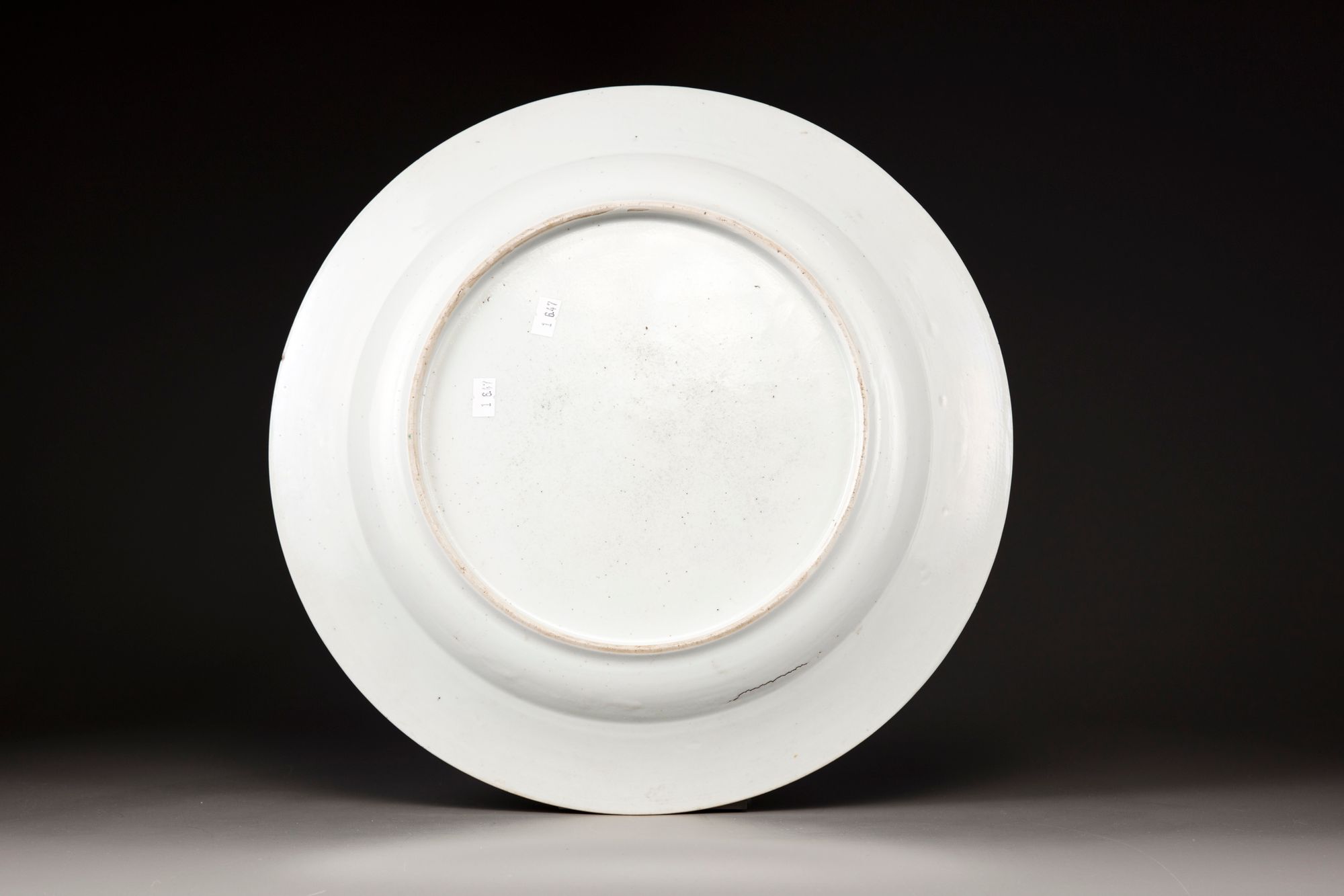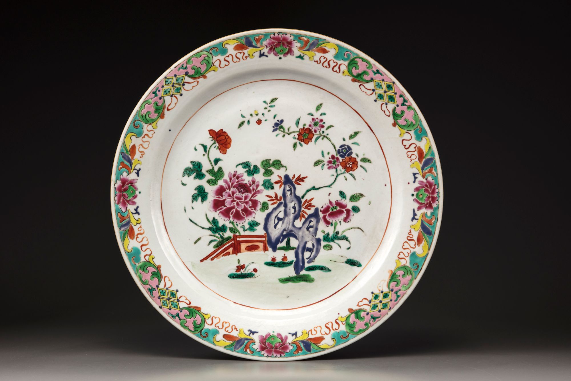 The famille rose dish is painted to the centre with flowers amongst pierced rocks in a fenced garden. The scene is surrounded by a shaped border enclosing auspicious emblems and flower heads.