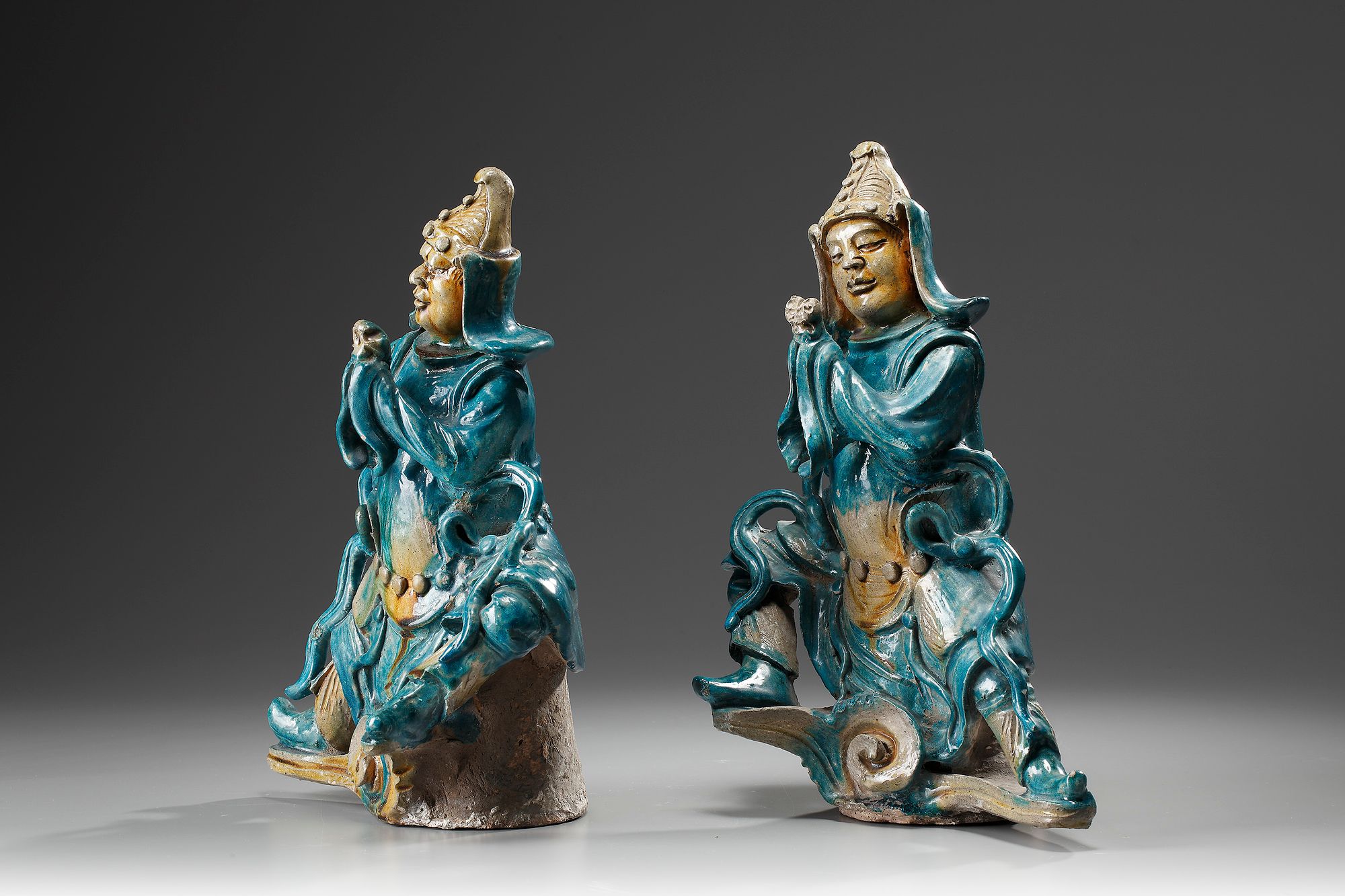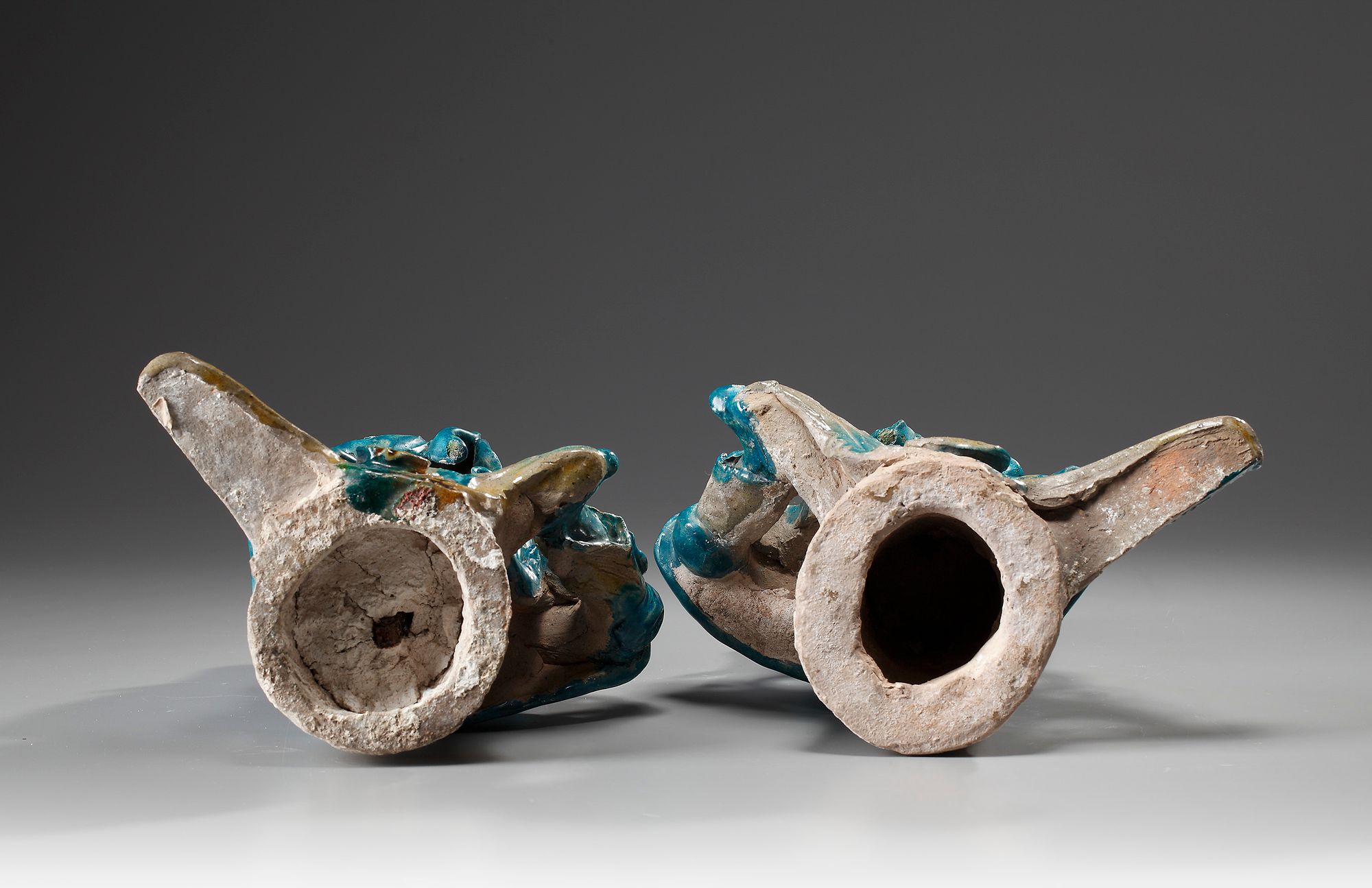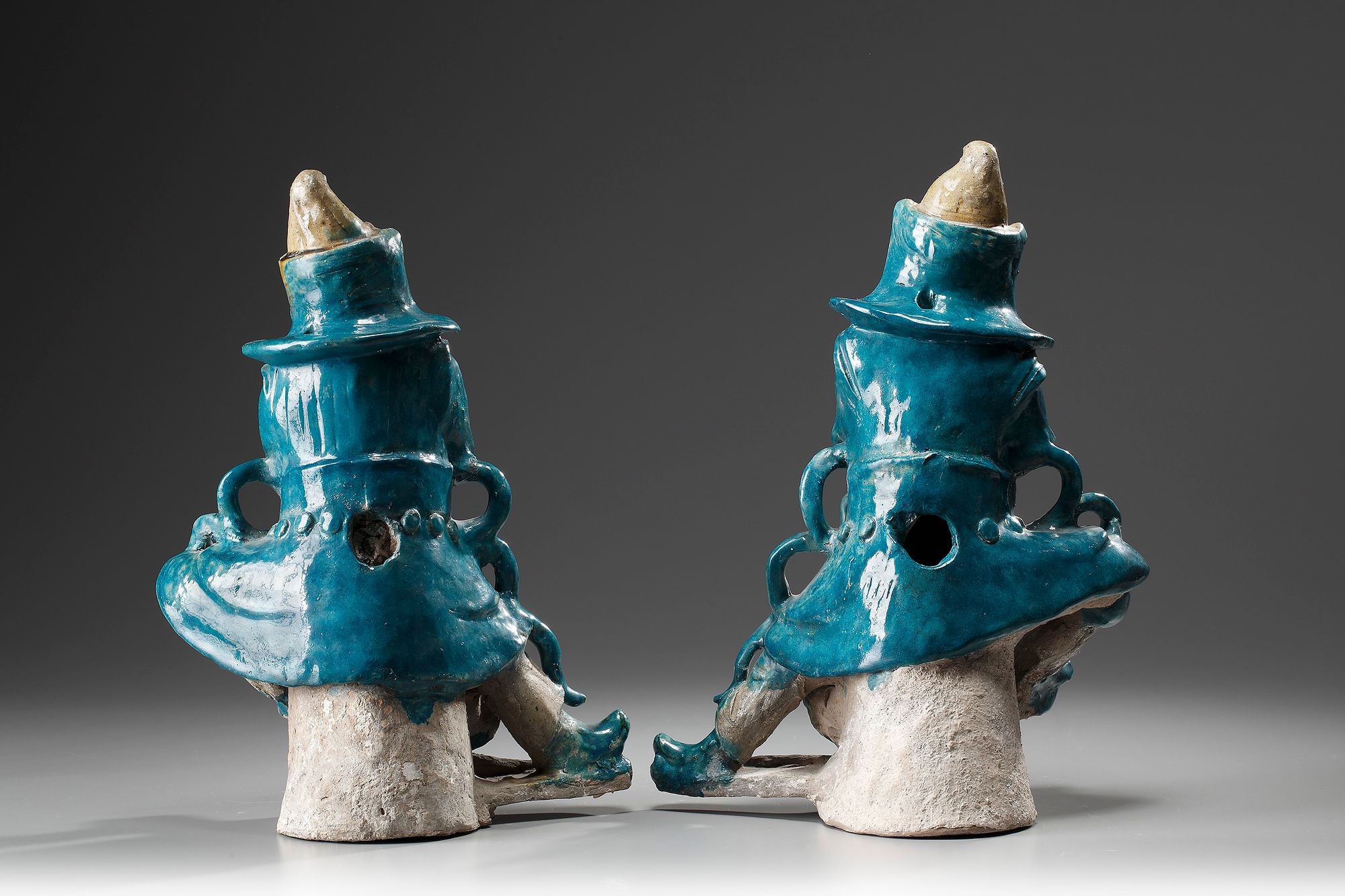 Modeled as a Warrior and decorated with a turquoise and yellow glaze.