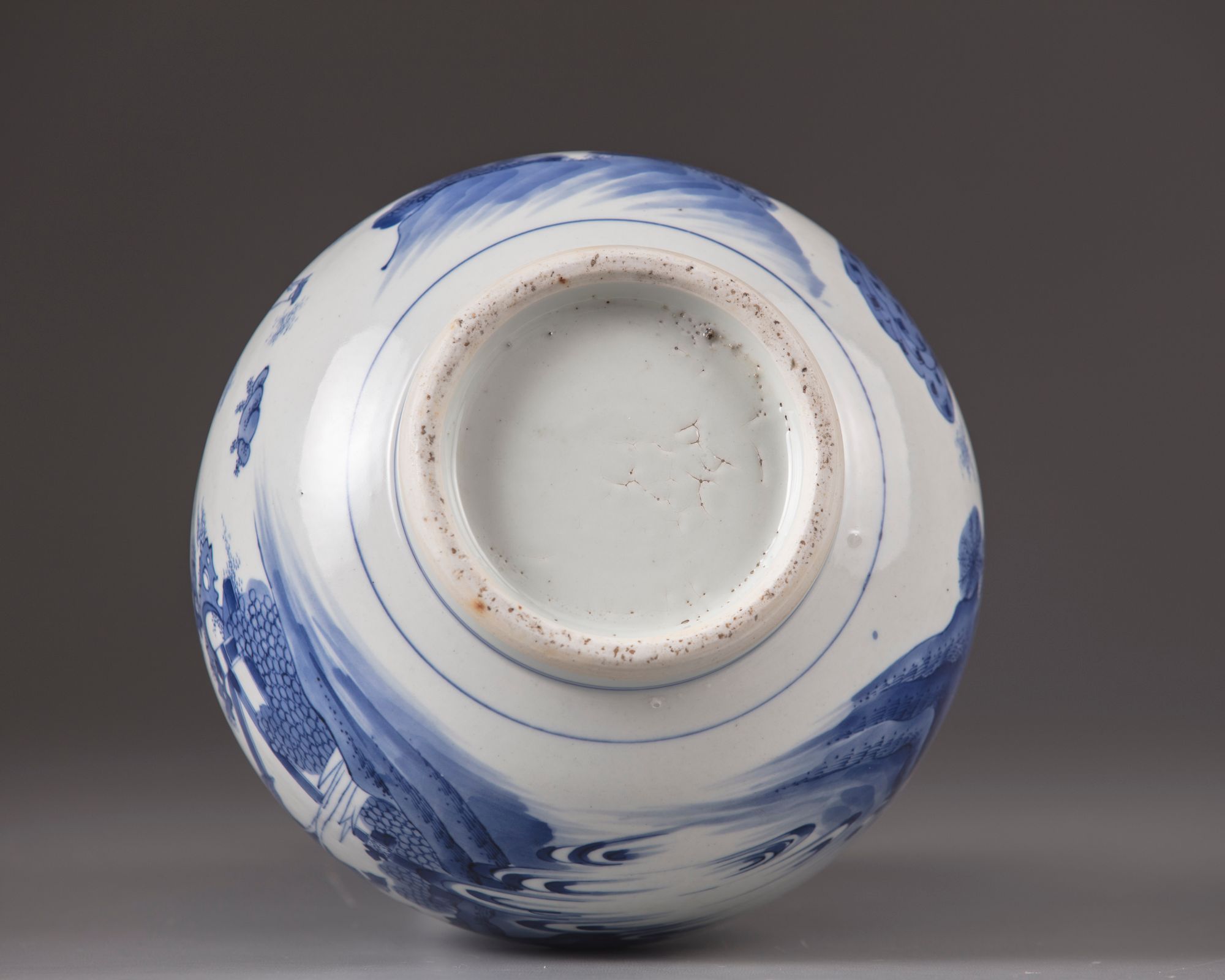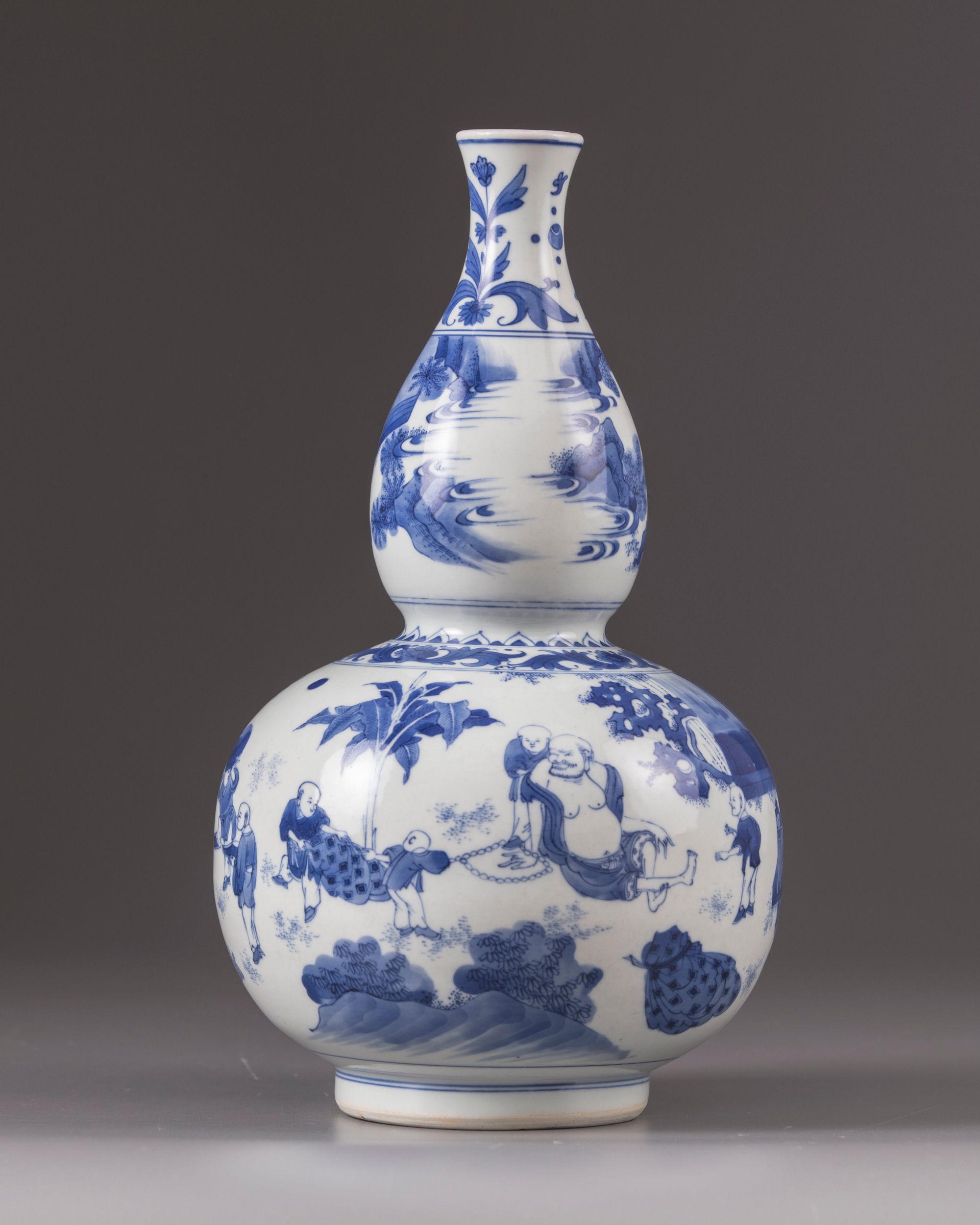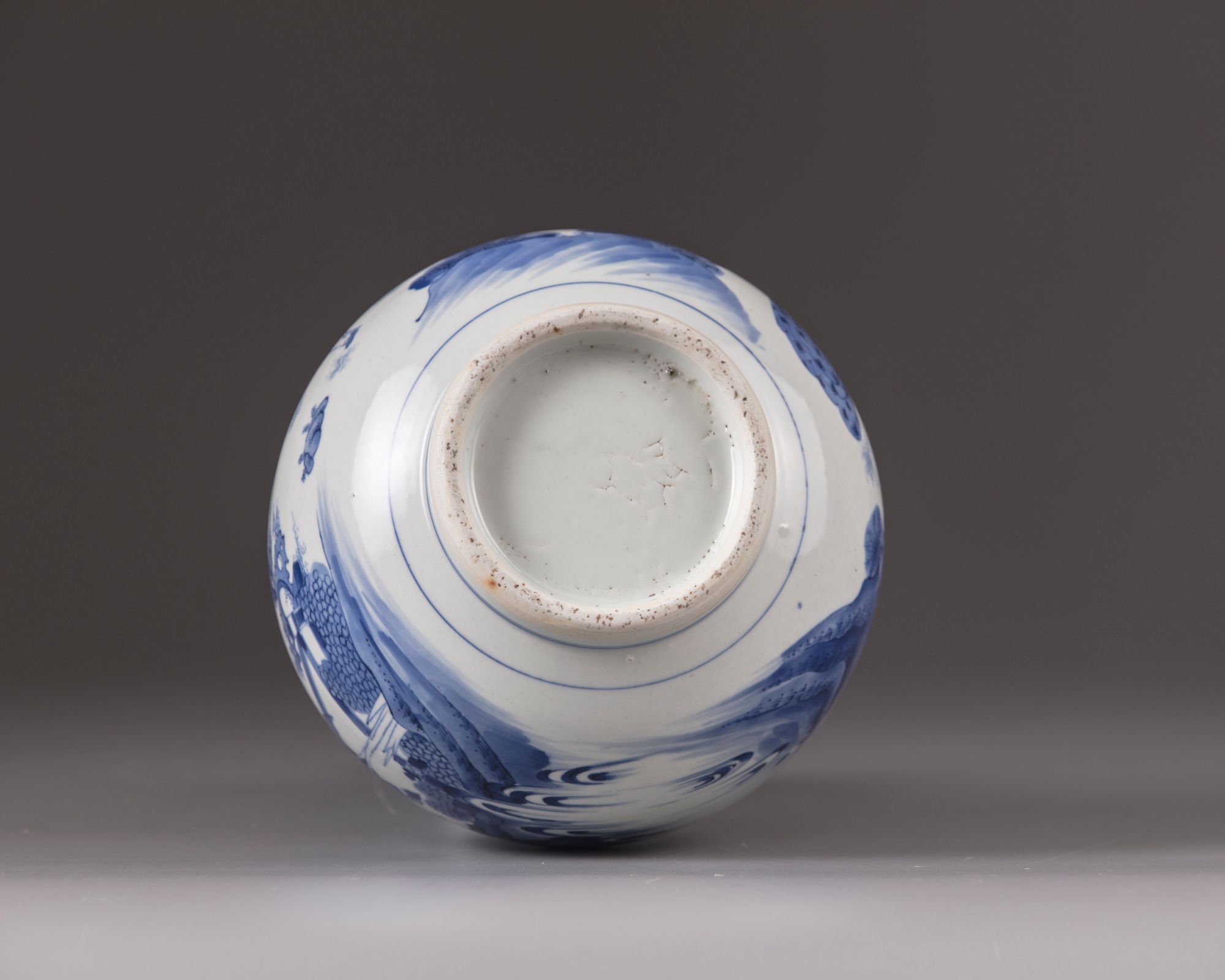 The lower globular section is decorated in blue with an elderly figure with boys in a garden