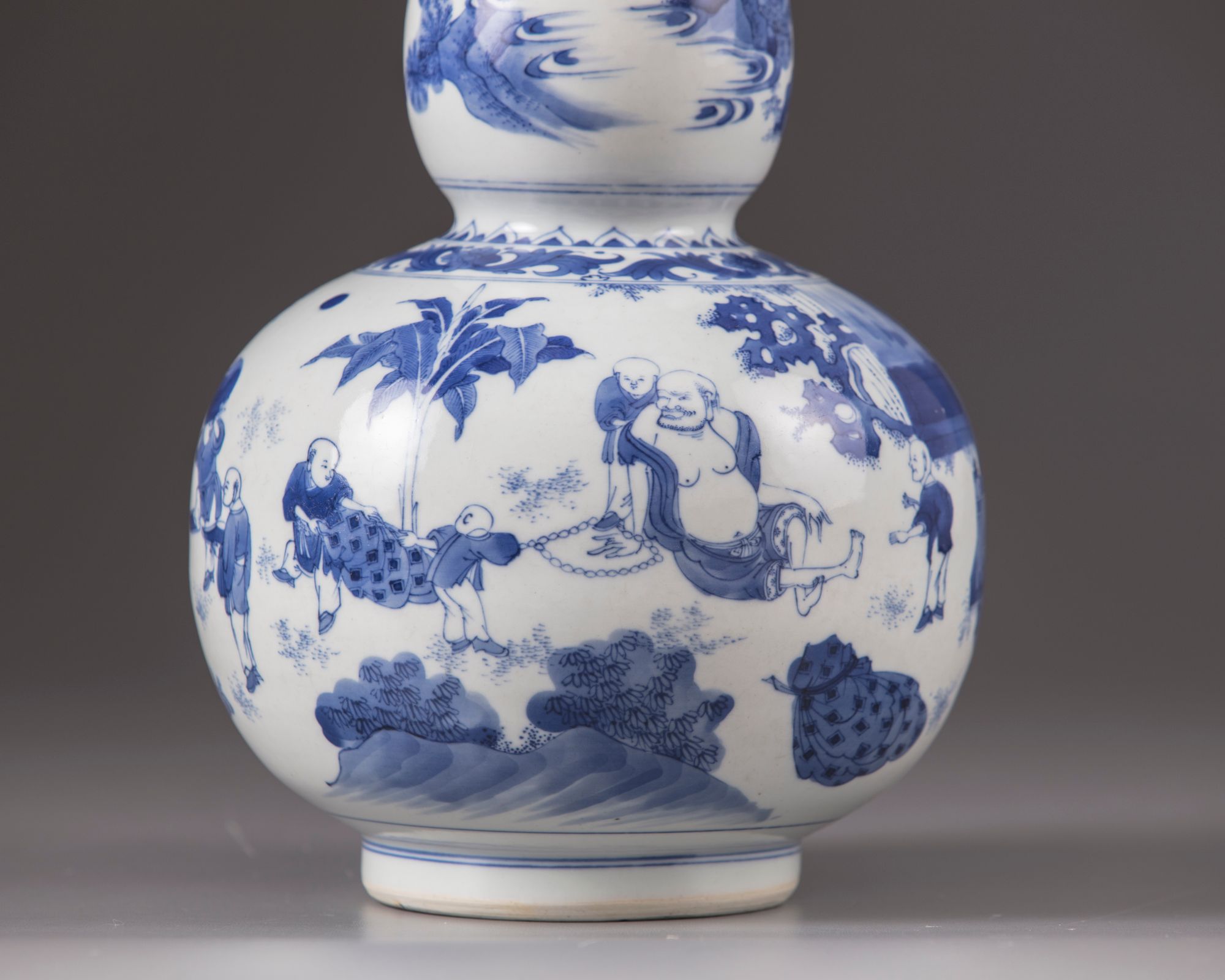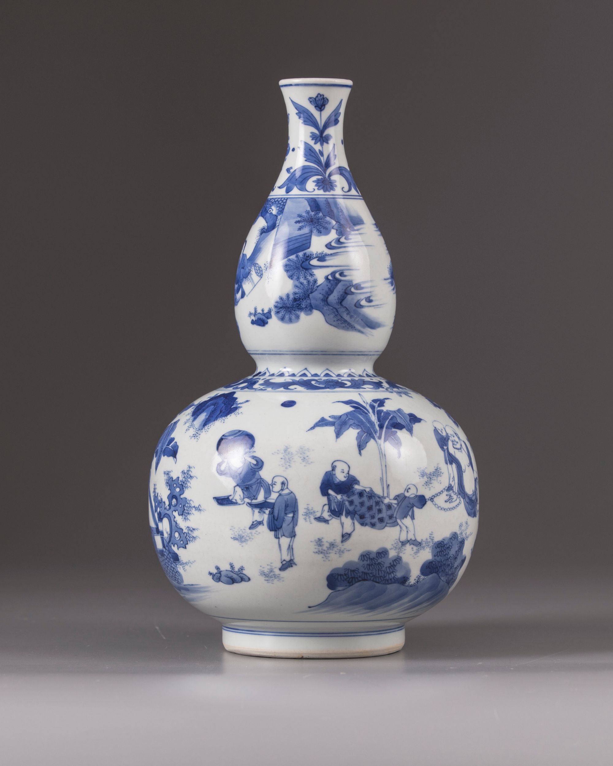 beneath the upper pear-form section which is decorated with a scholar and attendant seated in a landscape below the slender neck.