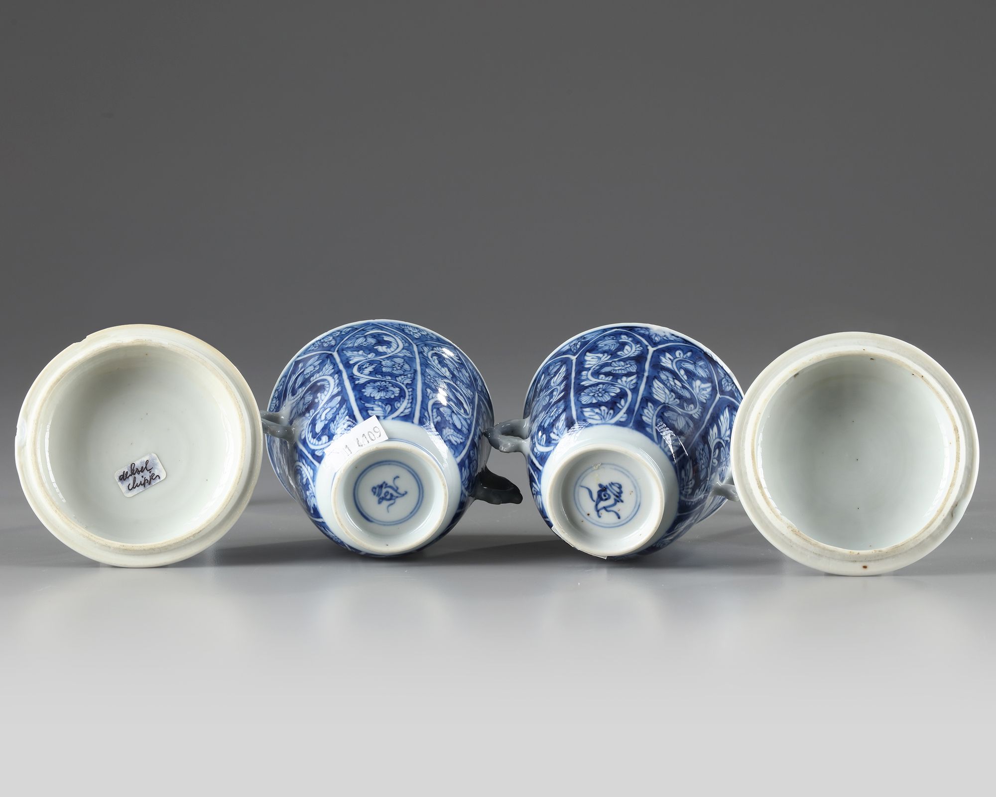 Each cup is affixed with two shaped handles, each interior is decorated with a peony blossom, the exterior decorated with eight lotus-shaped panels enclosing a winding flowering vine. The covers are similarly decorated and are surmounted by a lotus bud finial. The bases each with a conch shell mark in a double circle.
