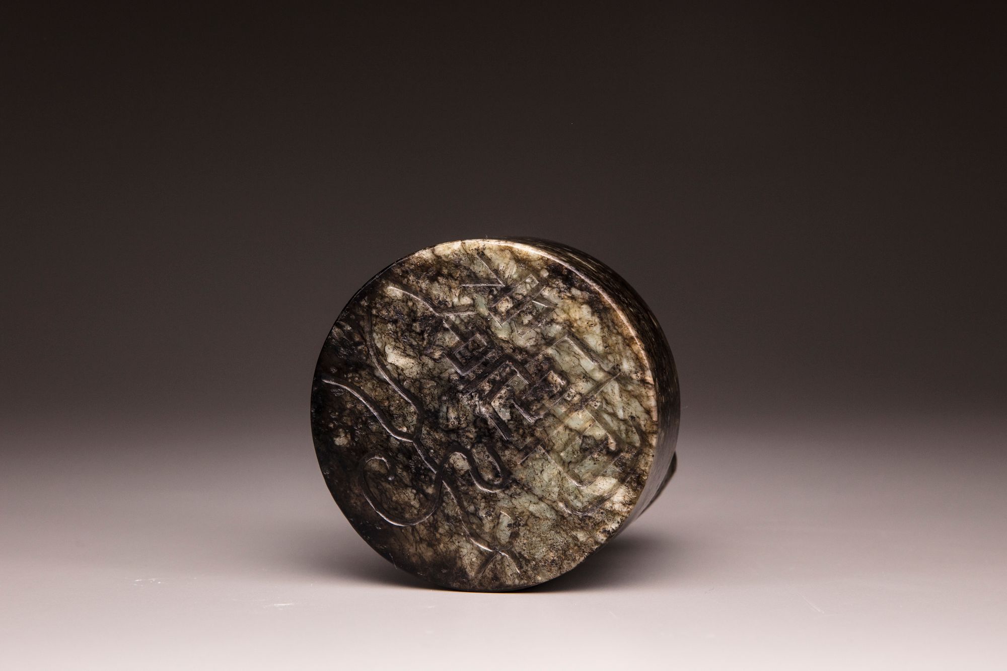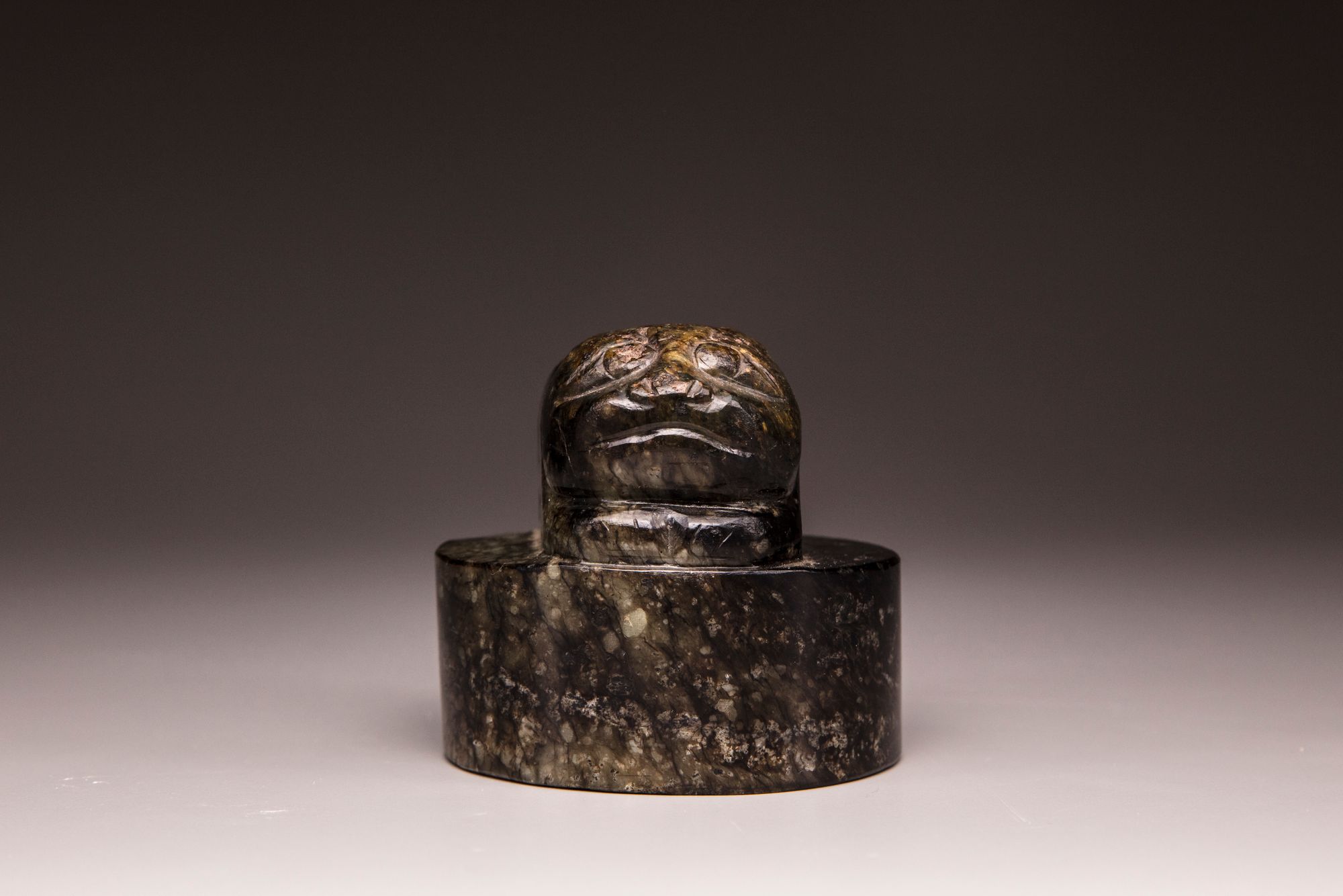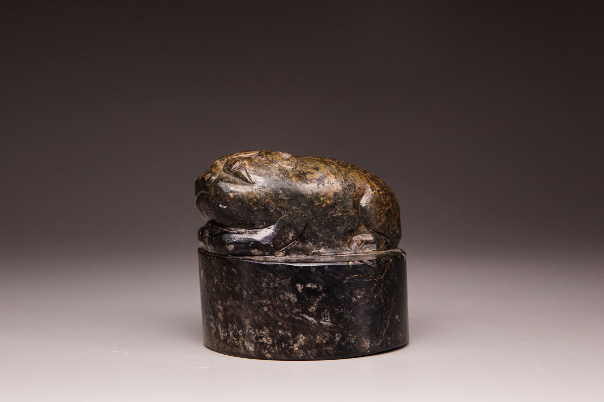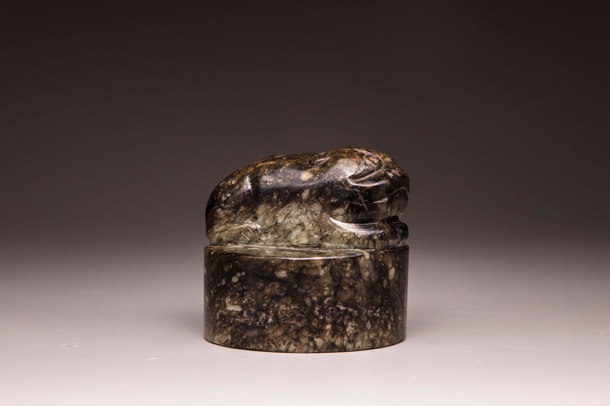 The cylindrical seal is surmounted by a crouching mythical beast. The seal face is carved in itaglio with four characters in archaic script reading 'chang yi zi sun', which may be translated as 'may your future generations benefit forever'.