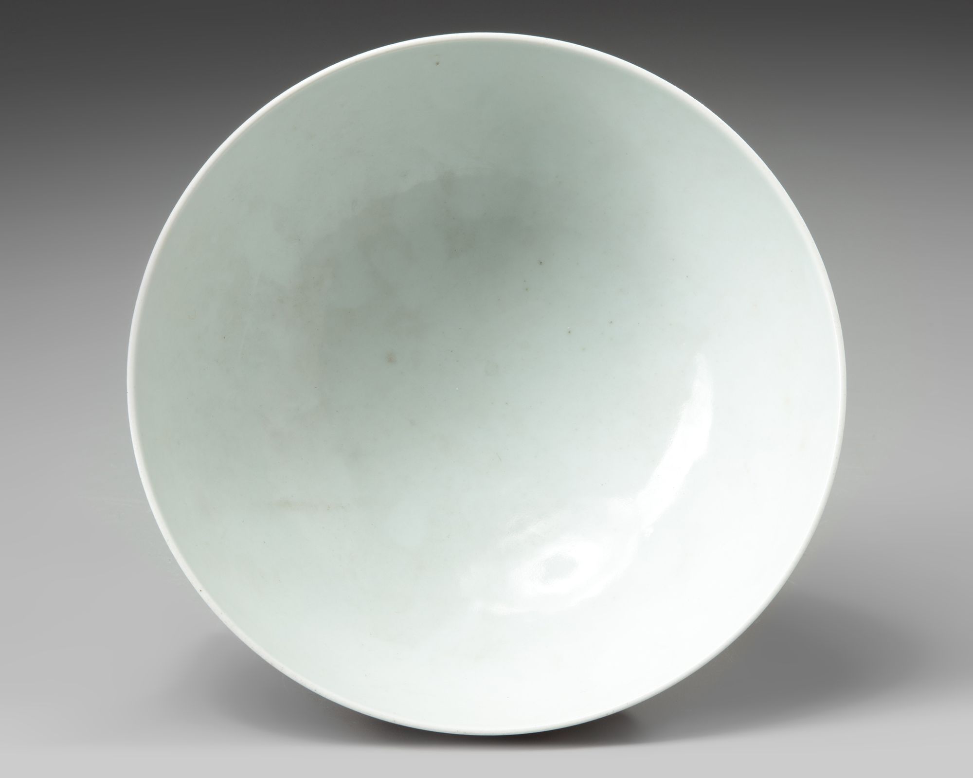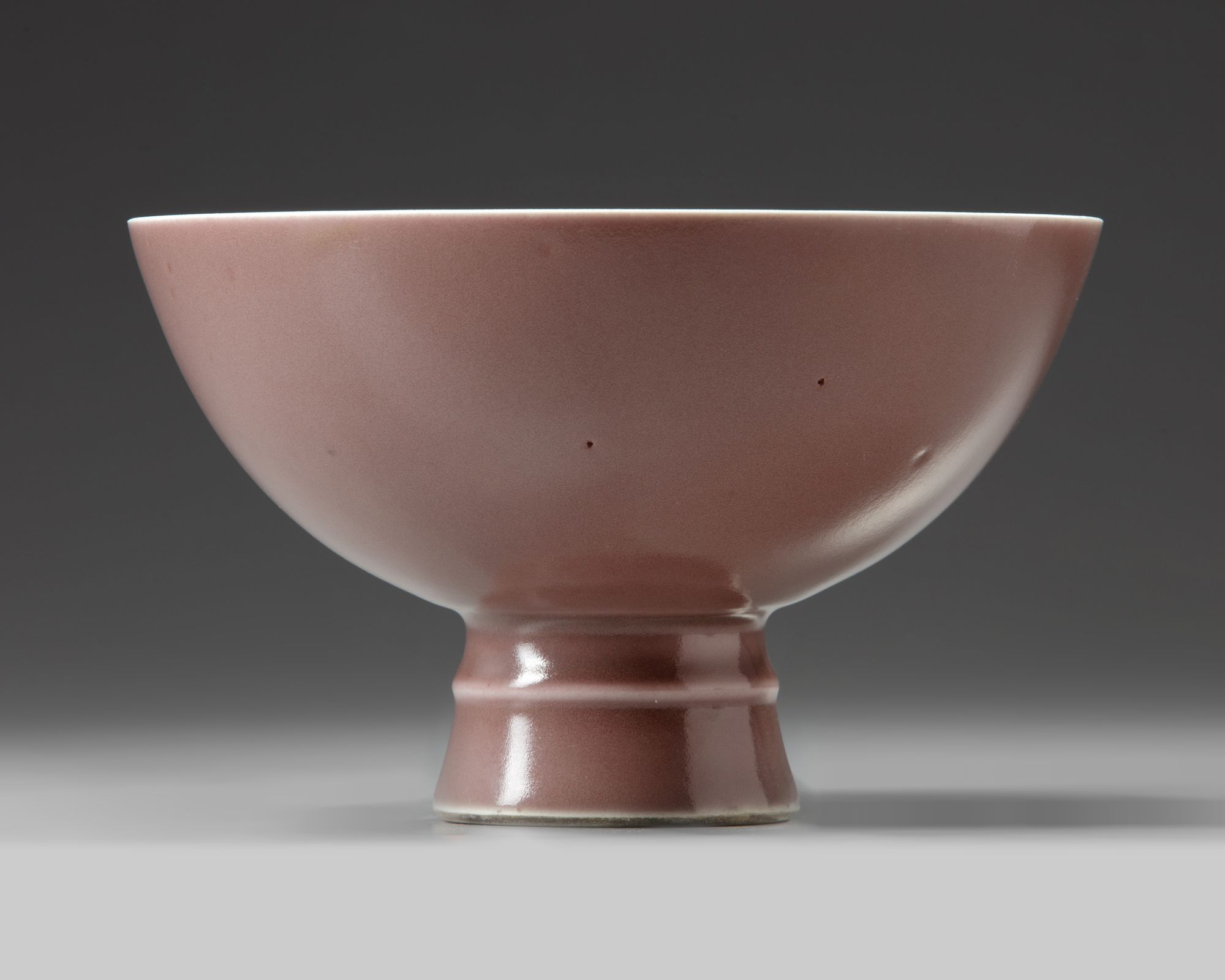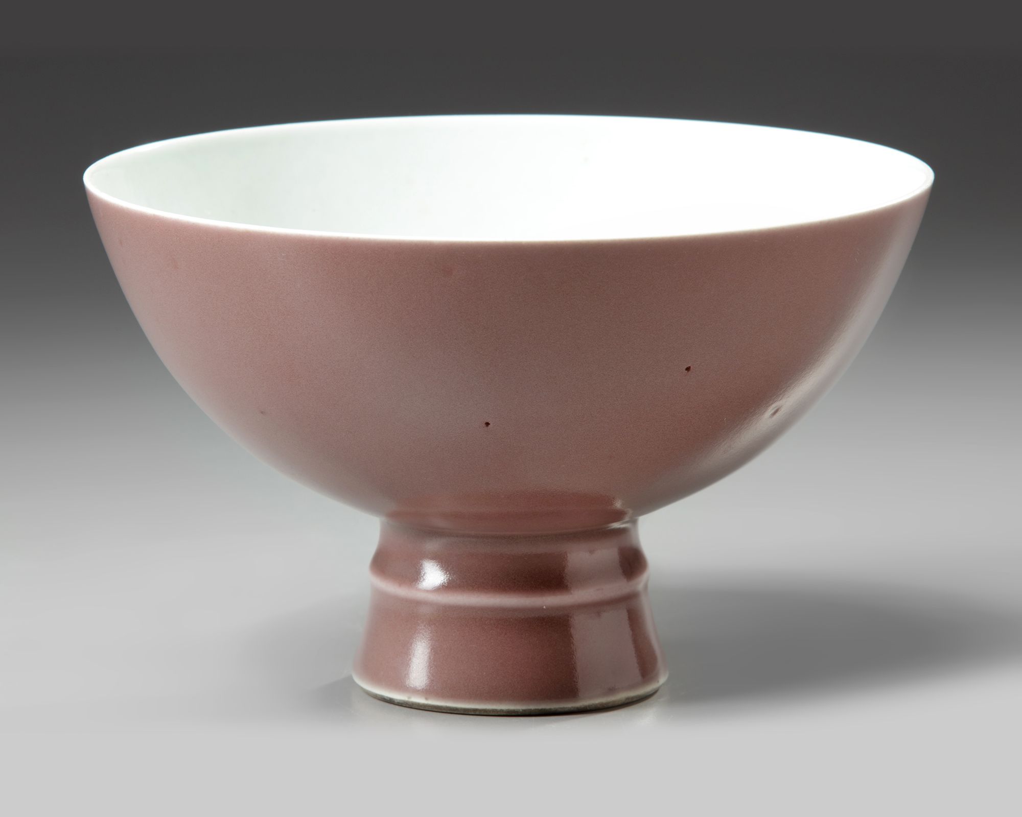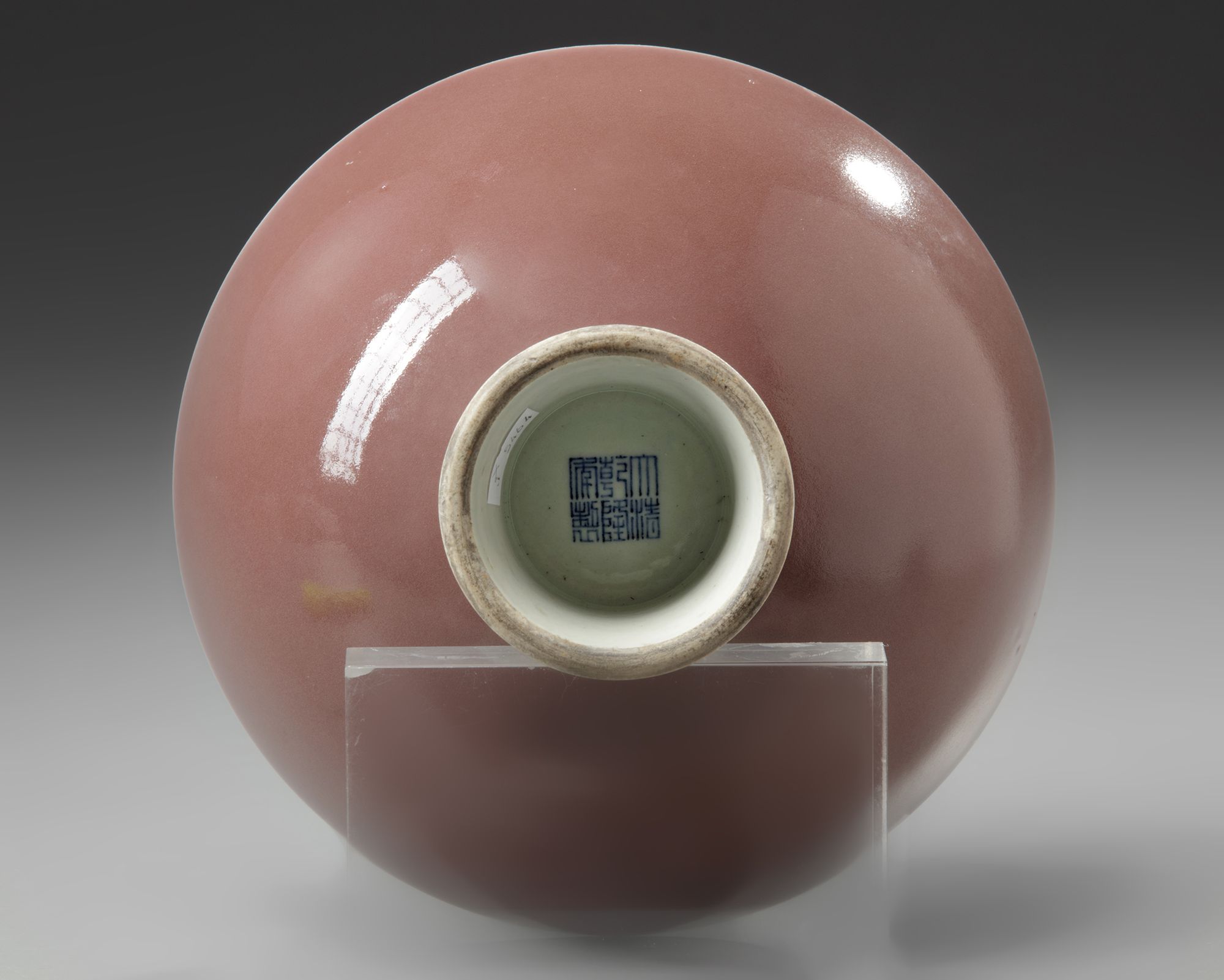 The stands on a slightly flared foot decorated with a single rib. The exterior is covered in a muted peach glaze. The interior and base are glazed white with an apocryphal Qianlong seal mark.