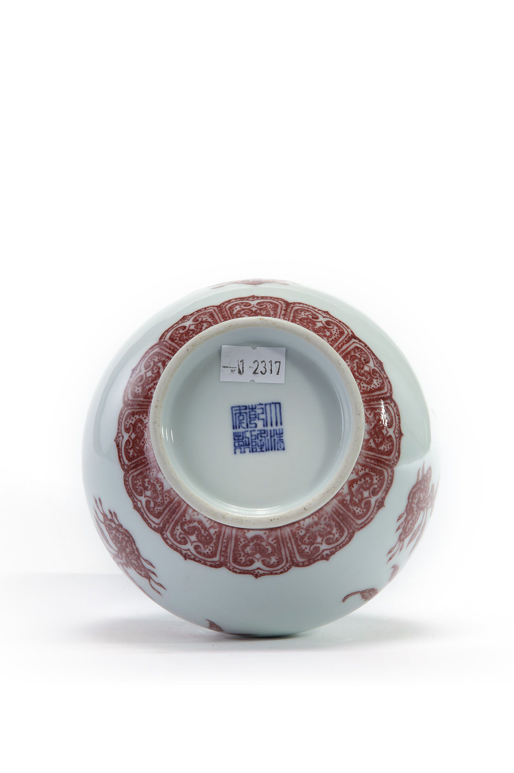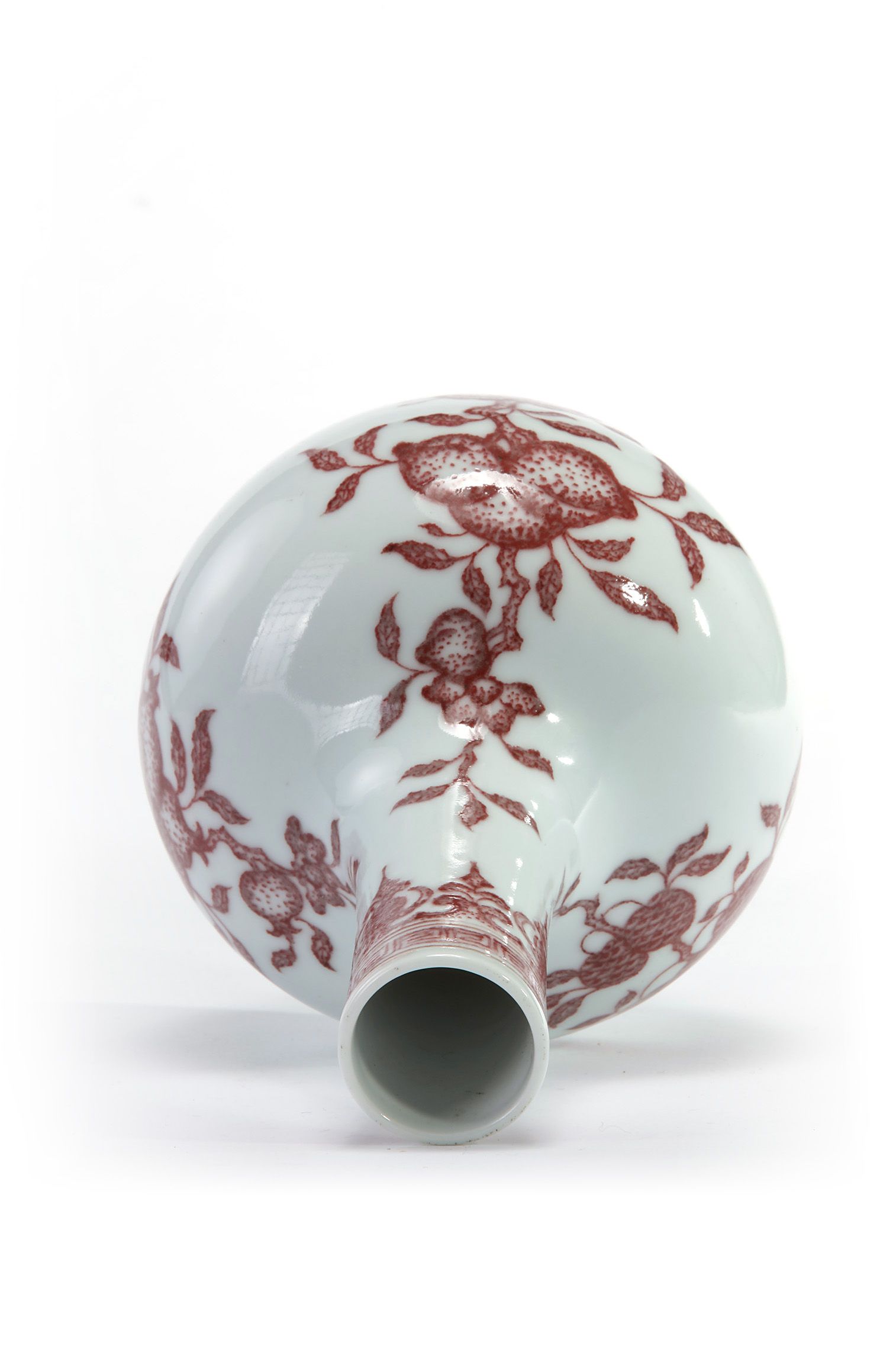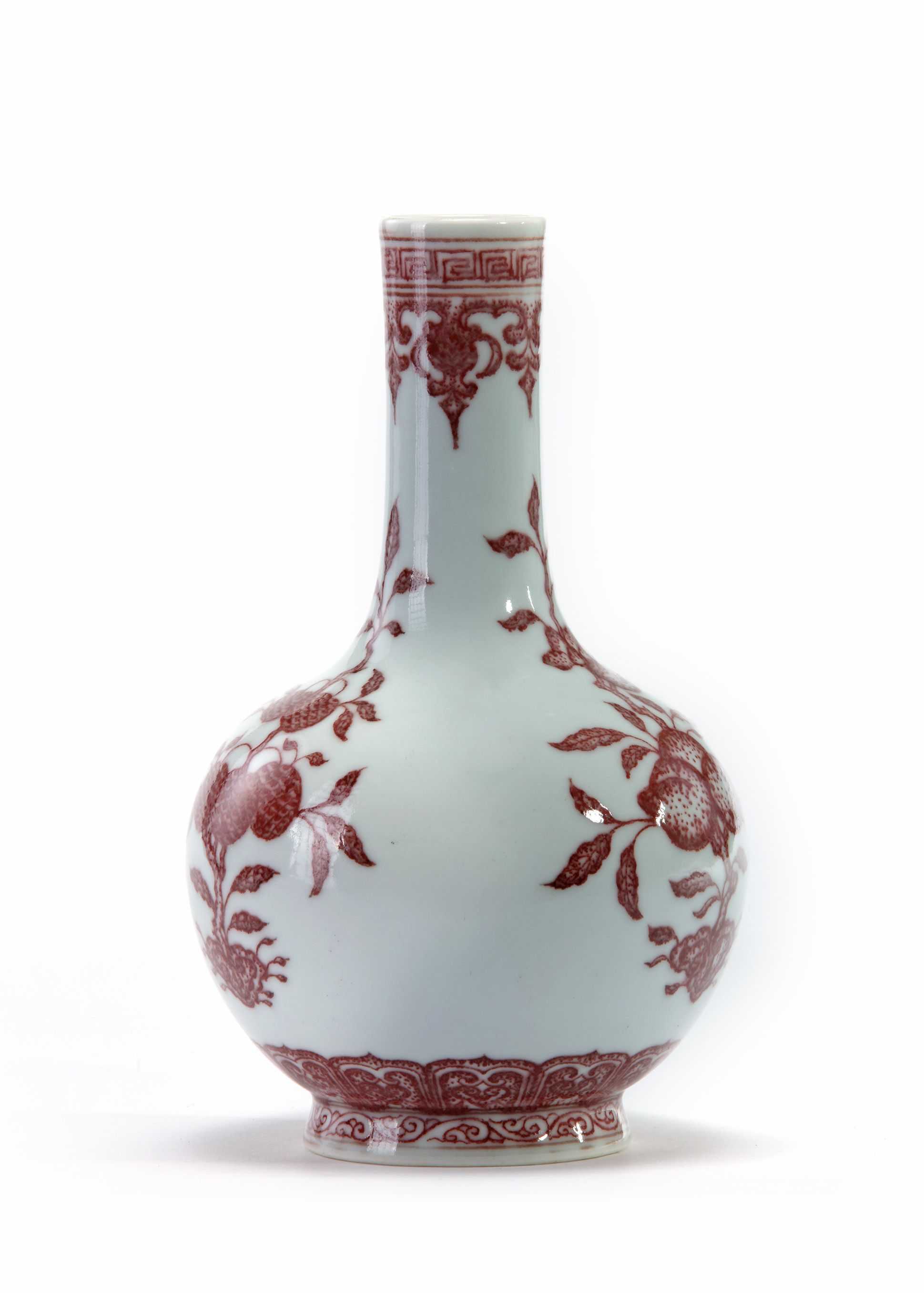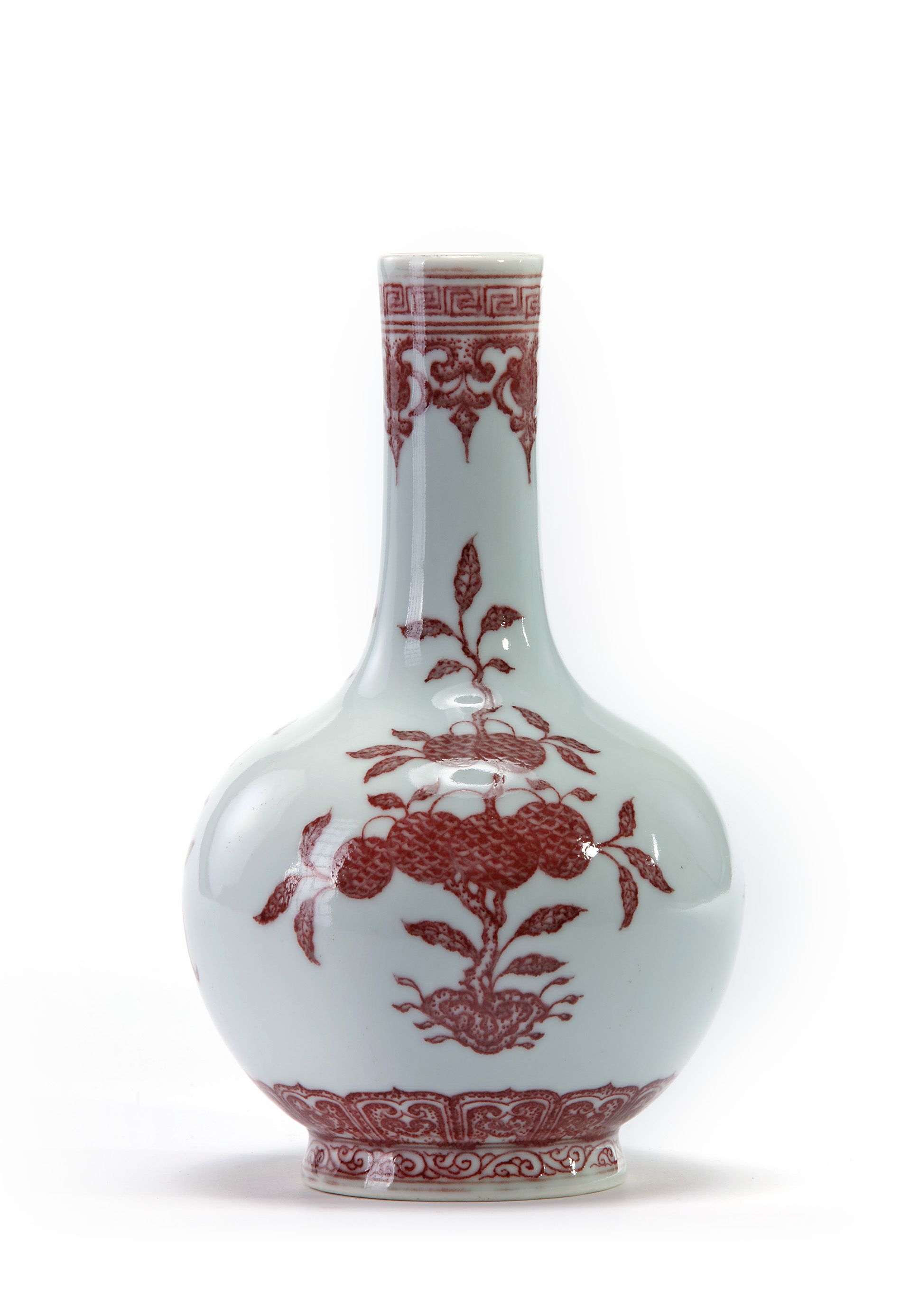 The vase is finely decorated with in copper red tones of the 'three abundances': peach, pomegranate and lychee, all above a band of lappets and a scroll band at the splayed foot. The base with an apocryphal Qianlong seal mark.