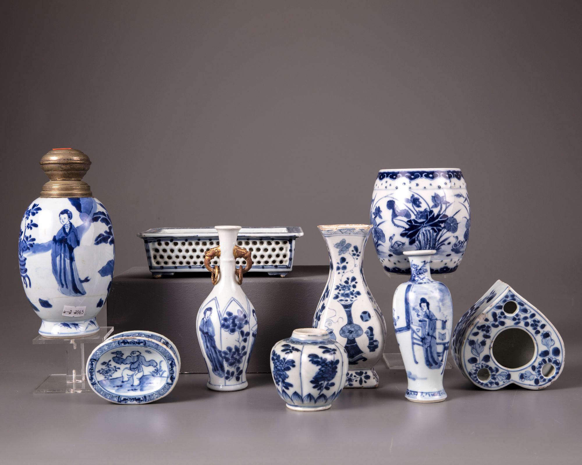A collection of Chinese blue and white consisting of 6 vases, an inkstand, a salt-tray and a bonsai-bowl.