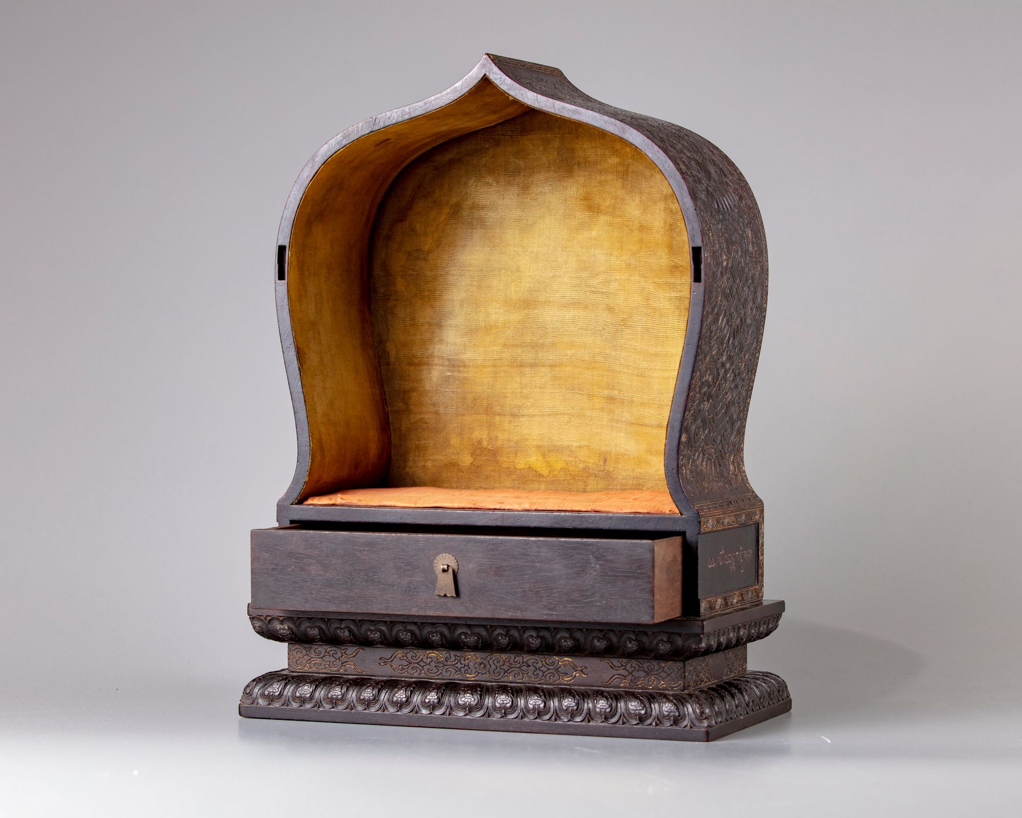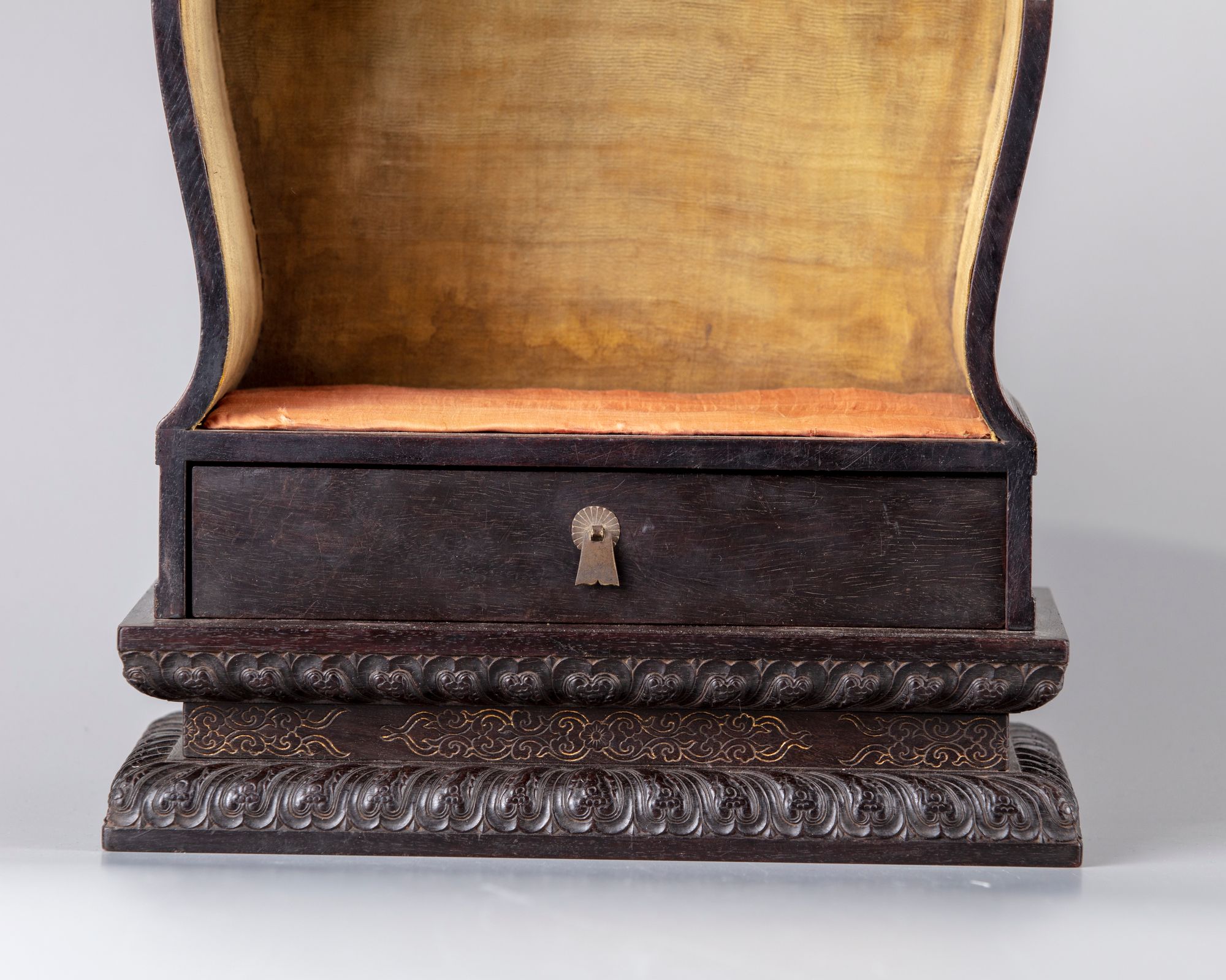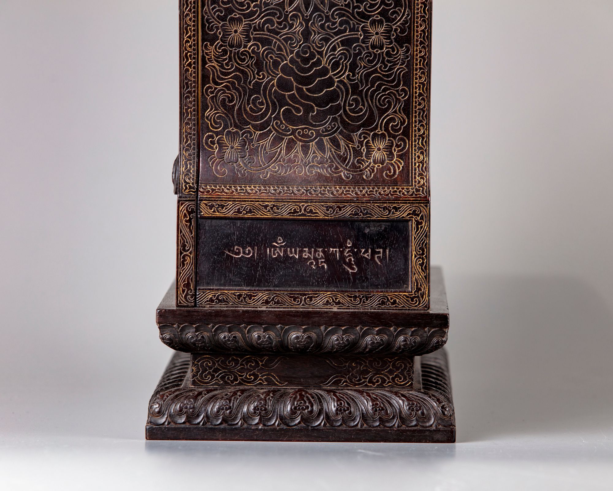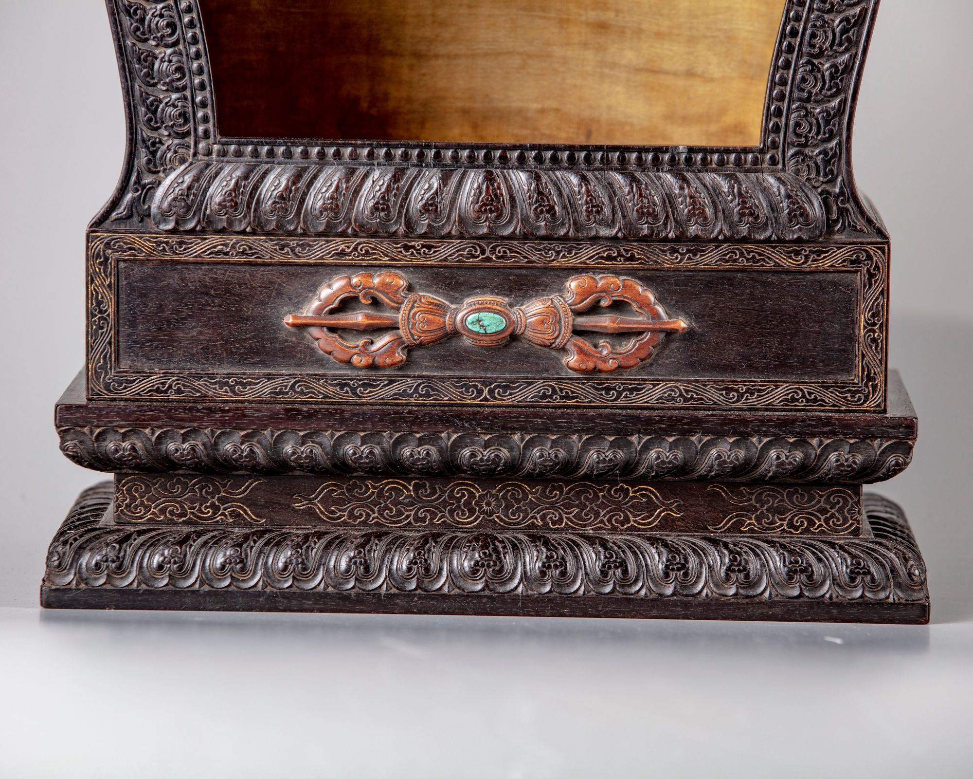 A zitan wood carved shrine, buddha house with an opening to the front side and a drawer, stylised with a wooden vajra filled with a turqouise inlay, Well carved to the sides with flower scrolls and foliage , the back side carved a Chinese calligraphy.