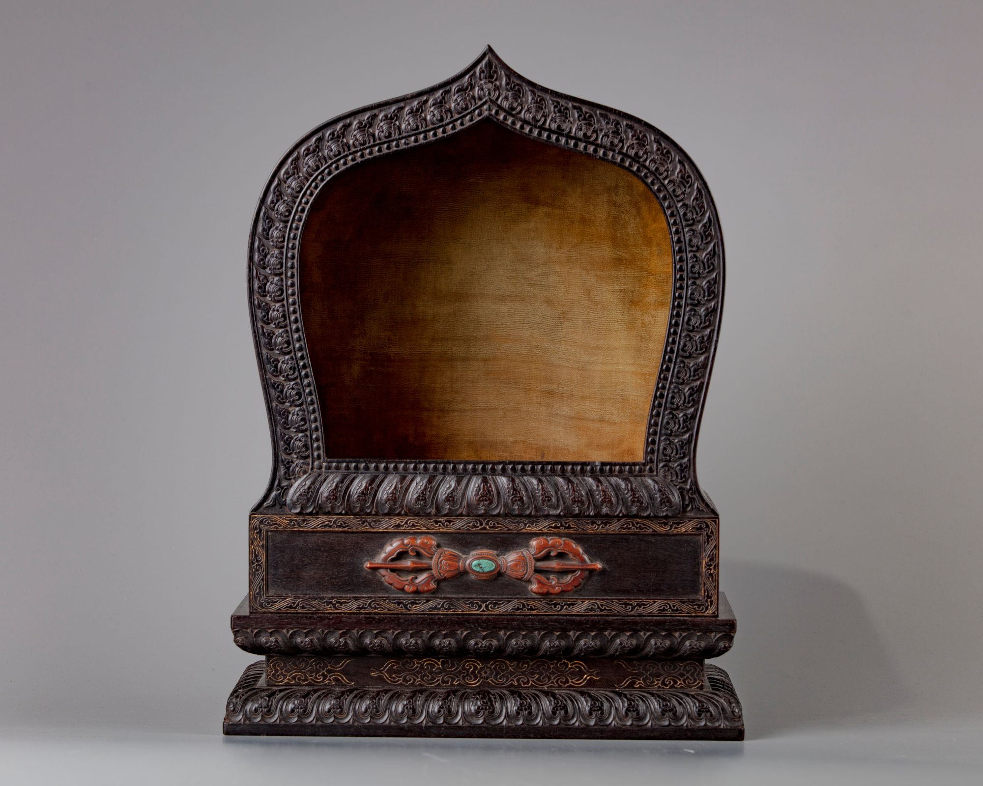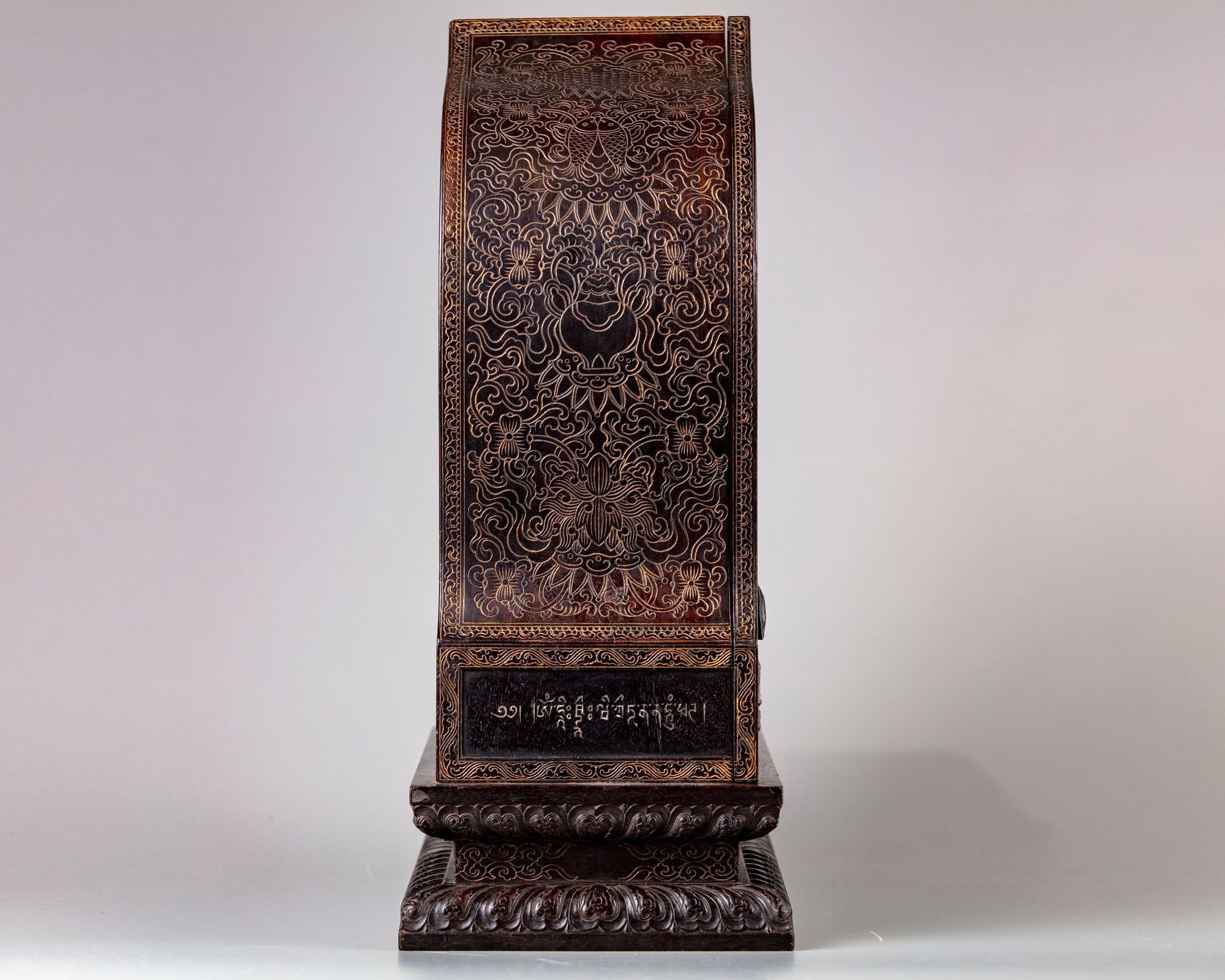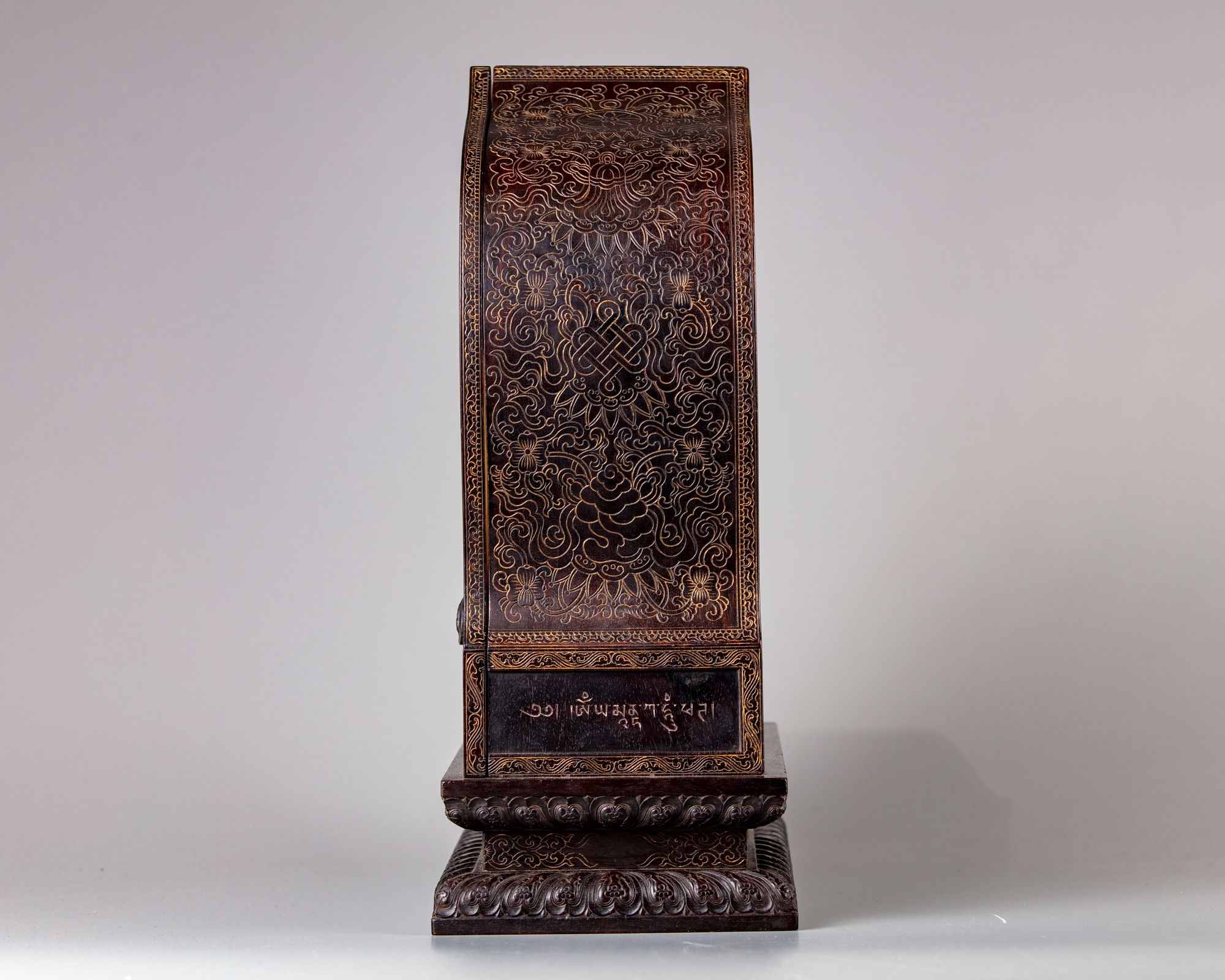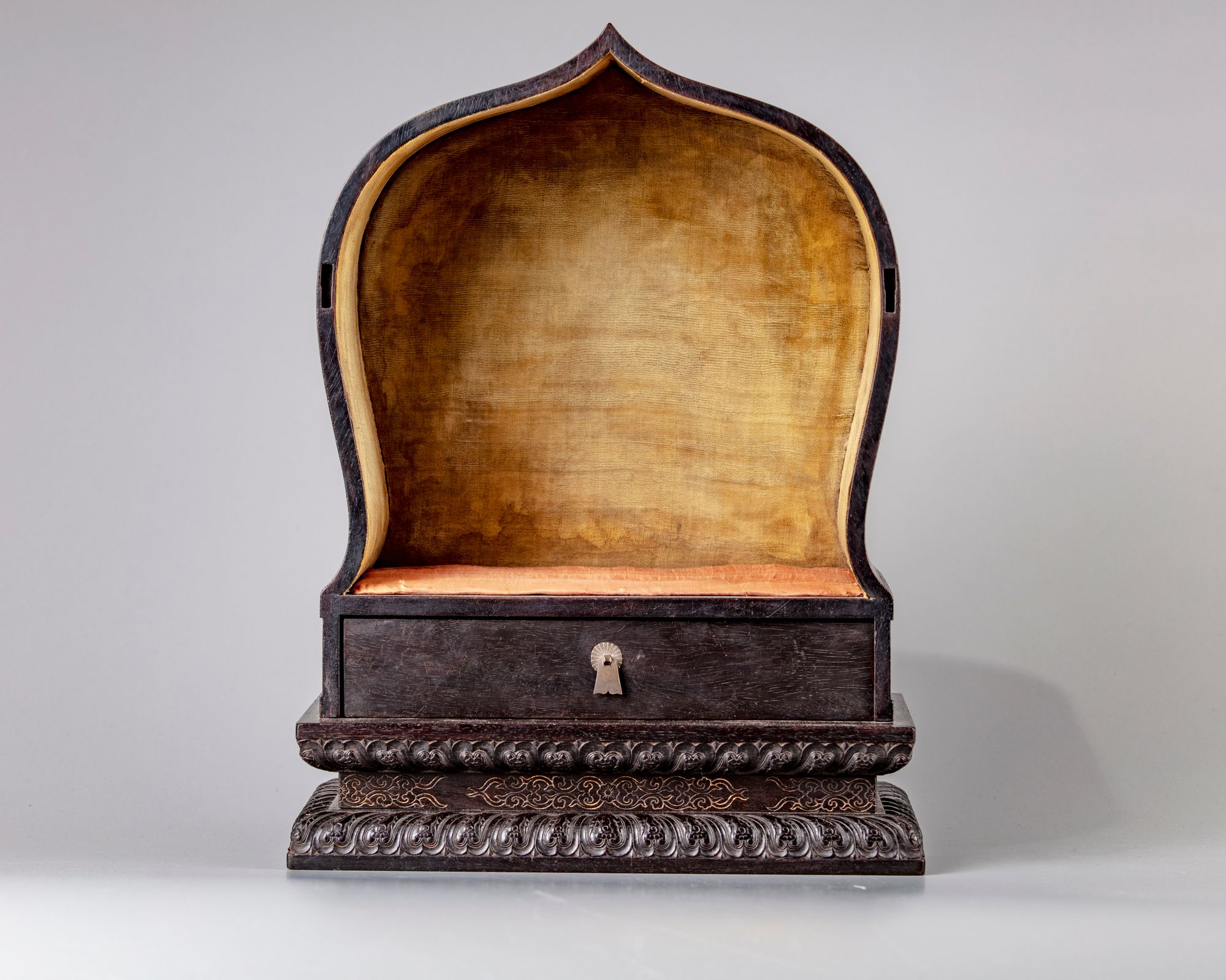 A zitan wood carved shrine, buddha house with an opening to the front side and a drawer, stylised with a wooden vajra filled with a turqouise inlay, Well carved to the sides with flower scrolls and foliage , the back side carved a Chinese calligraphy.