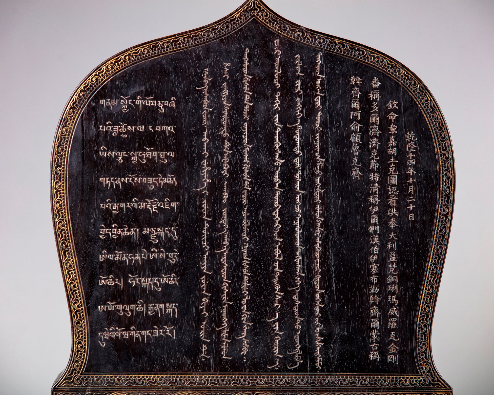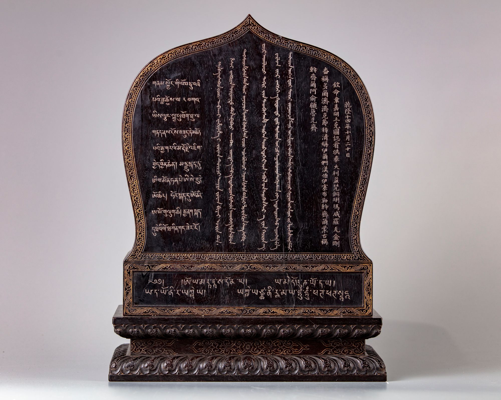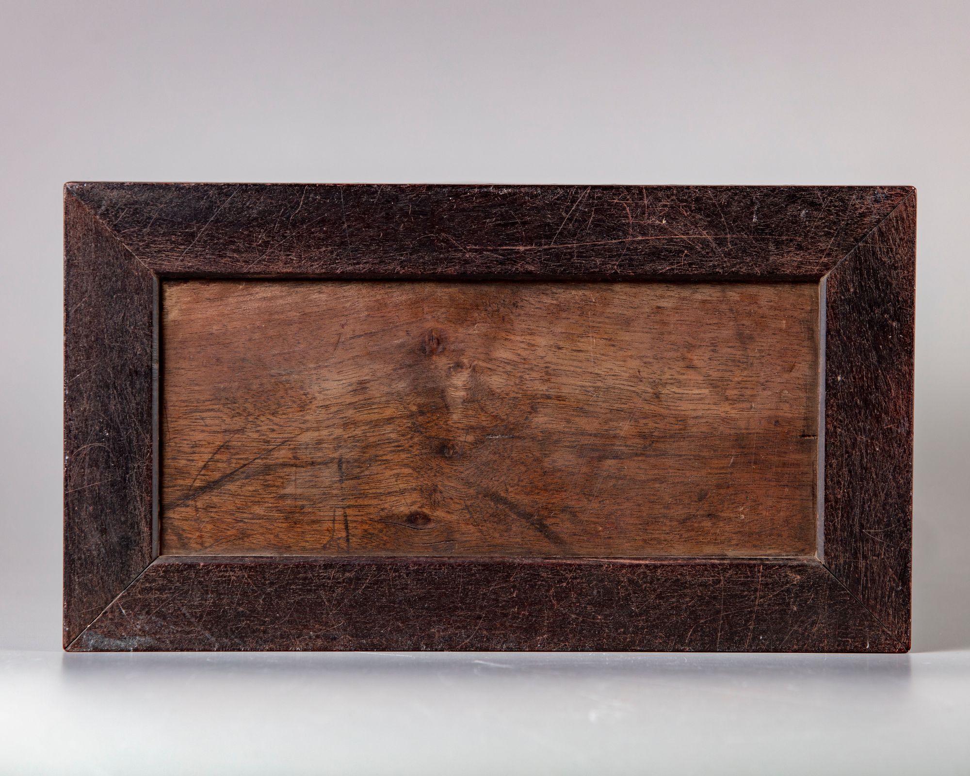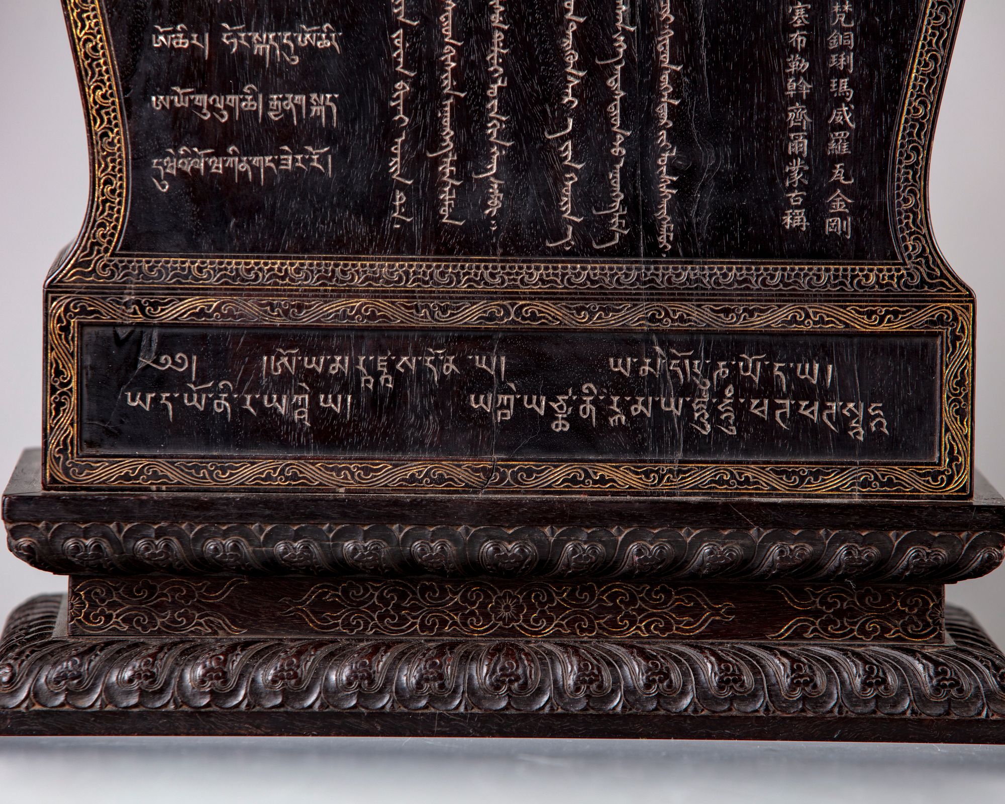 A zitan wood carved shrine, buddha house with an opening to the front side and a drawer, stylised with a wooden vajra filled with a turqouise inlay, Well carved to the sides with flower scrolls and foliage , the back side carved a Chinese calligraphy.