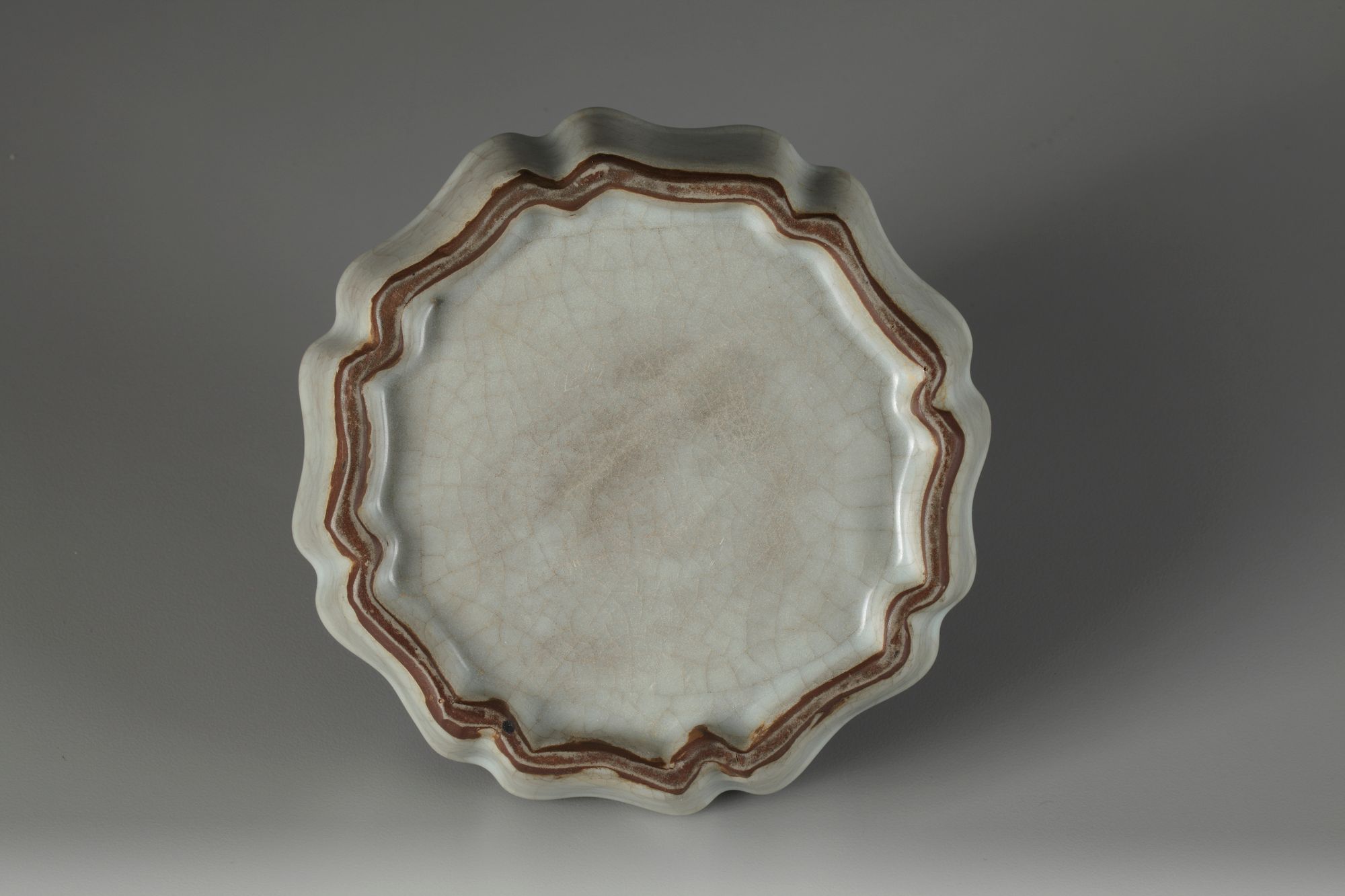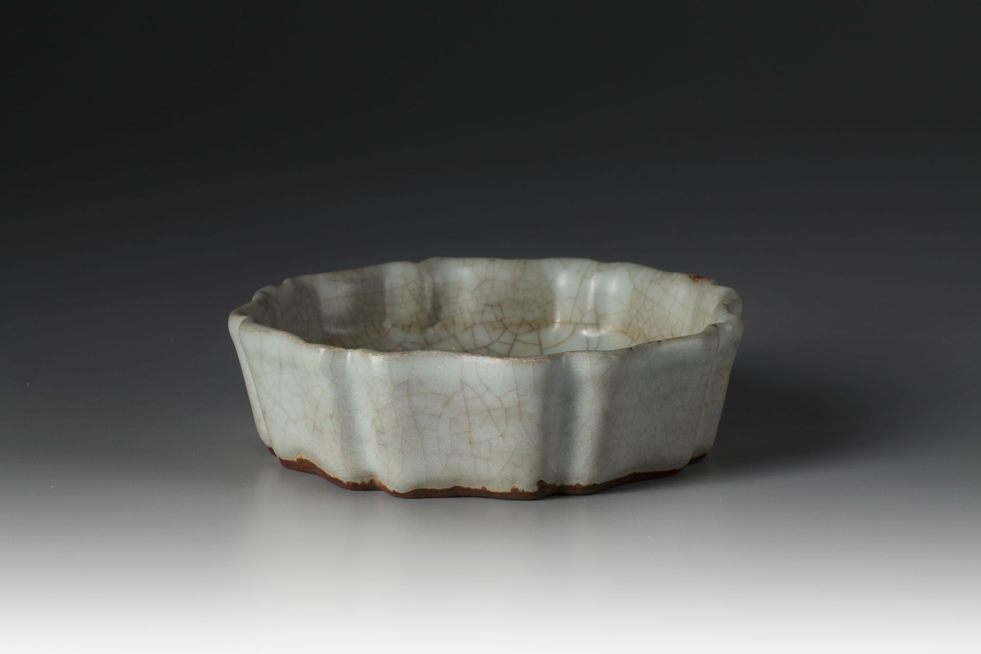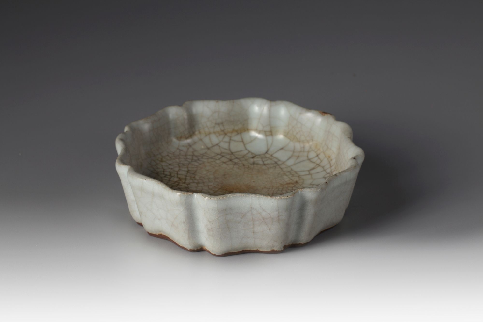 Bowl with eight-lobed sides, grayish glaze and iron colored crackle.