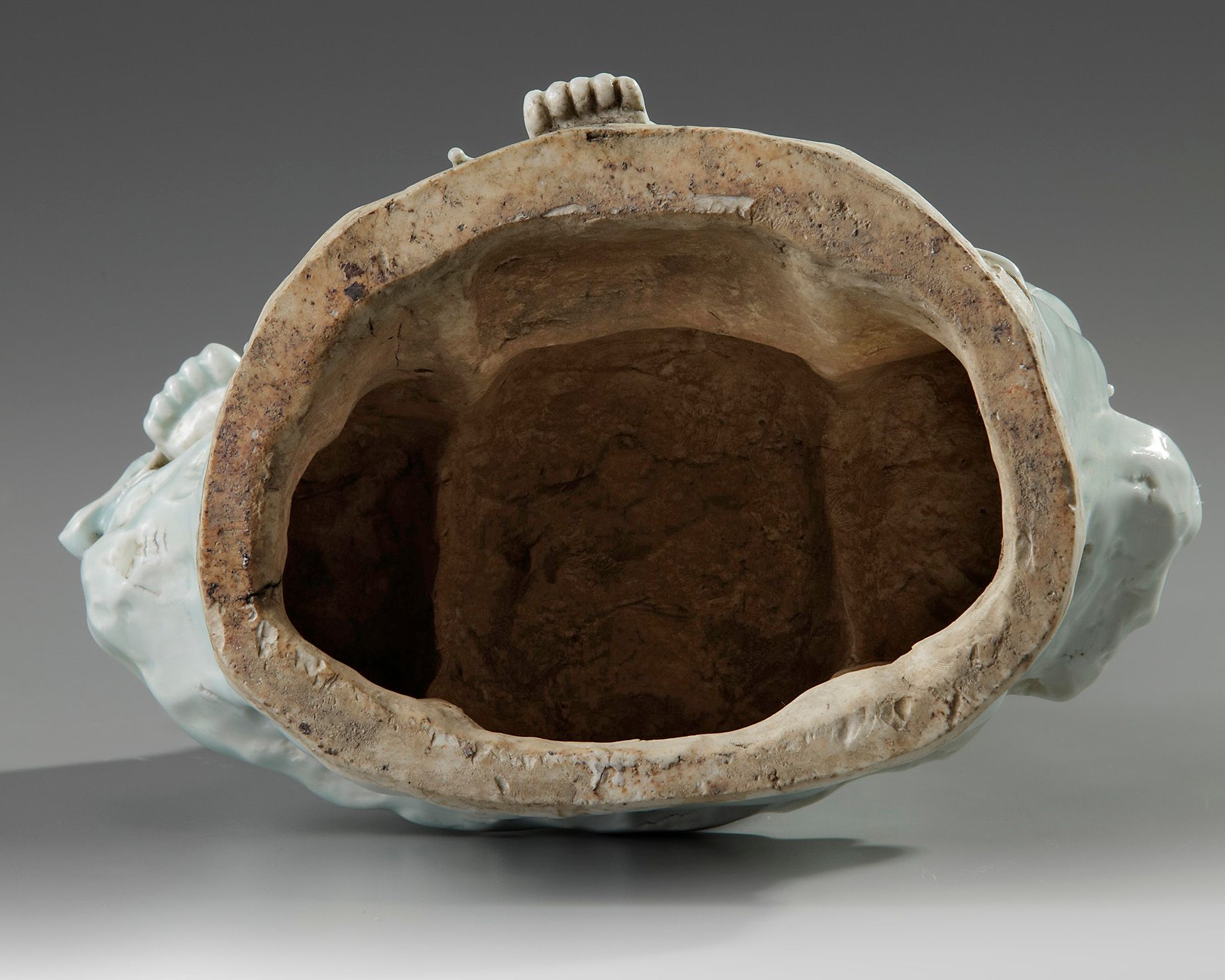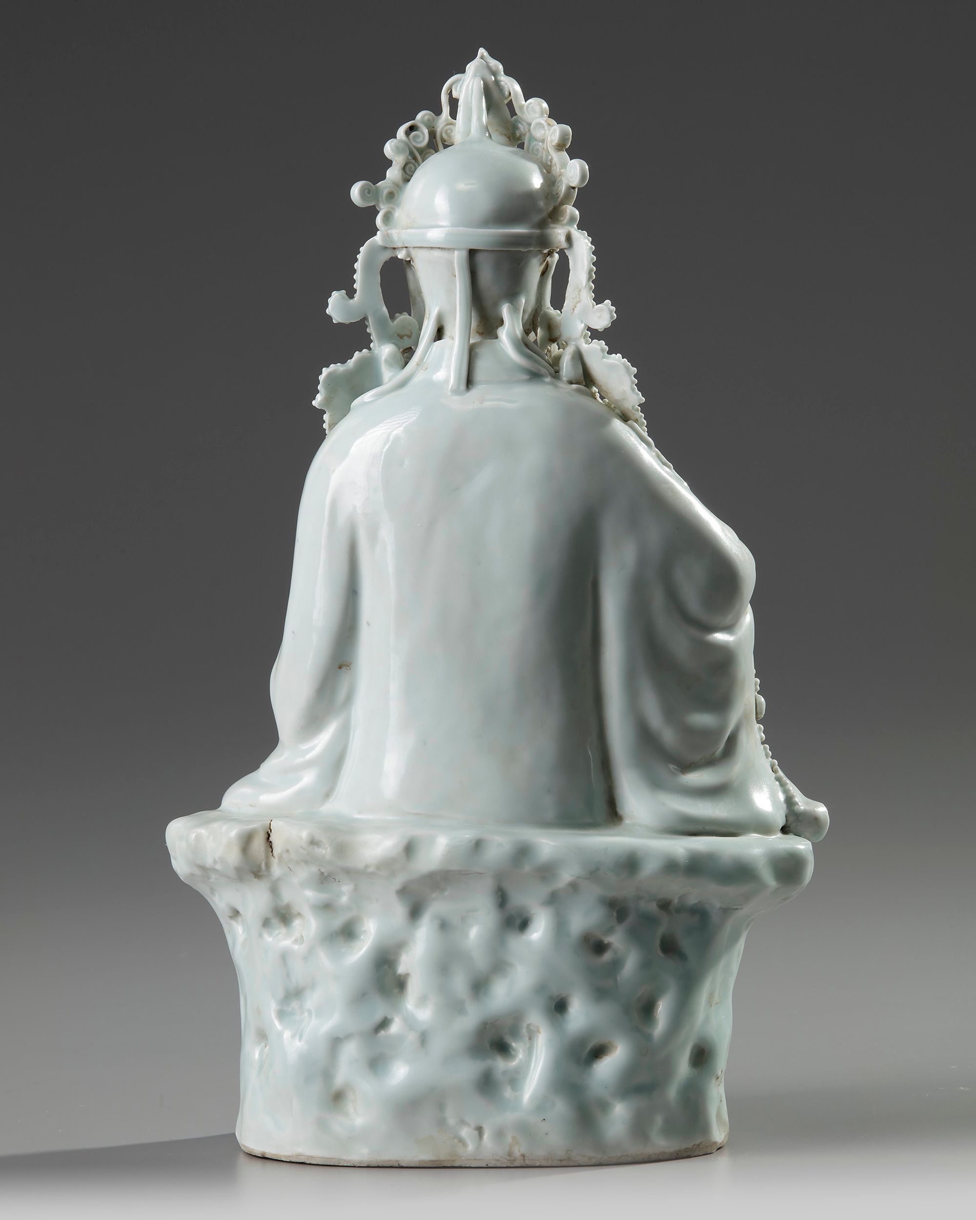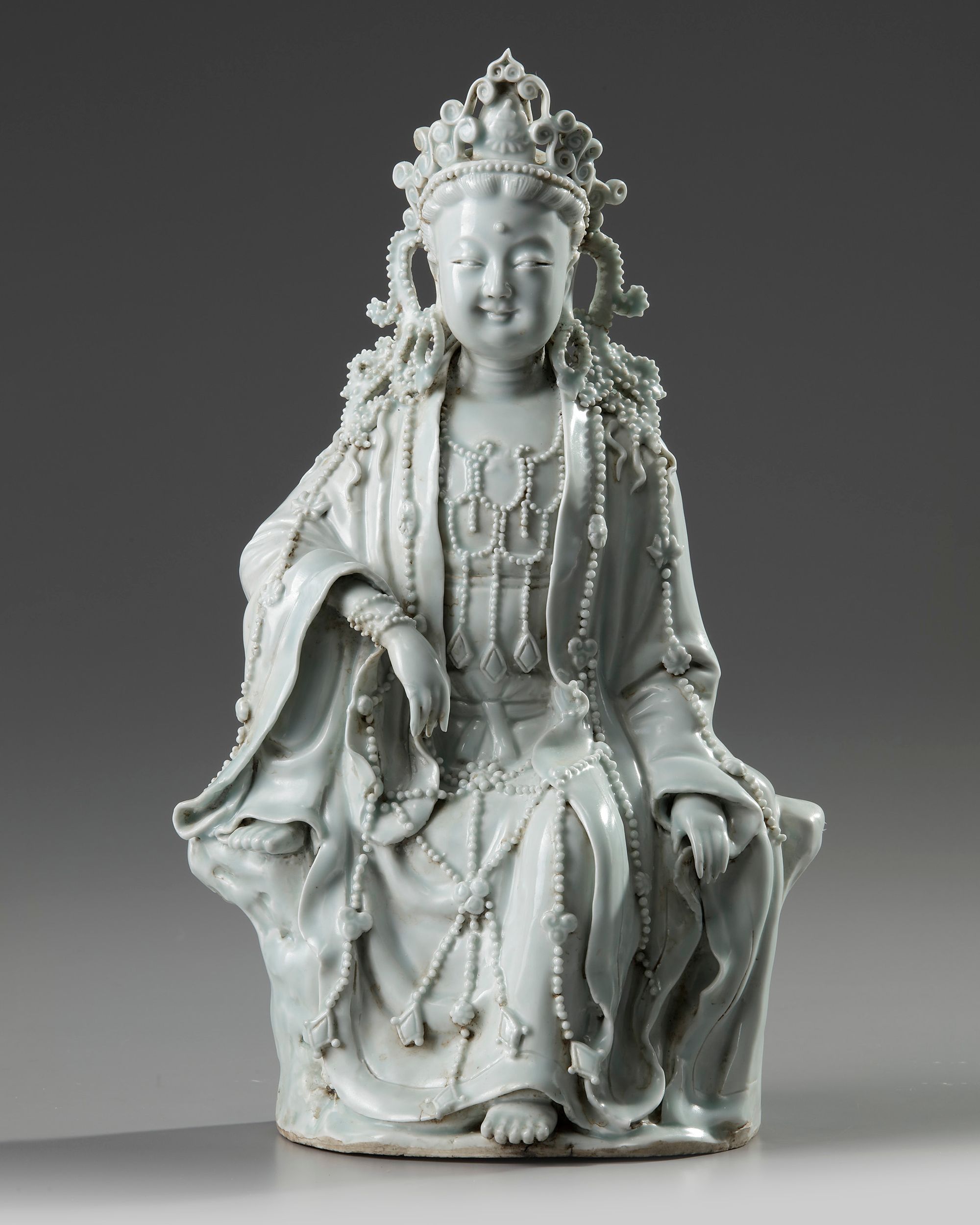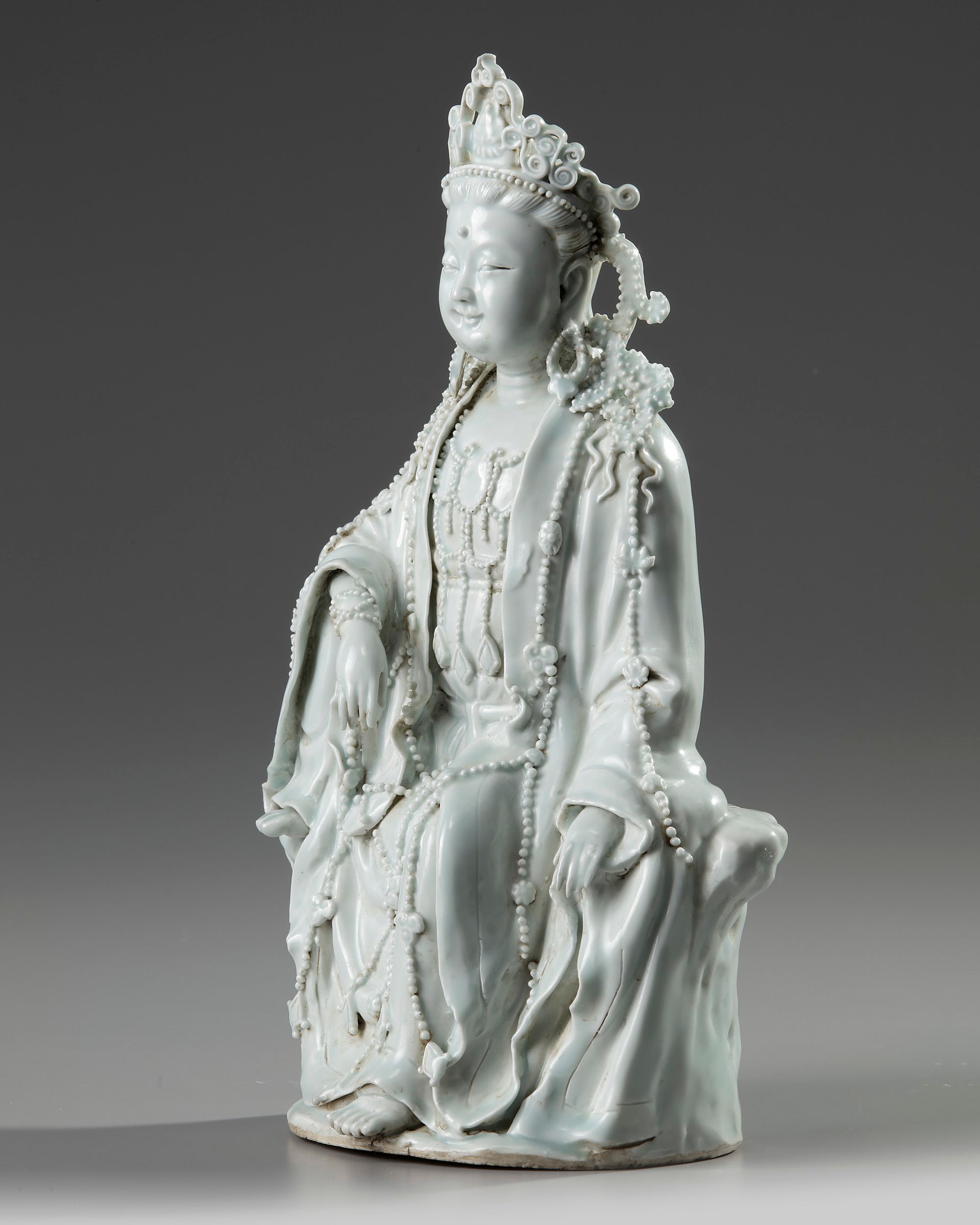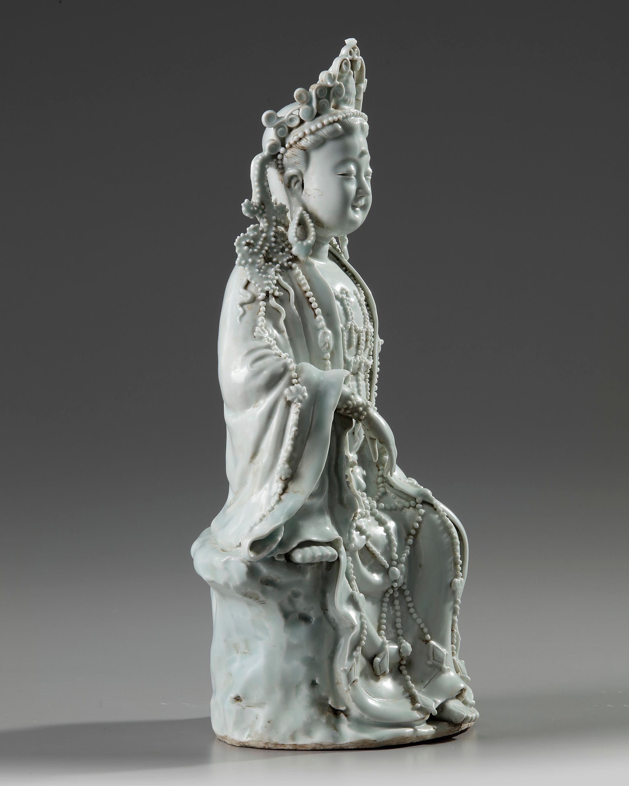 The smiling figure is modelled wearing an elaborate beaded crown, she wears long robes and jewellery which is decorated with further beads. She is seated with one foot up, and the other resting on the rocky base.