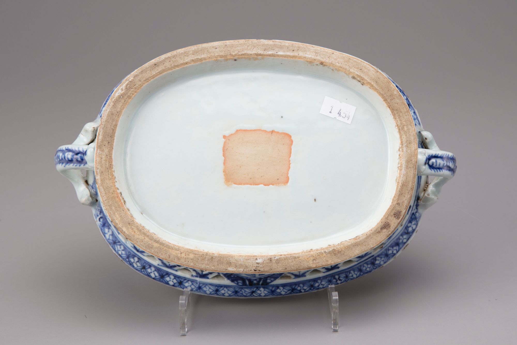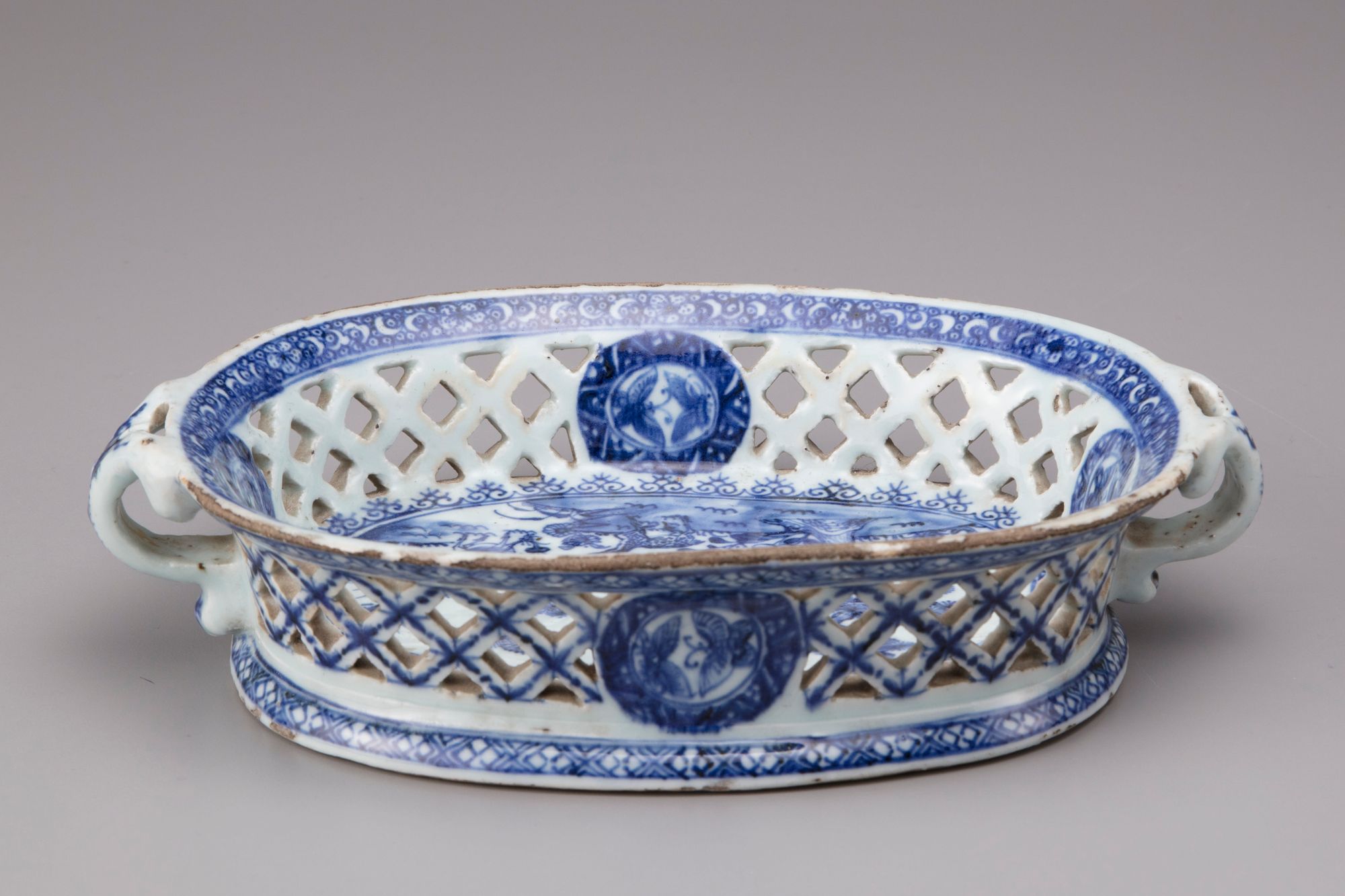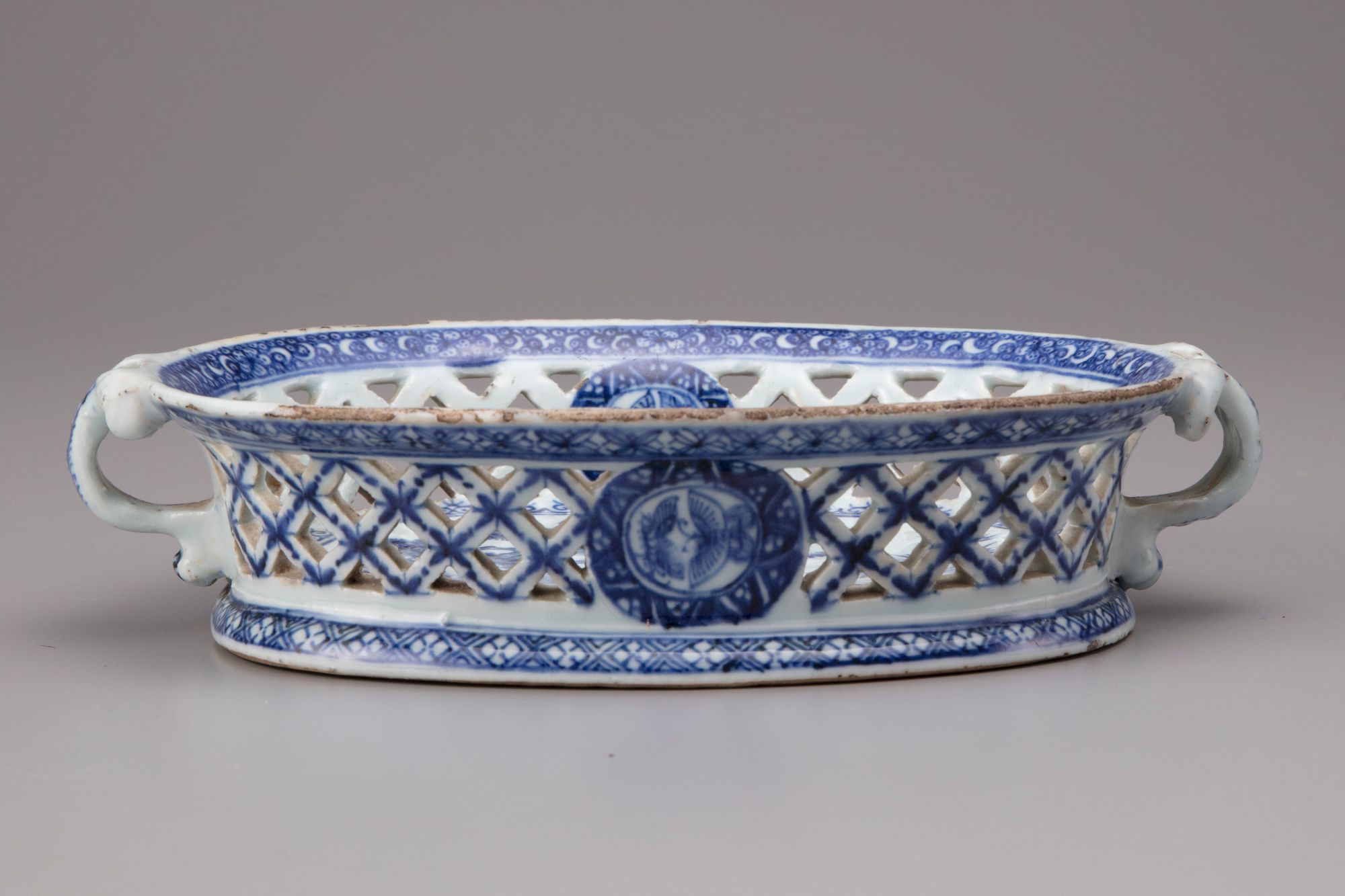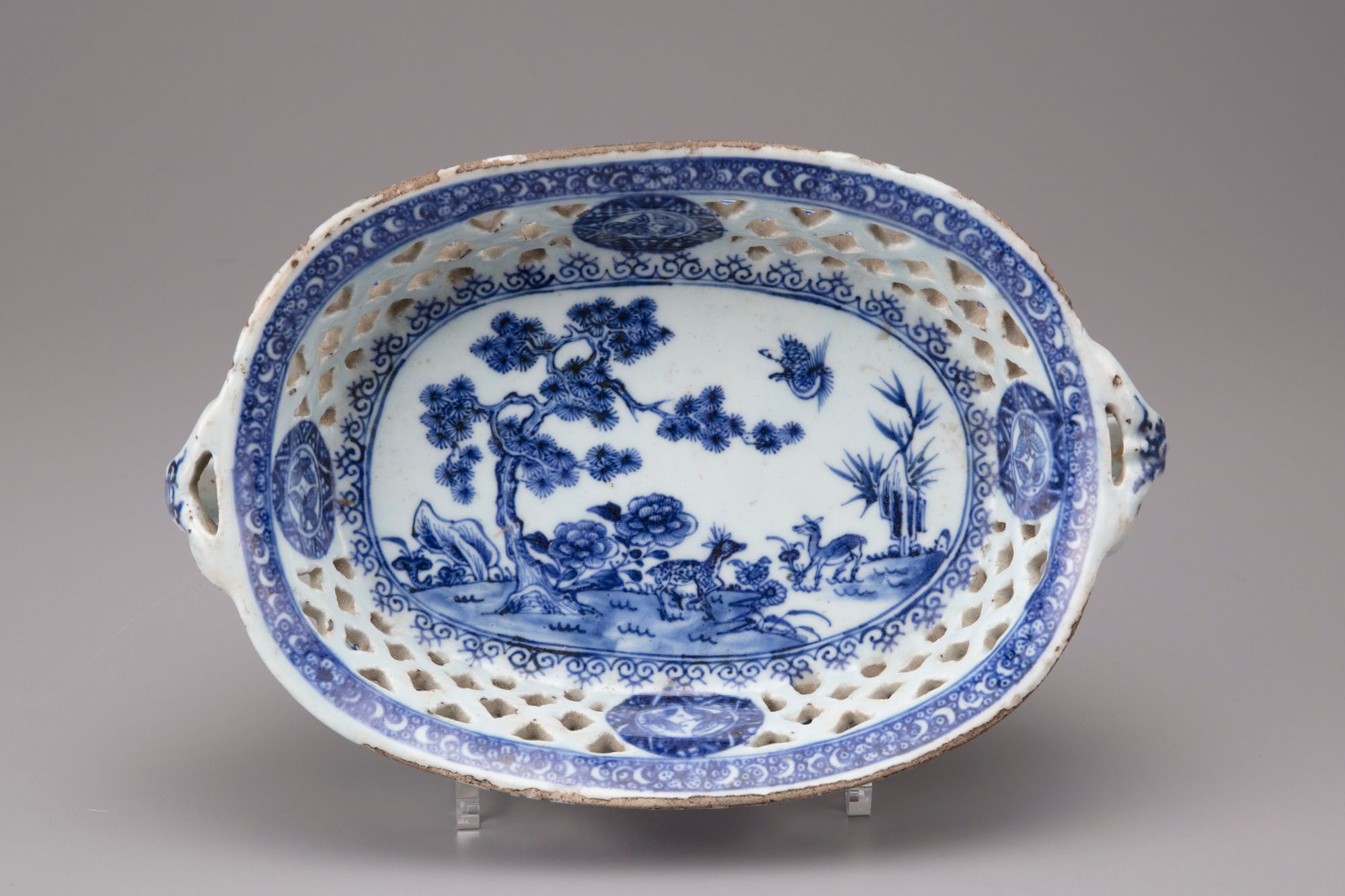 Pierced porcelain basket for serving hot chestnuts. decorated in underglaze cobalt-blue with a landscape scene with dear and a flying crane, the sides decorated with butterfly medallions.