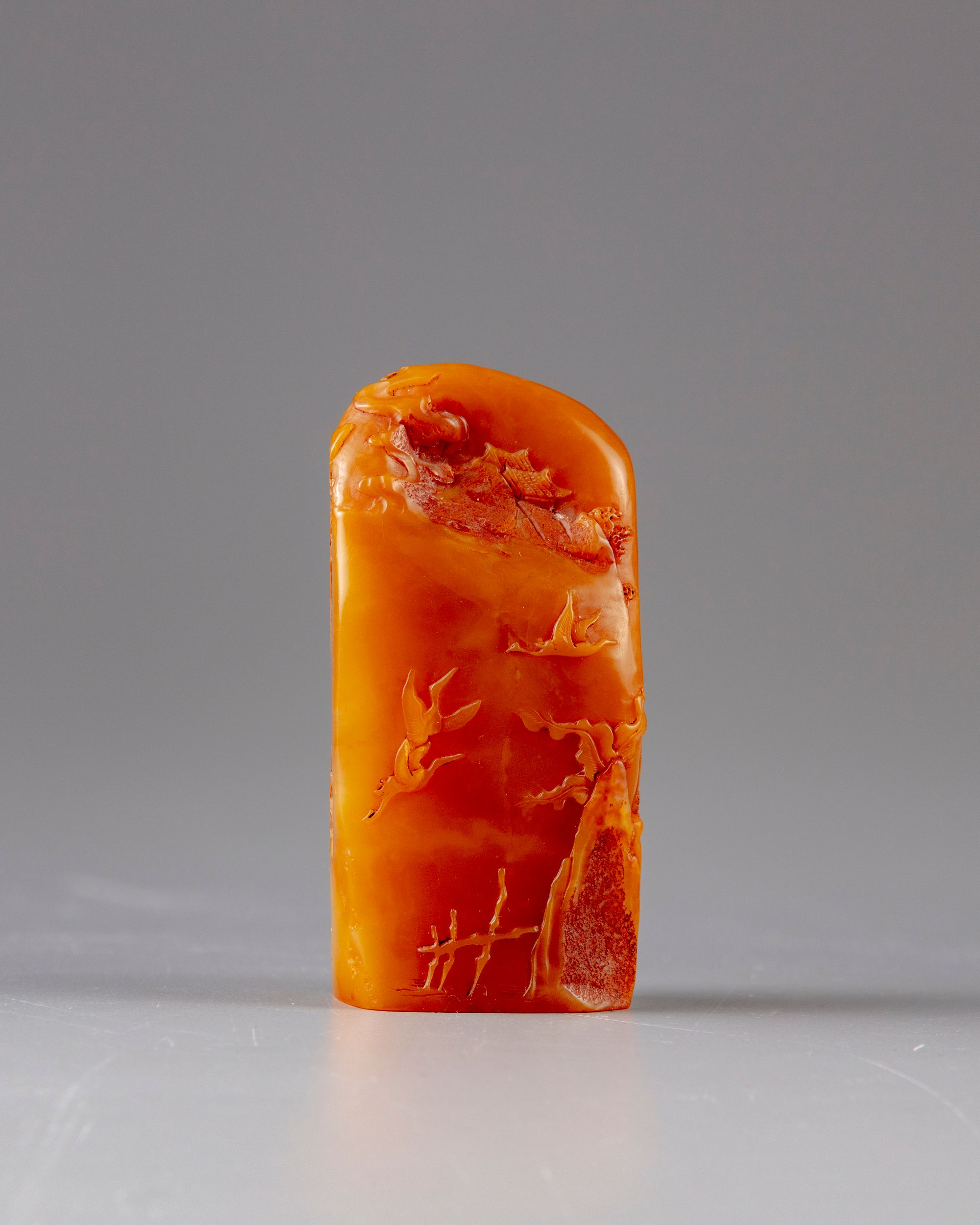 The rectangular seal if of soapstone and elegantly carved with two figures in a small boat beside a tree with an inscription indicating the carver’s name.