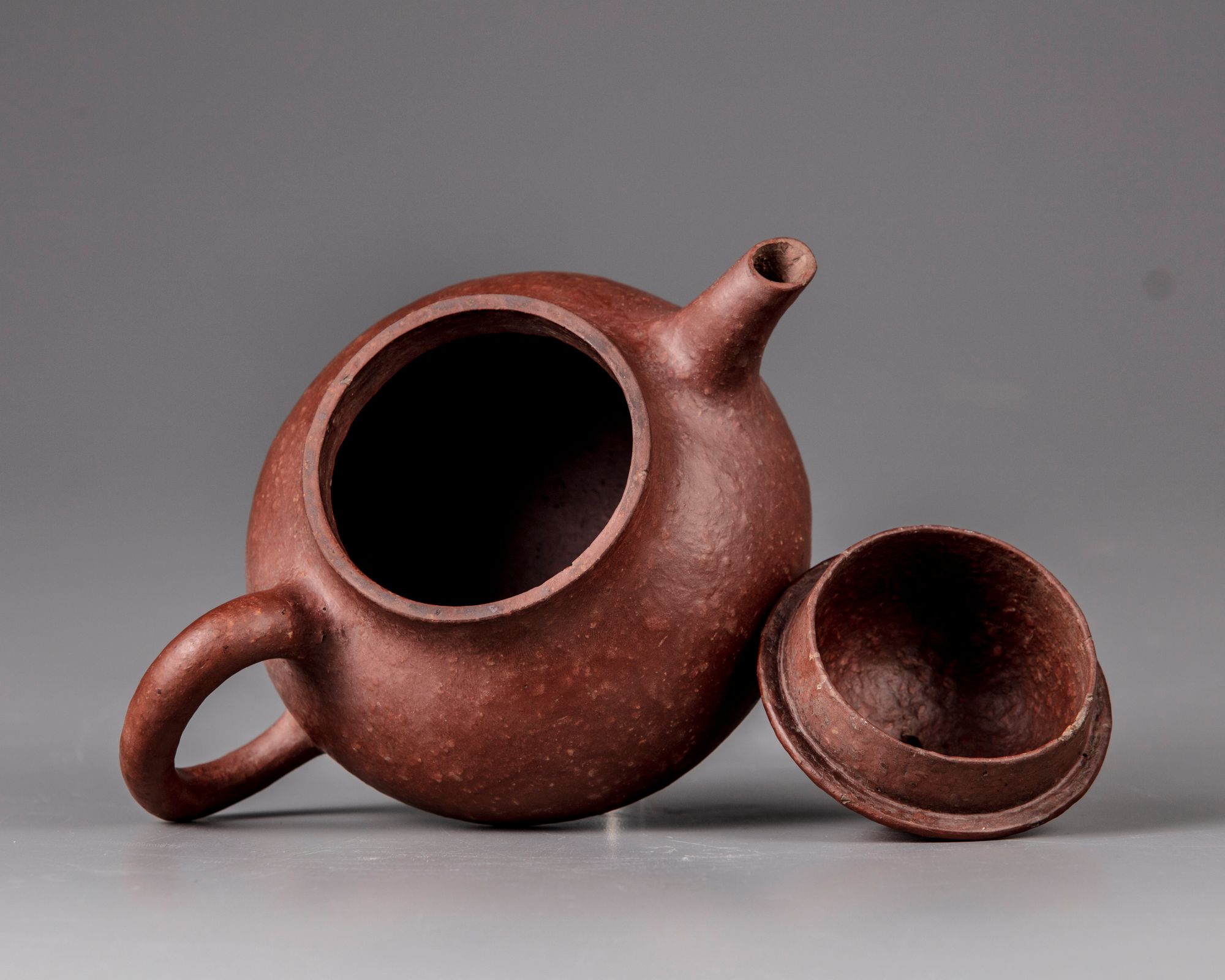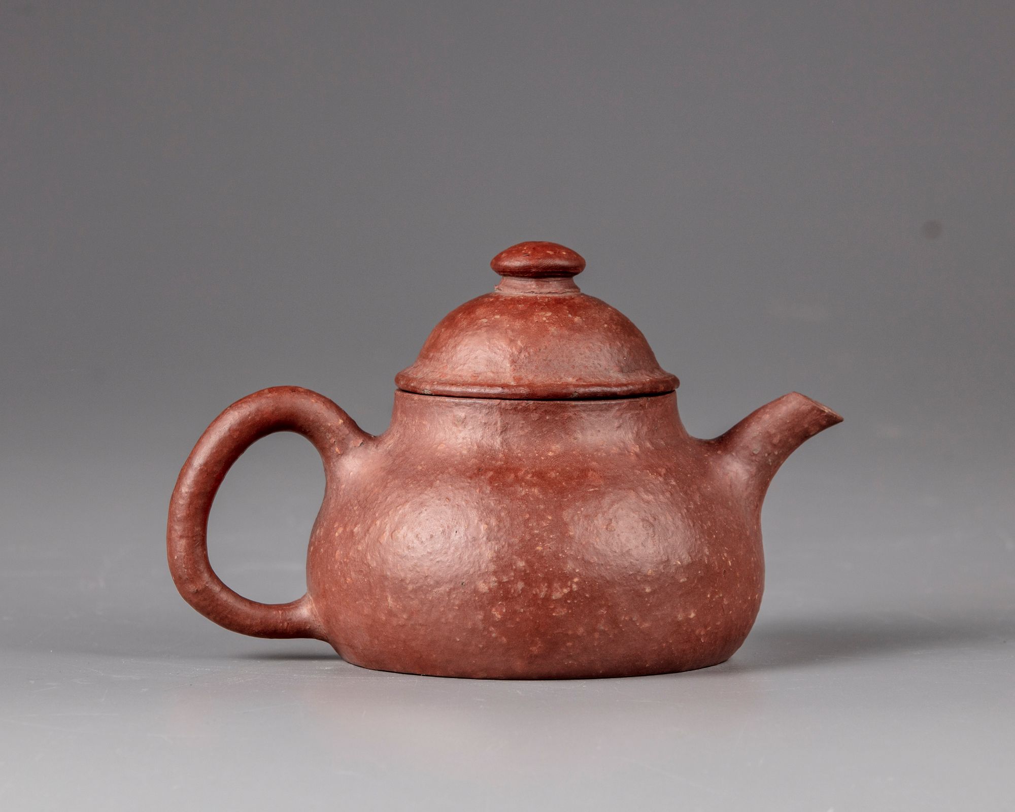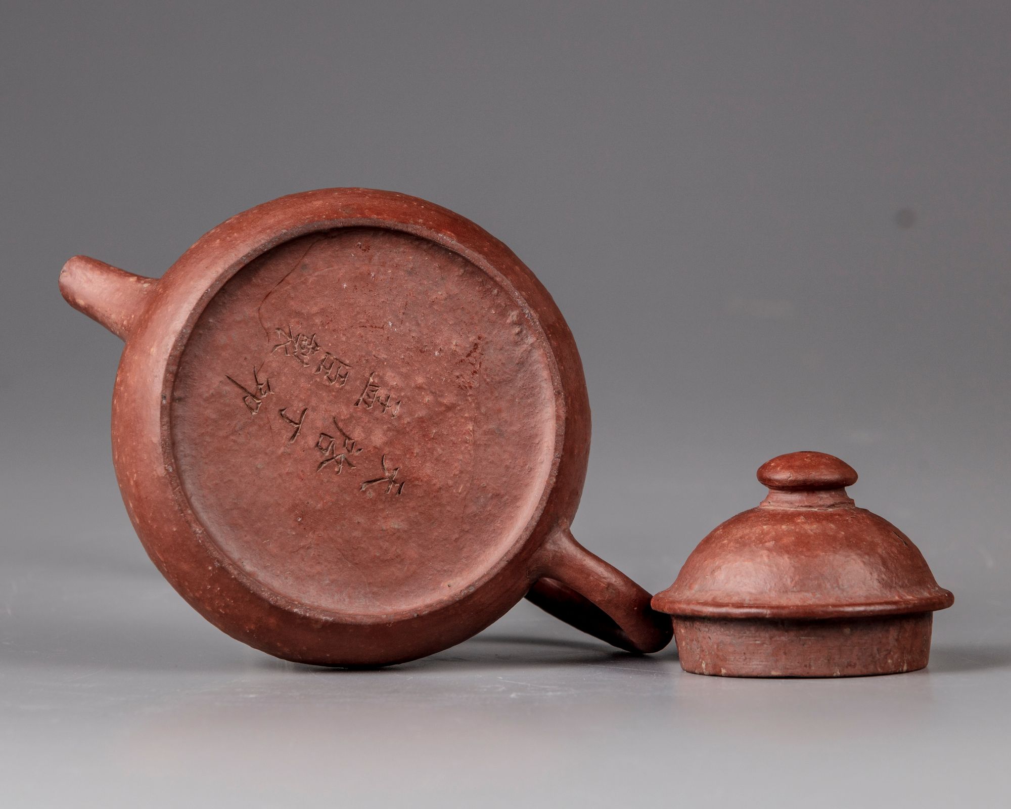 The teapot potted with a flat base and compressed globular body, the teapot is applied with a cabriole spout and a C-scroll handle.