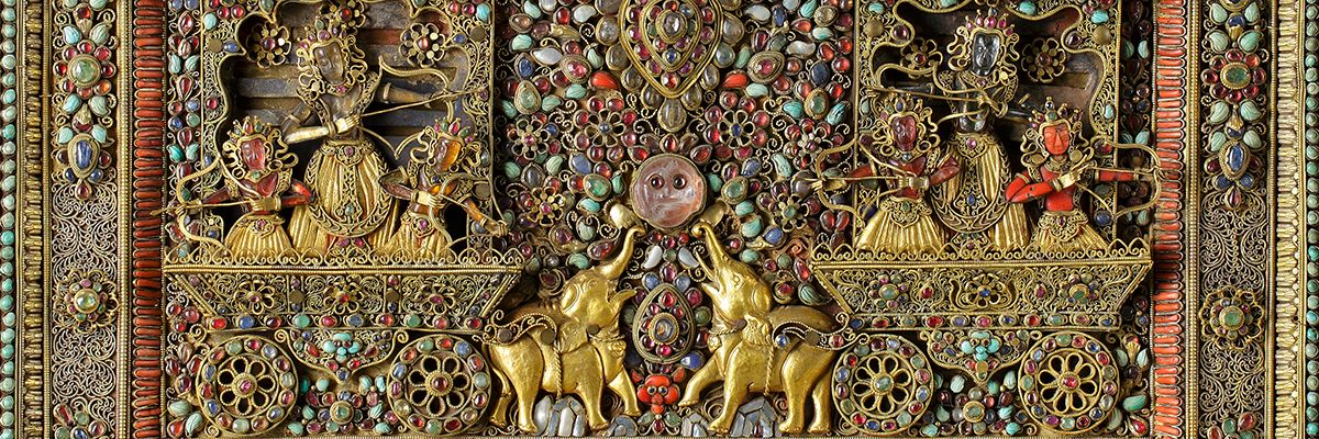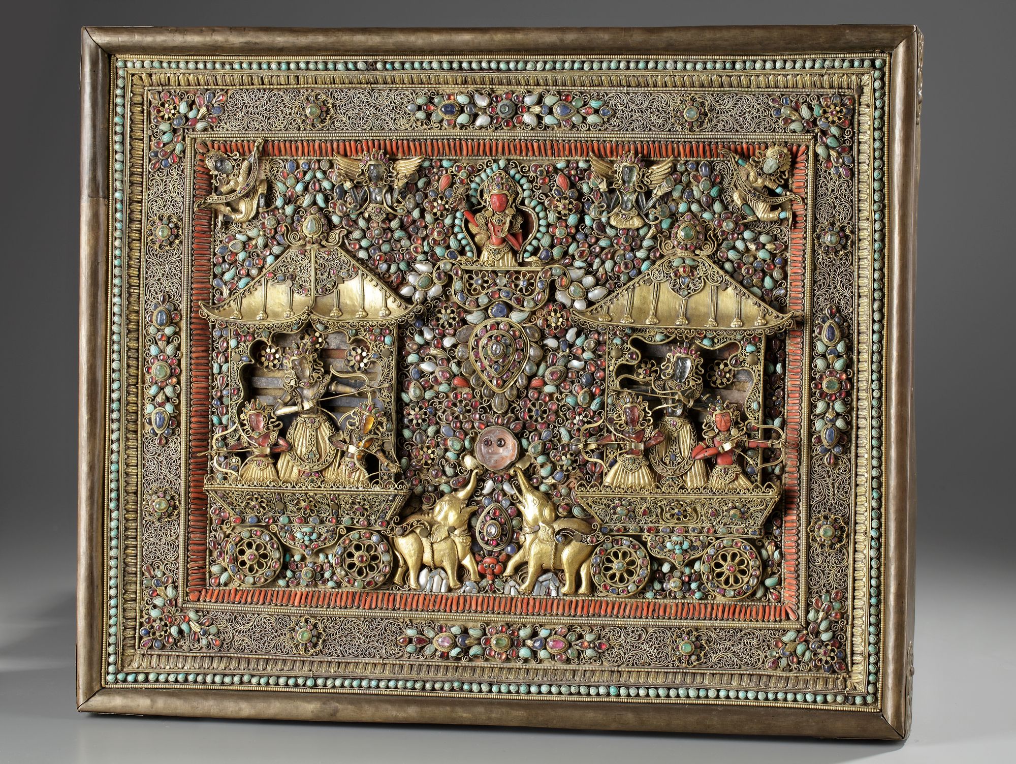 A rare Nepalese gilt copper and filigree panel set with assorted gem stones, richly decorated with Hindu figures drawing bows in caravans drawn by elephants. A central coral figure holds a vajra, and is flanked by further figures, the panel is set with diamond, sapphire, rock crystal, coral, turquoise, mother of pearl and other stones.
