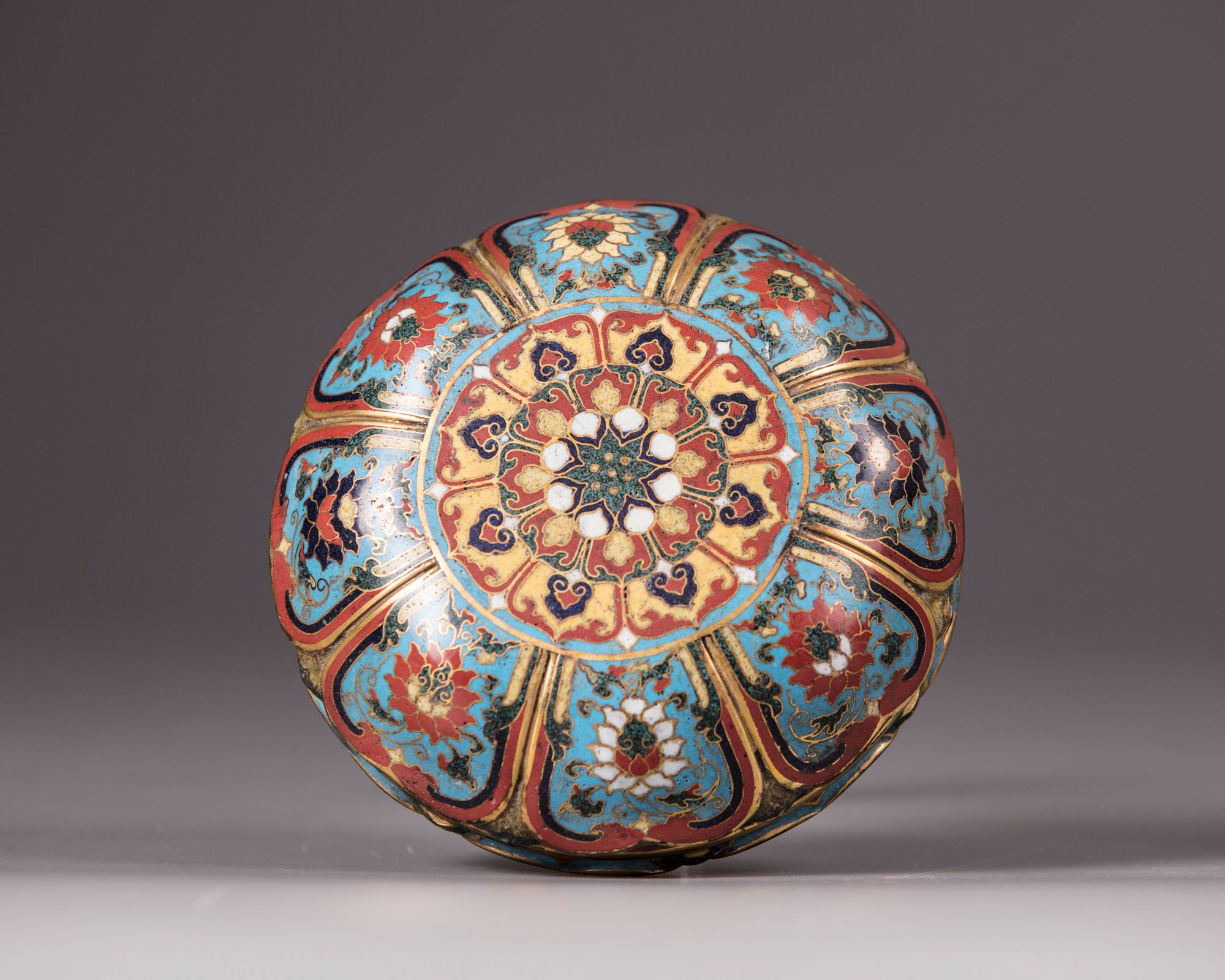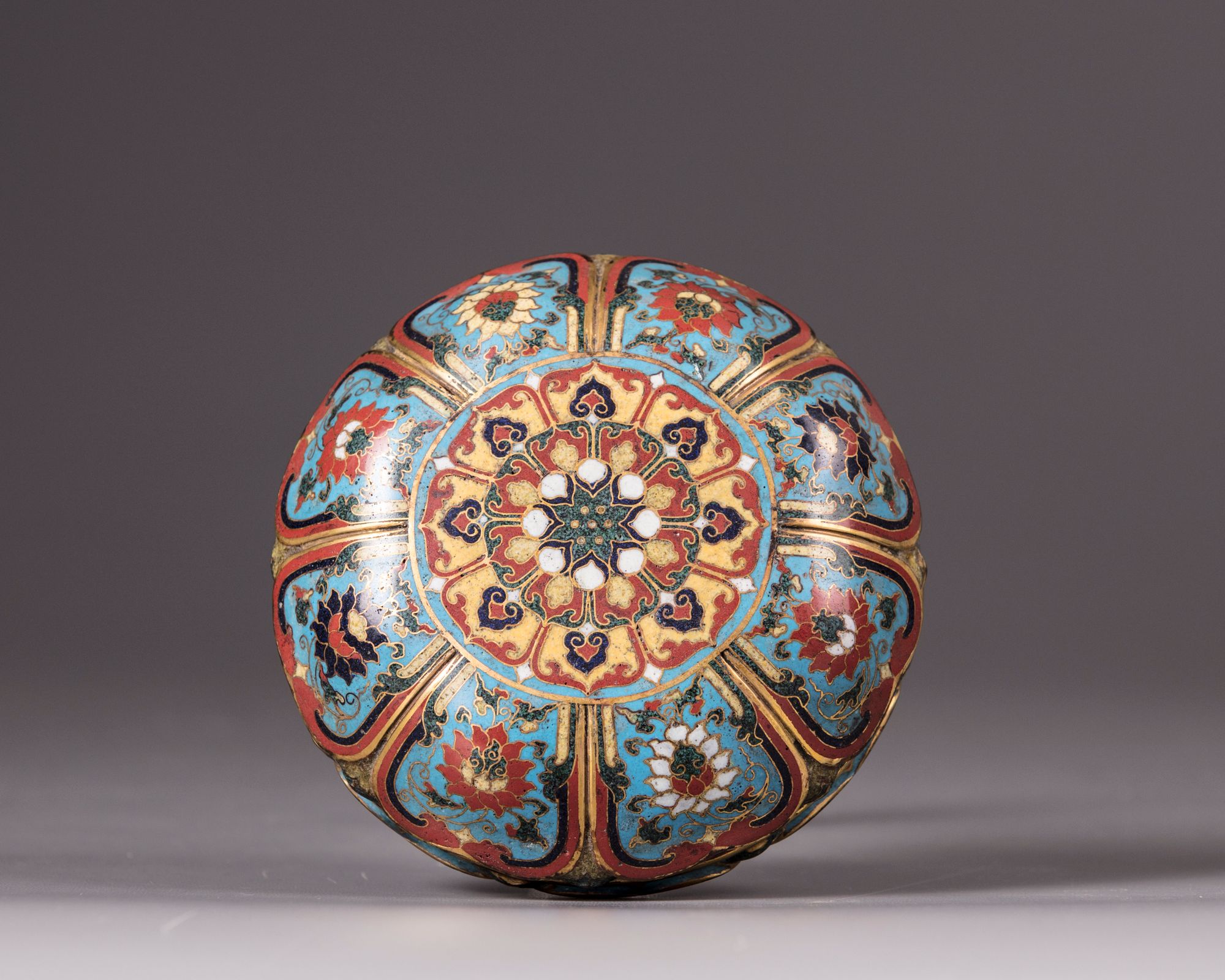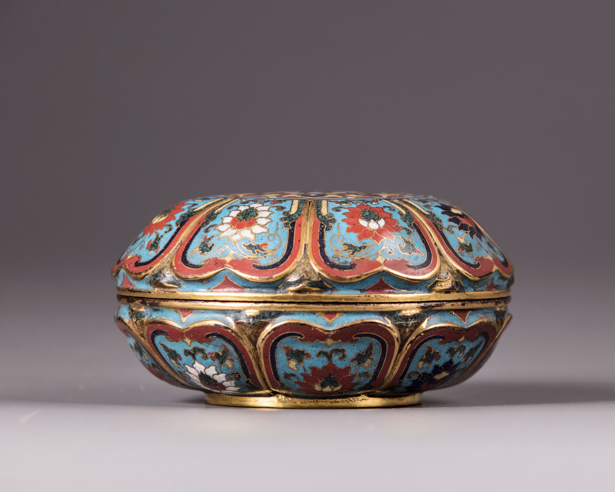 The box is decorated with delicate wires forming cloisons and infilled with various enamels to depict a central lotus roundel panels of repousse lotus petals each enclosing a coiled lotus flower. The base is similarly decorated with repousse lotus petal panels. The base with an apocryphal Jingtai mark.