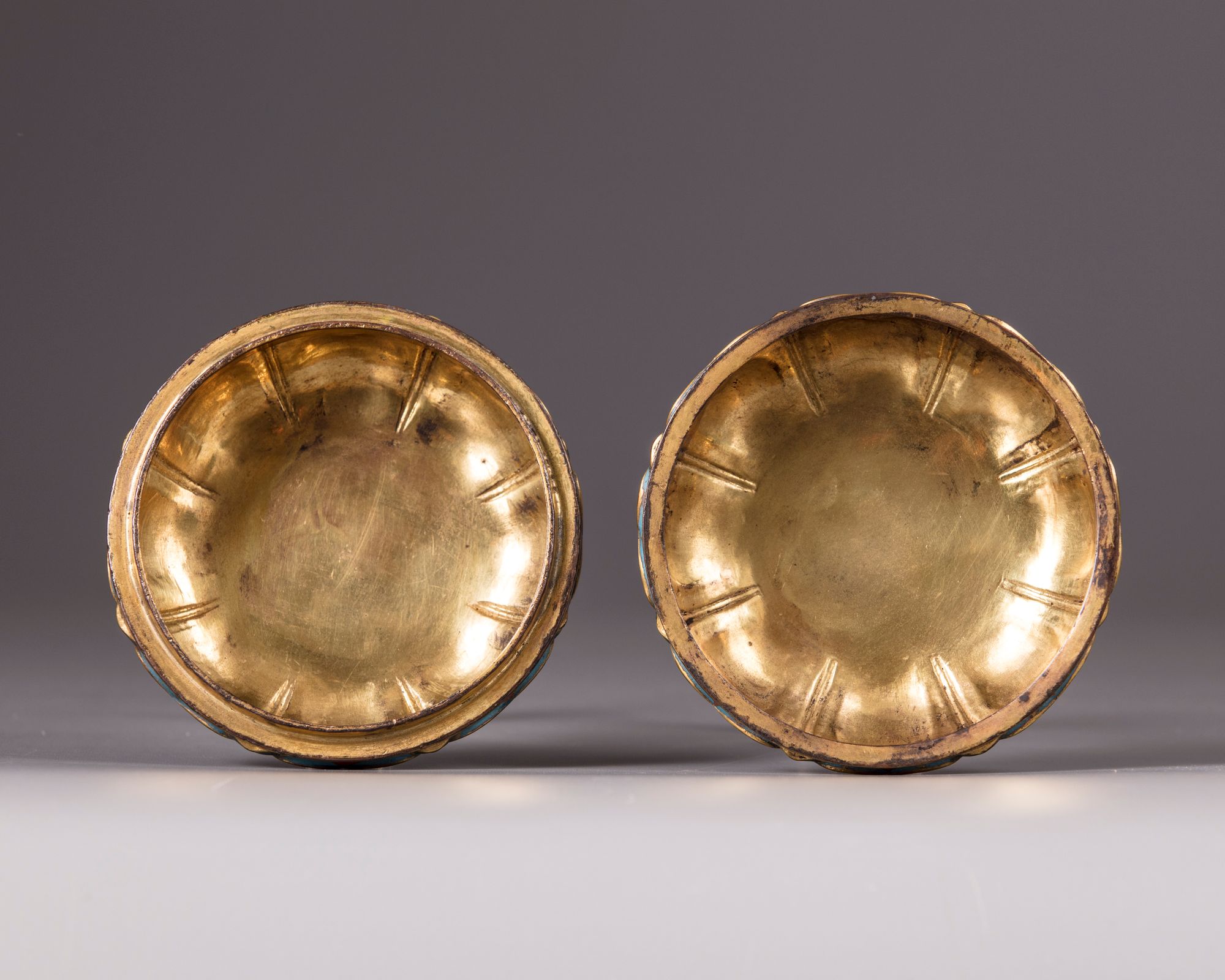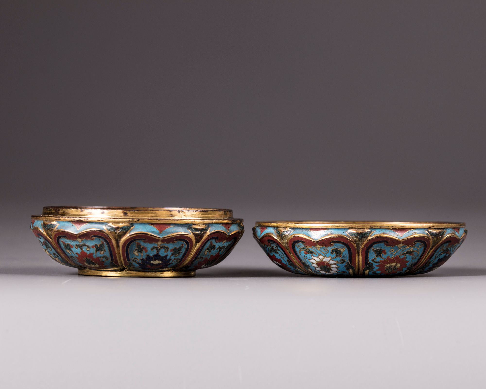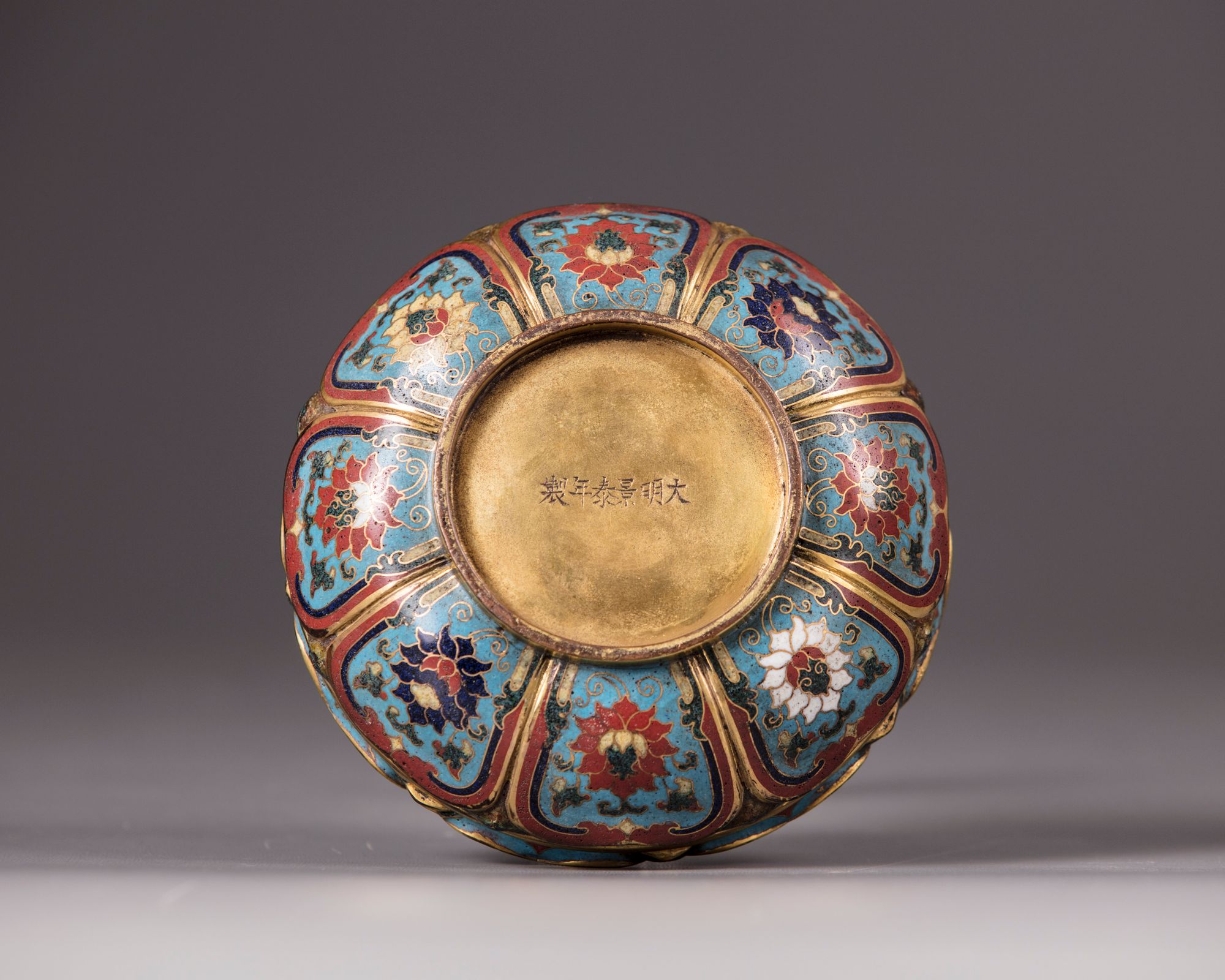 The box is decorated with delicate wires forming cloisons and infilled with various enamels to depict a central lotus roundel panels of repousse lotus petals each enclosing a coiled lotus flower. The base is similarly decorated with repousse lotus petal panels. The base with an apocryphal Jingtai mark.