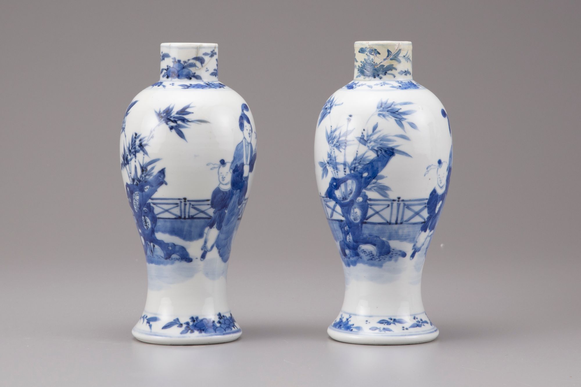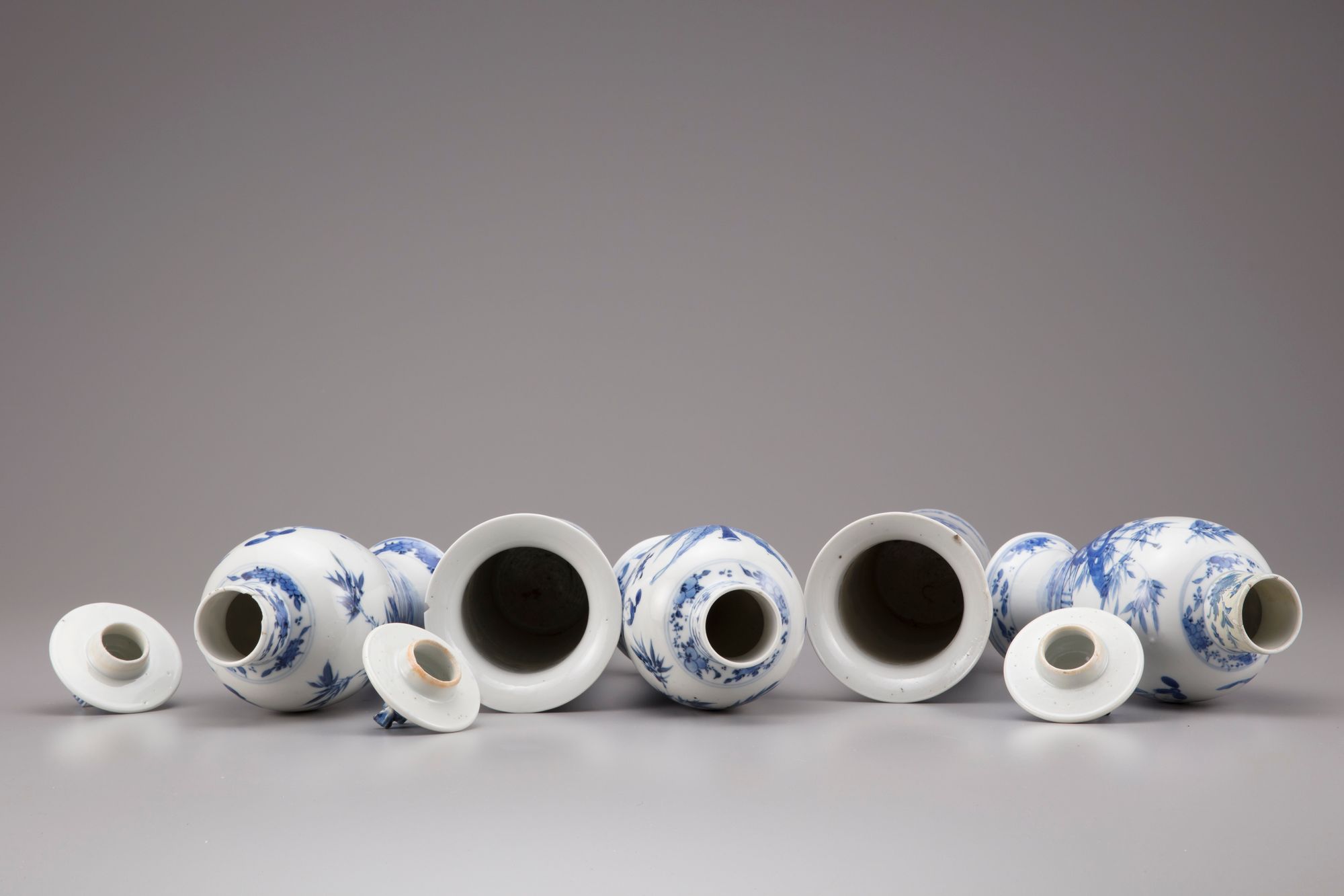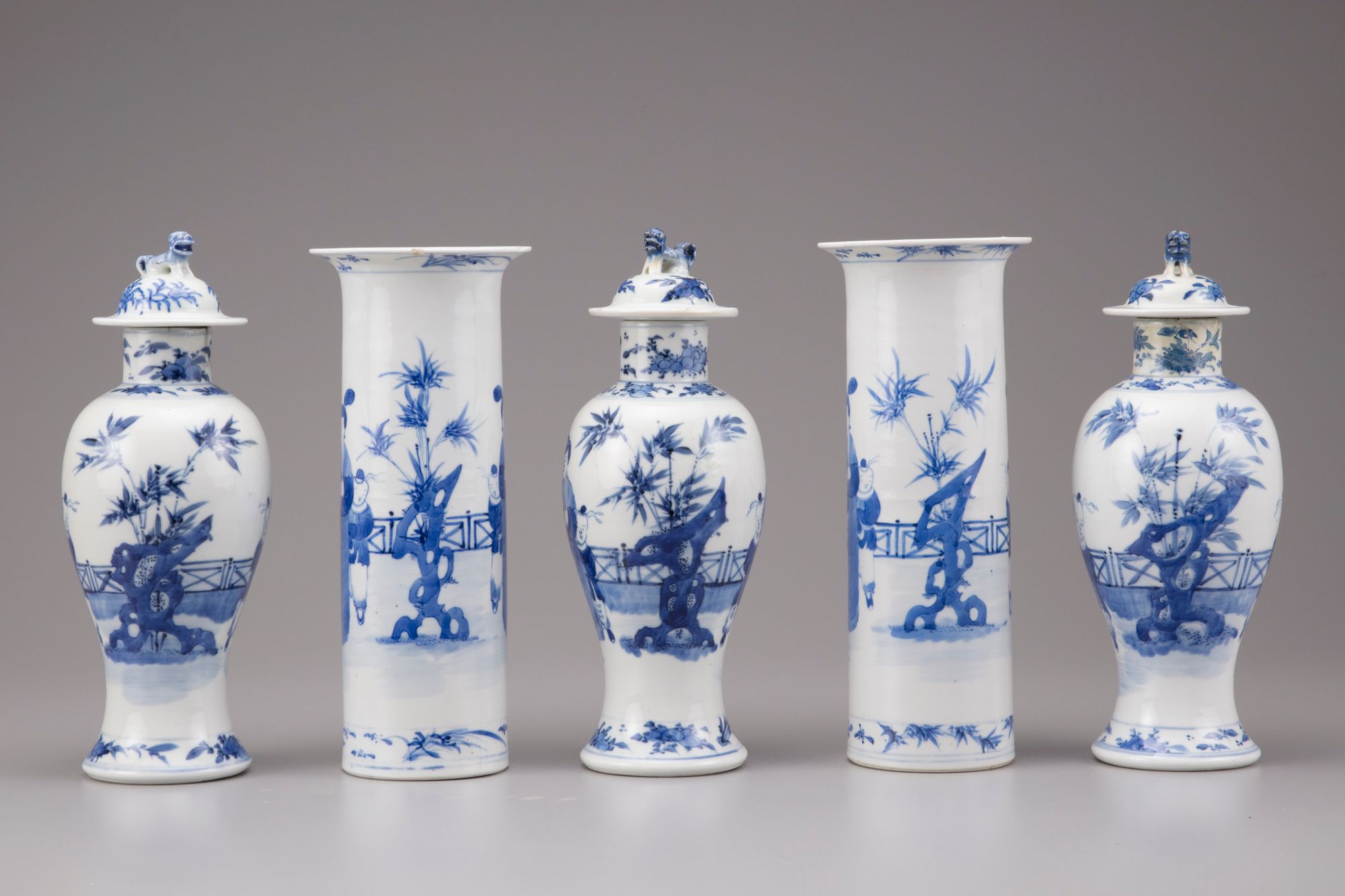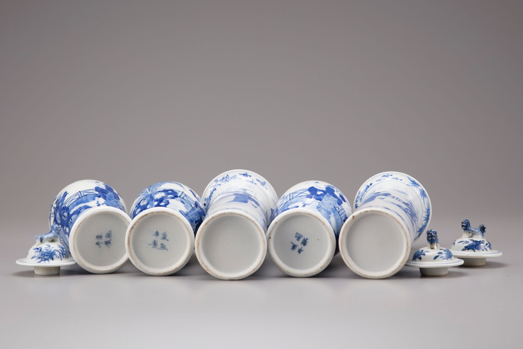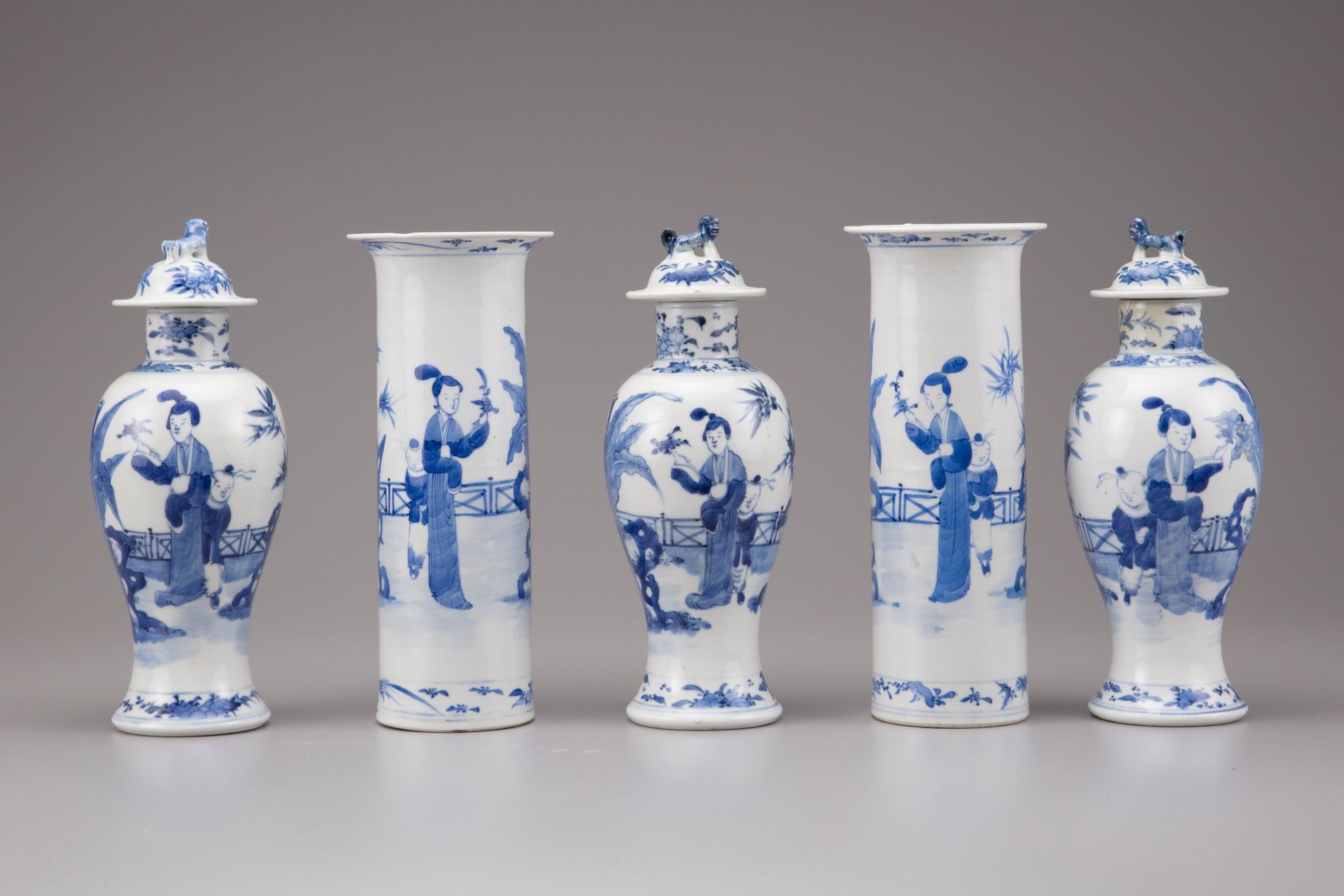Consisting of three baluster shaped vases with cover and two beaker vases, decorated in underglaze blue with long Eliza standing in a fenced garden with a plantain tree, covers with Fo dog finial. Three vases with four character Kangxi mark.
