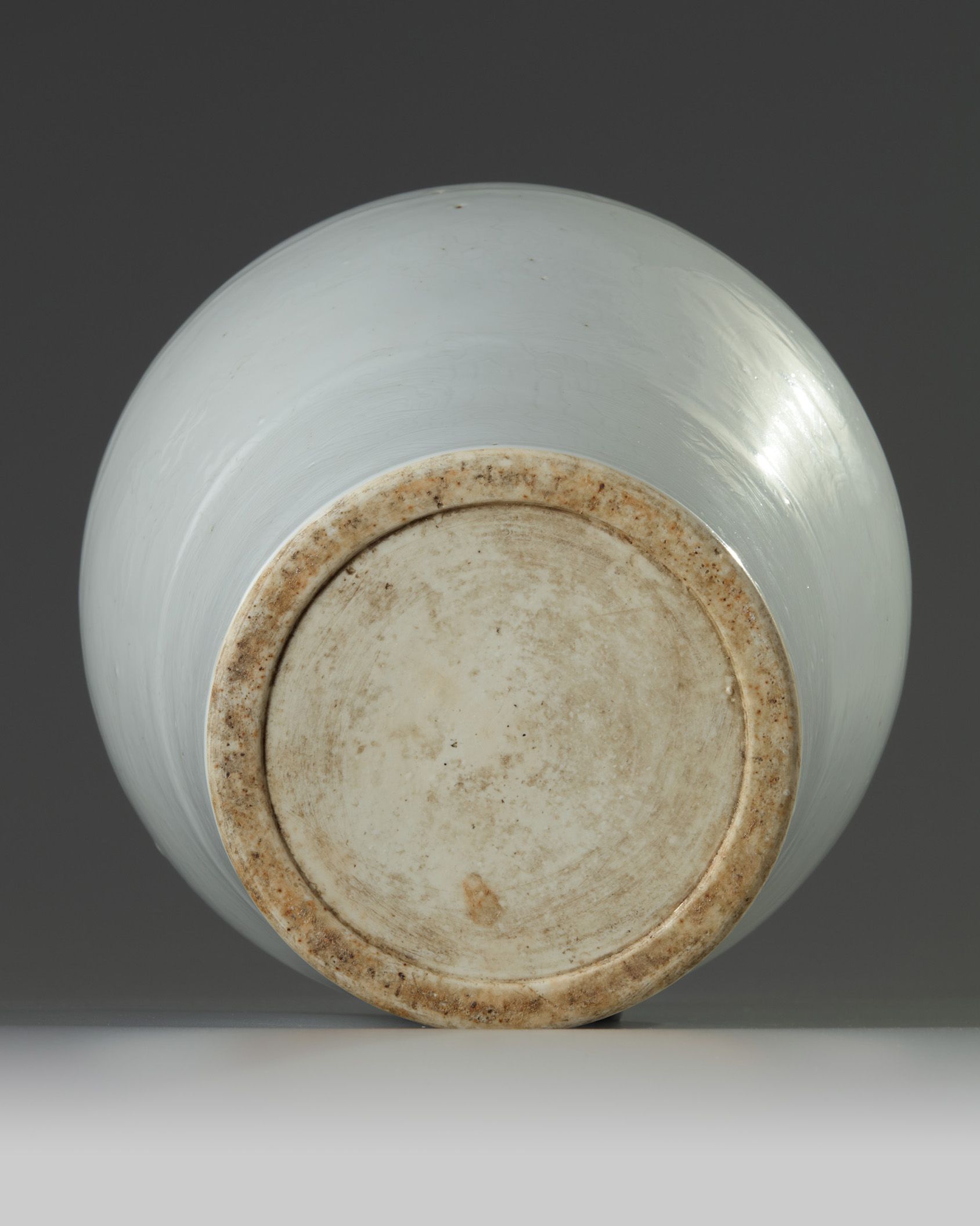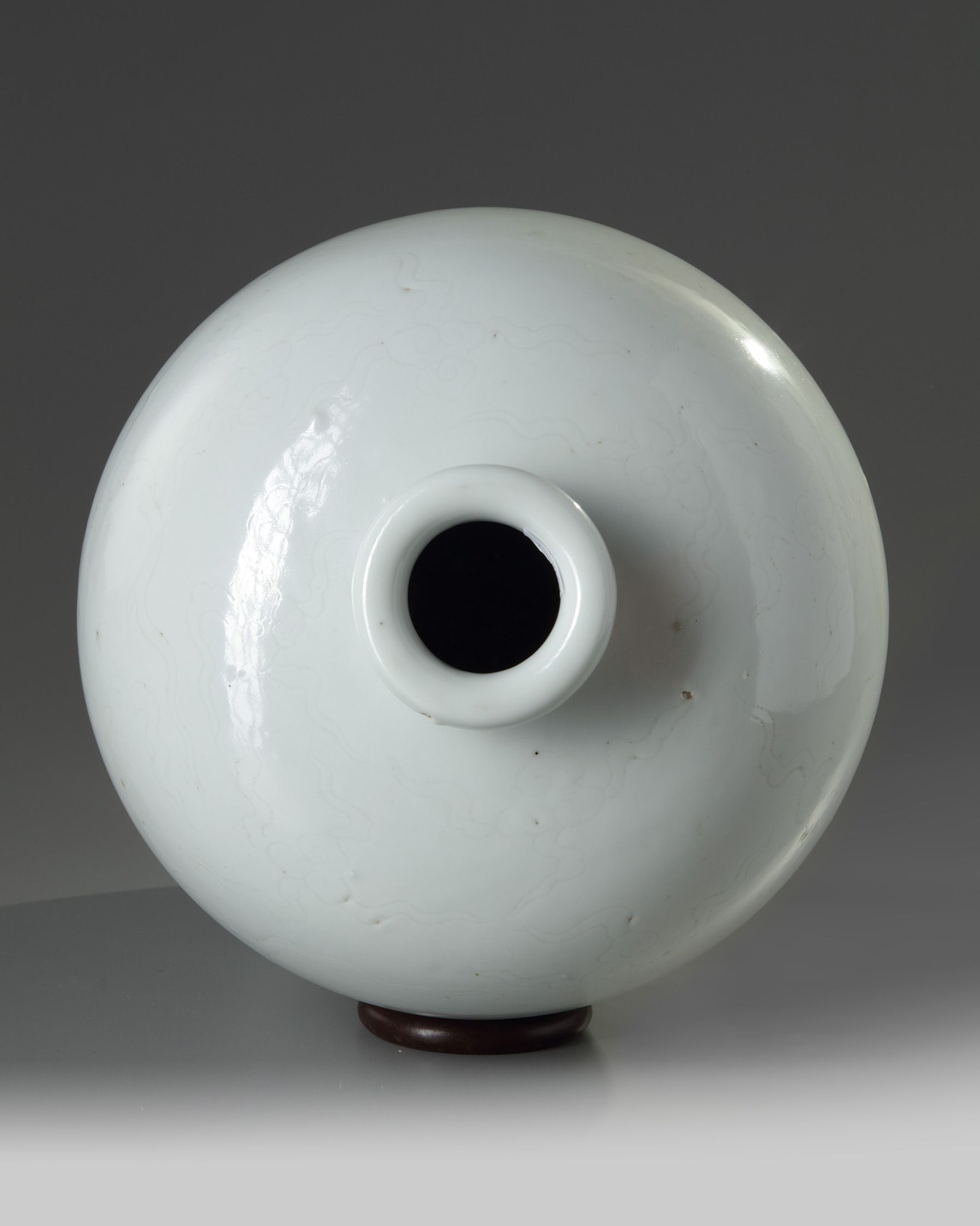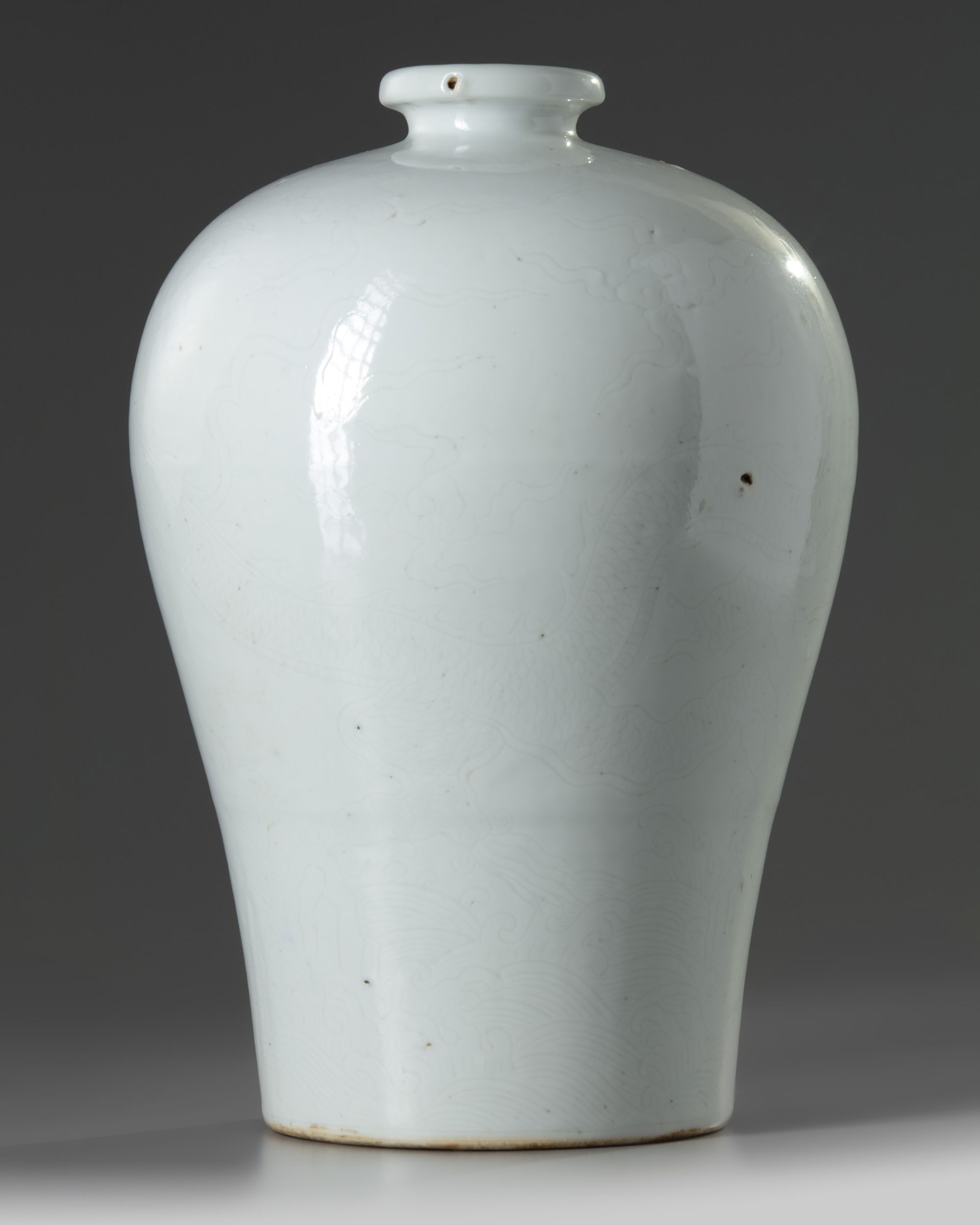The vase is decorated with incised dragons amongst flame and tripartite cloud scrolls. all above foaming waves.