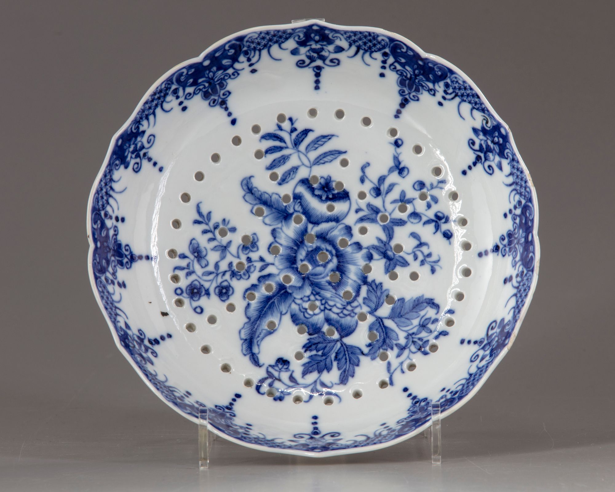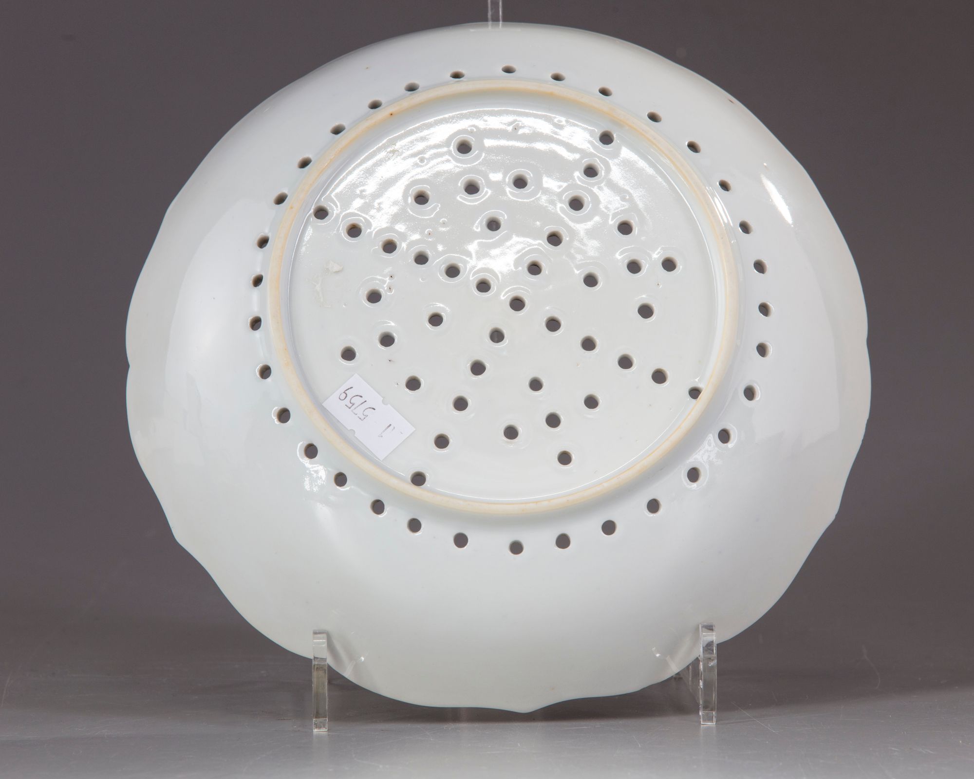 A Chinese scalloped porcelain strawberry strainer, decorated to the centre with a large chrysanthemum and fruiting branch, to the side with a bang of flowers and foliage.