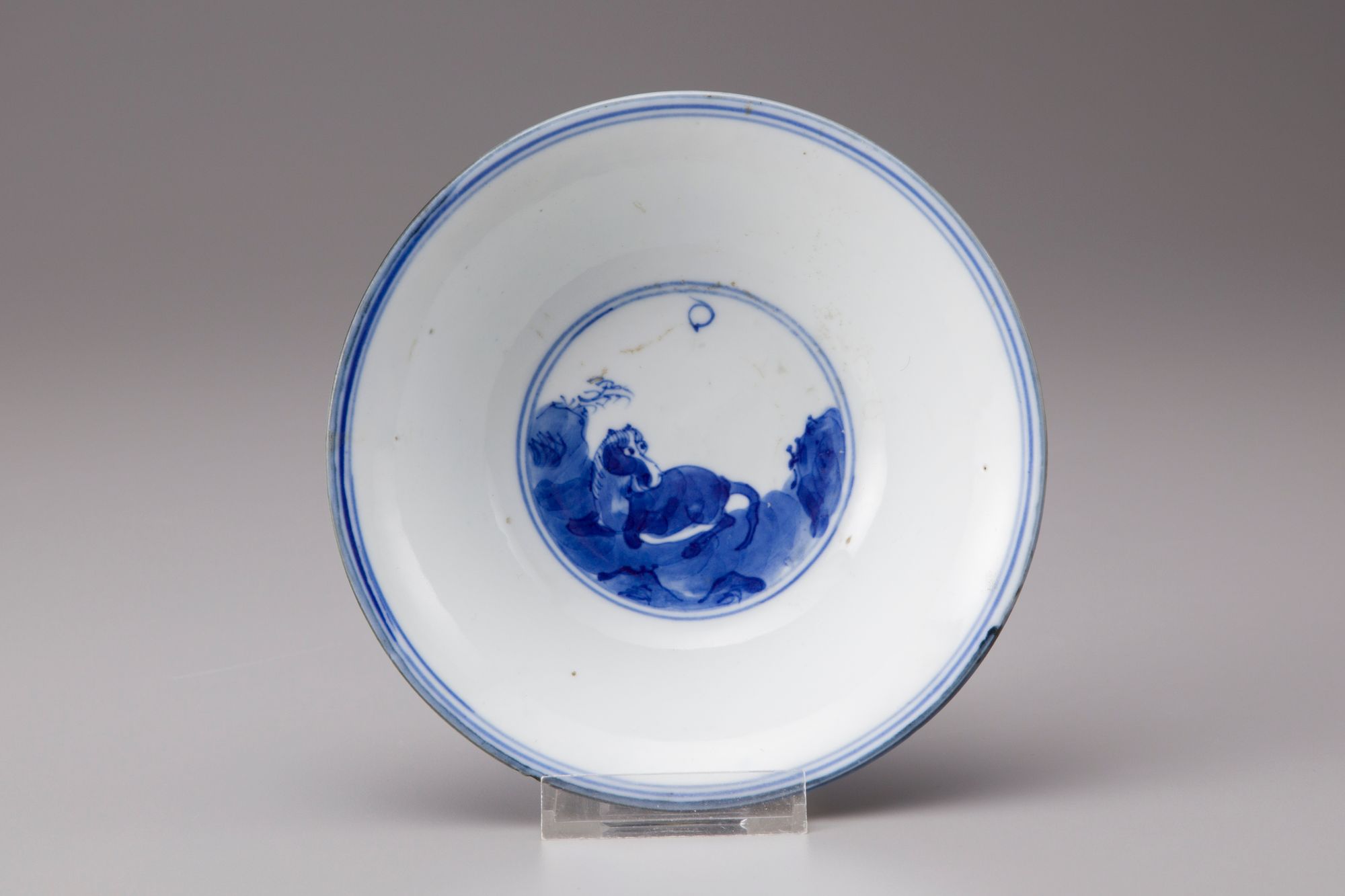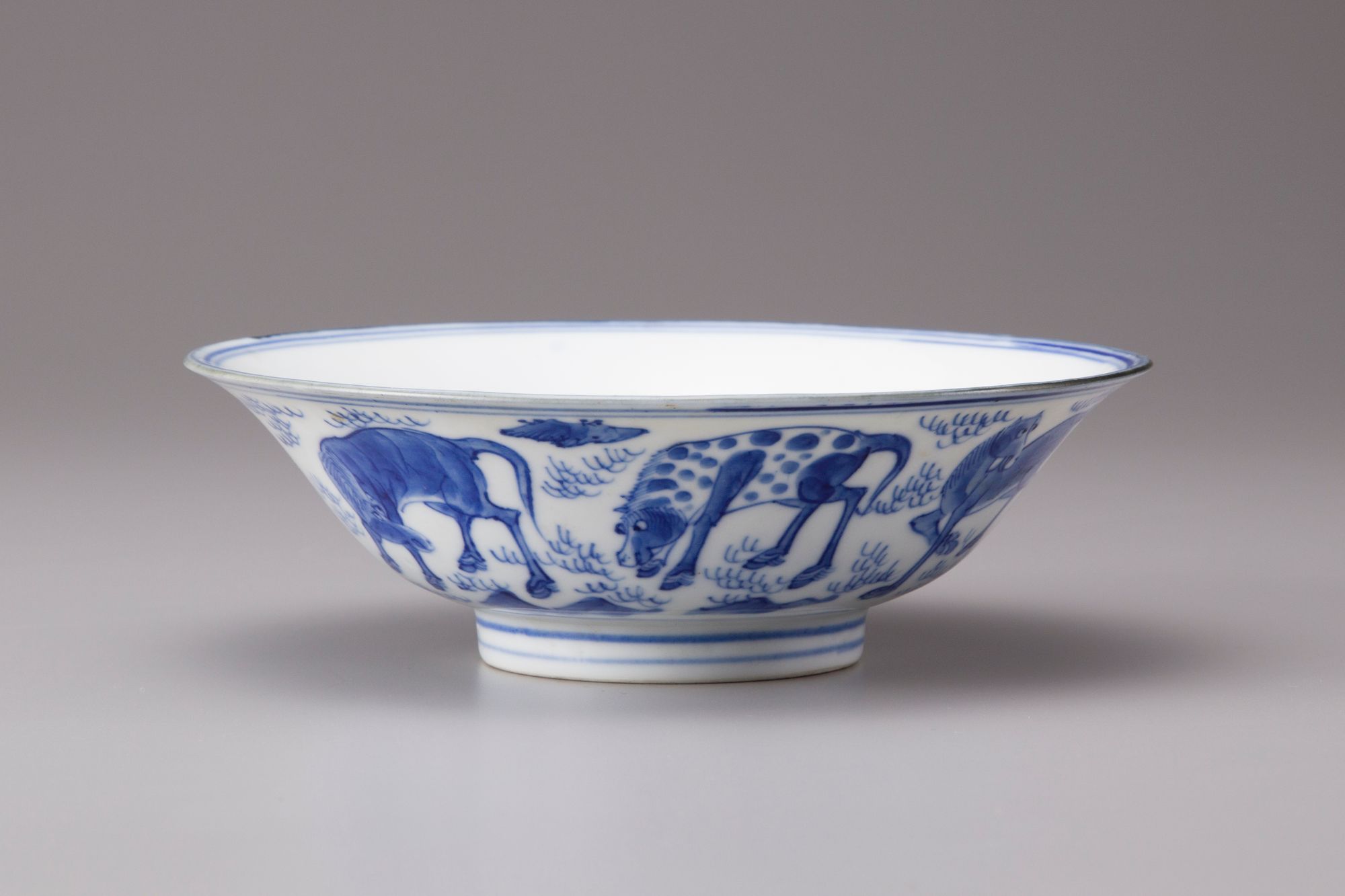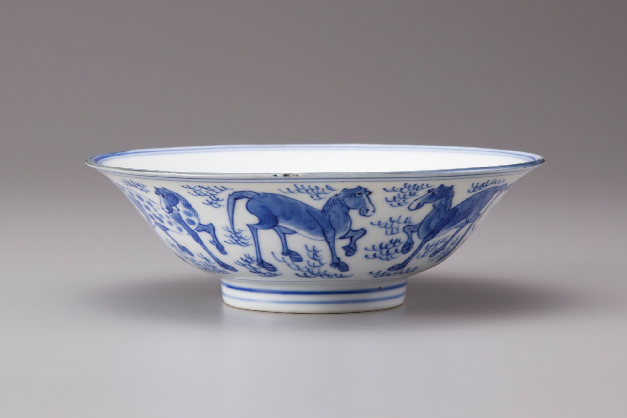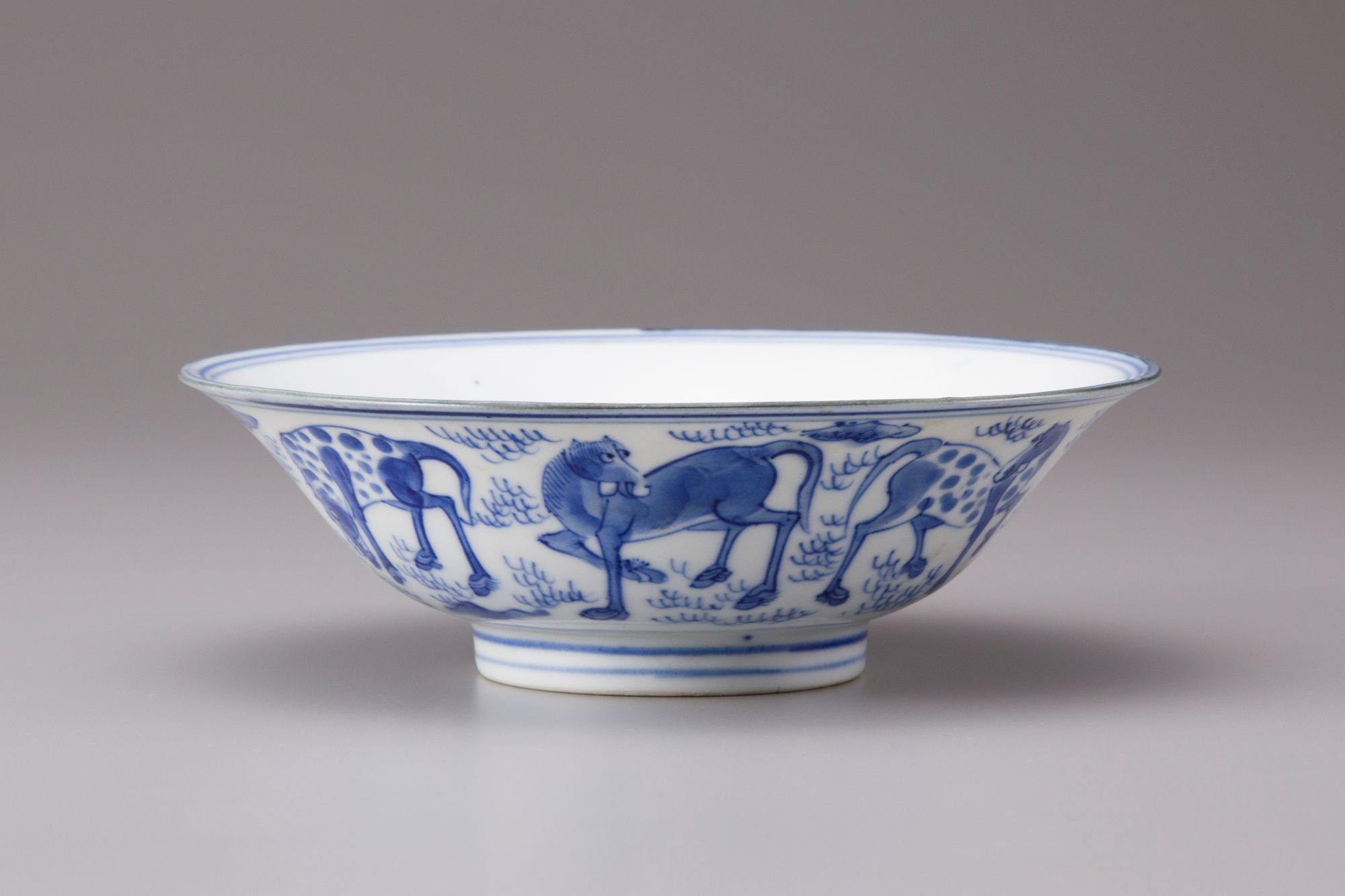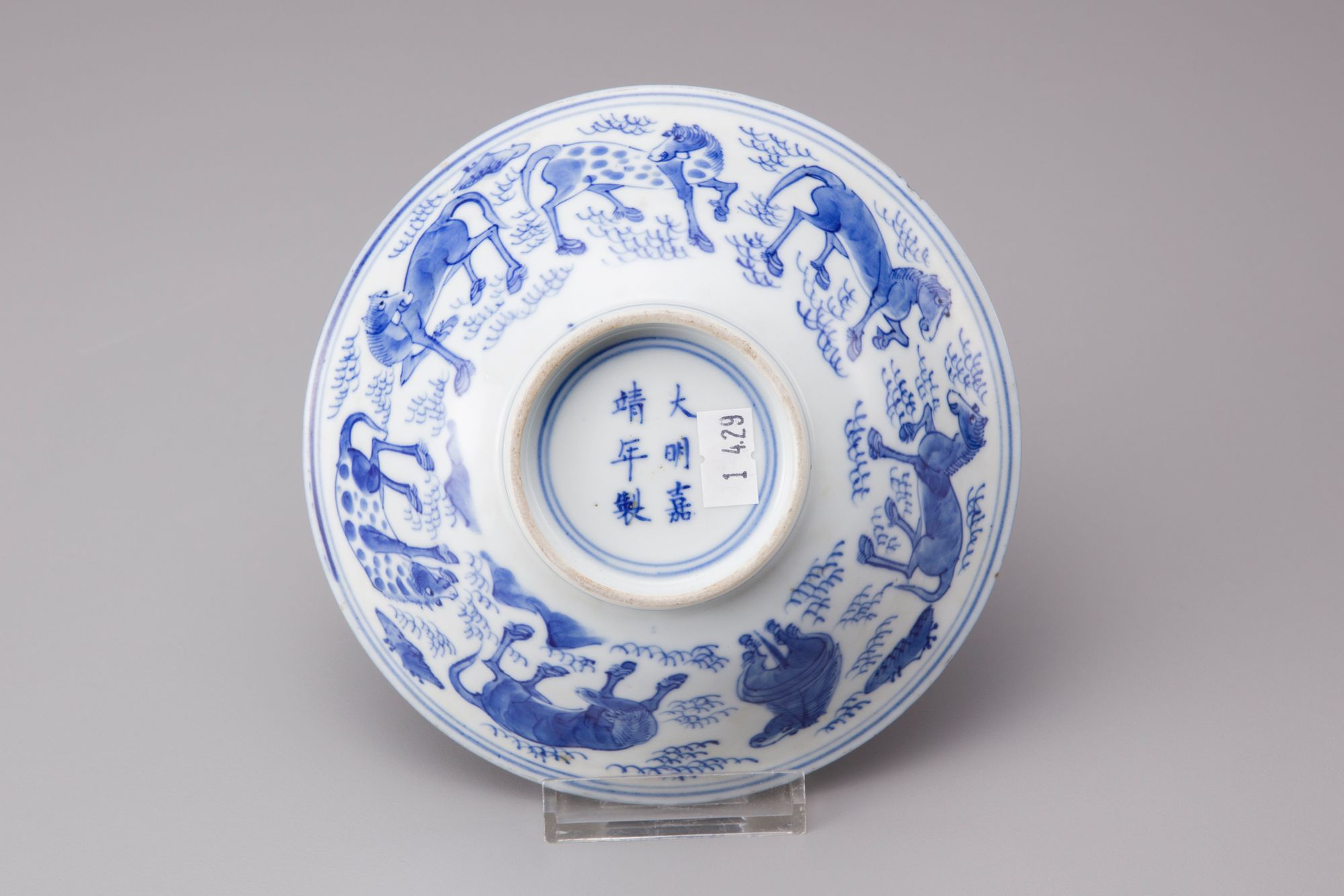 Blue and white conical bowl painted with the Eight Horses of Muwang frolicking or grazing amidst a rocky landscape, with seven horses to the exterior, the eighth enclosed within a double circle in the center of the interior. The base is inscribed with a six character Jiajing mark.