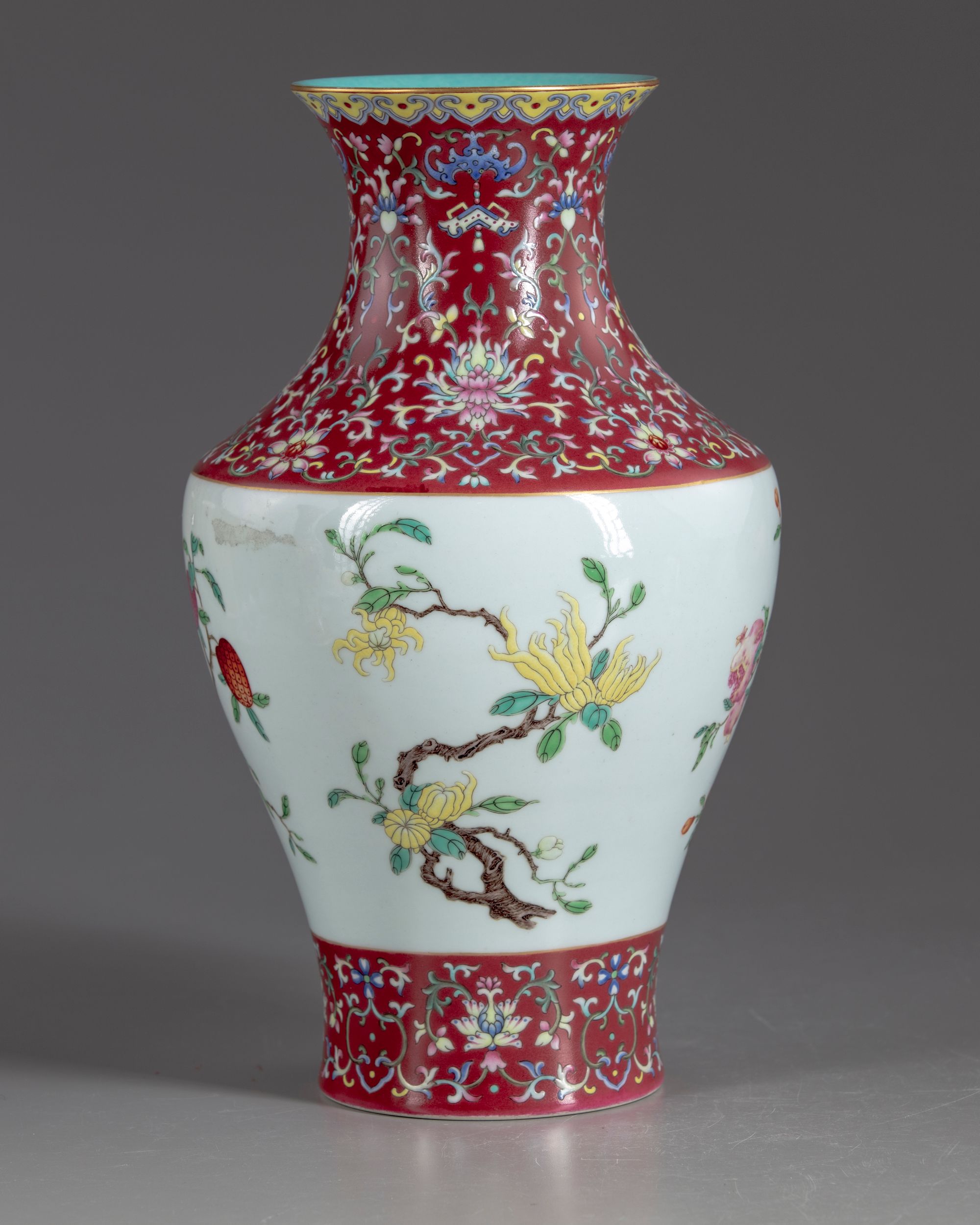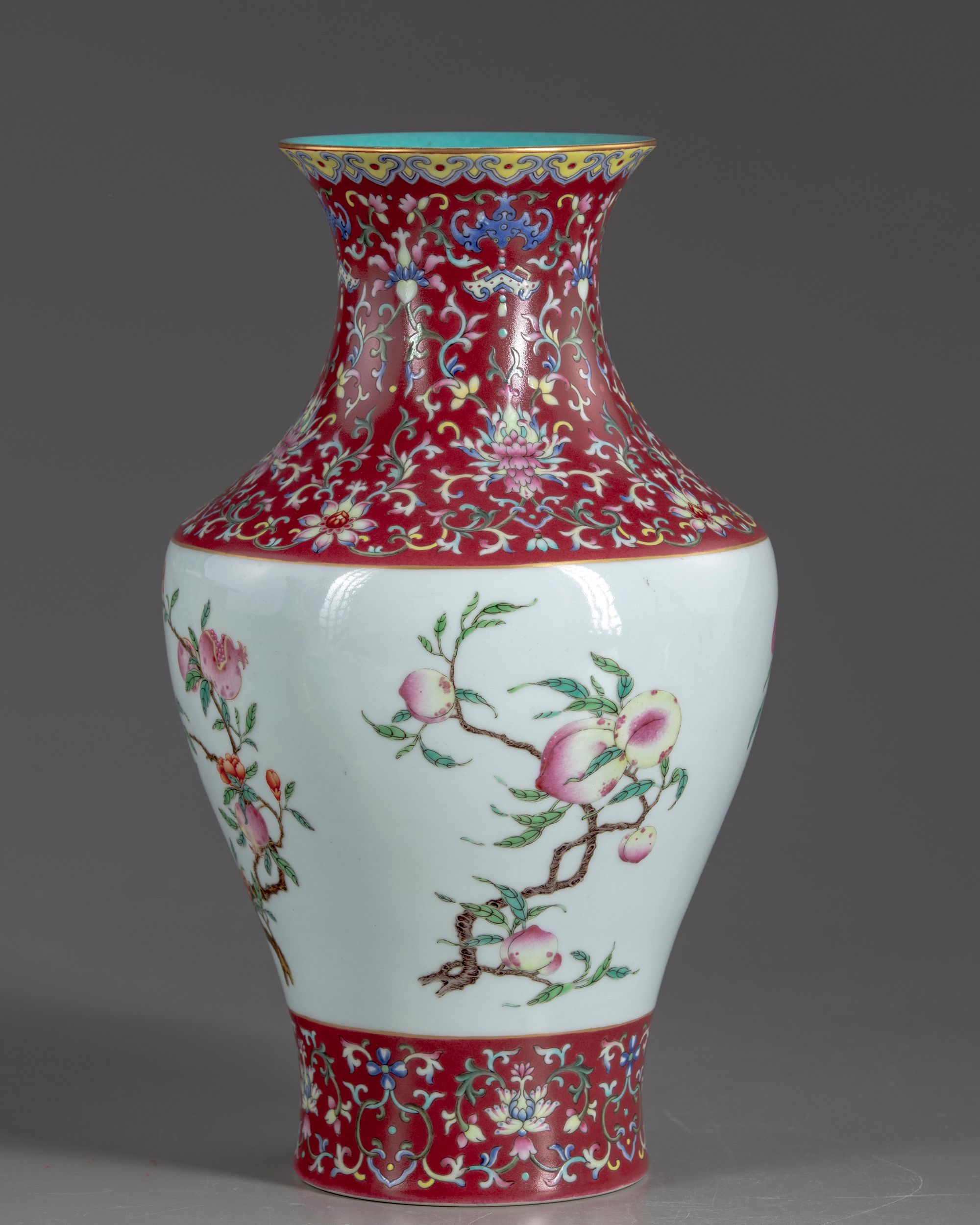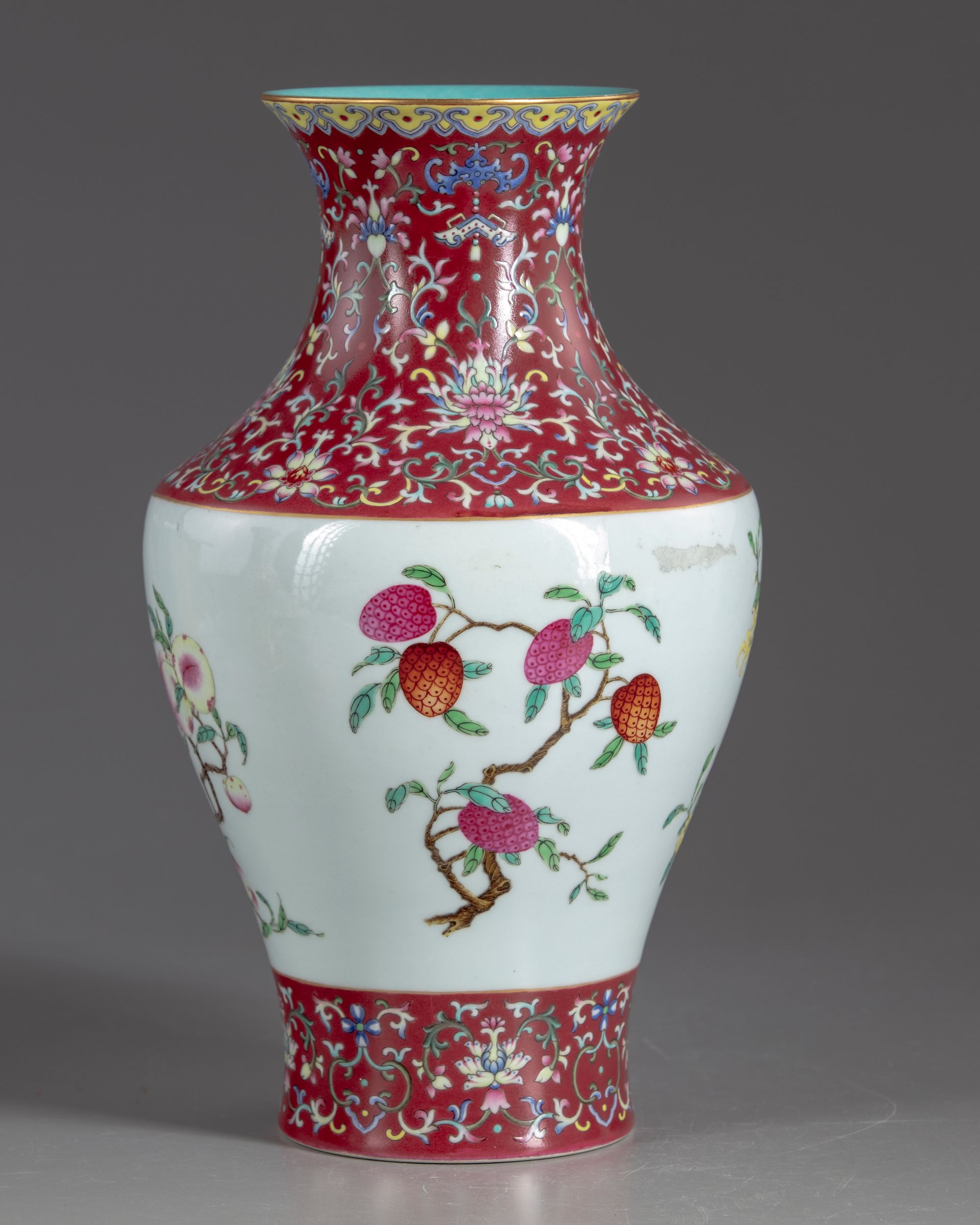 A Chinese porcelain vase, decorated with fruiting branches of Citron, lychee, peaches and pomegranates. The neck and the base are further painted with lotus heads interspersed with foliage below Fu-bats. The interior and the base are turquoise glazed with a Chinese Qianlong seal mark.