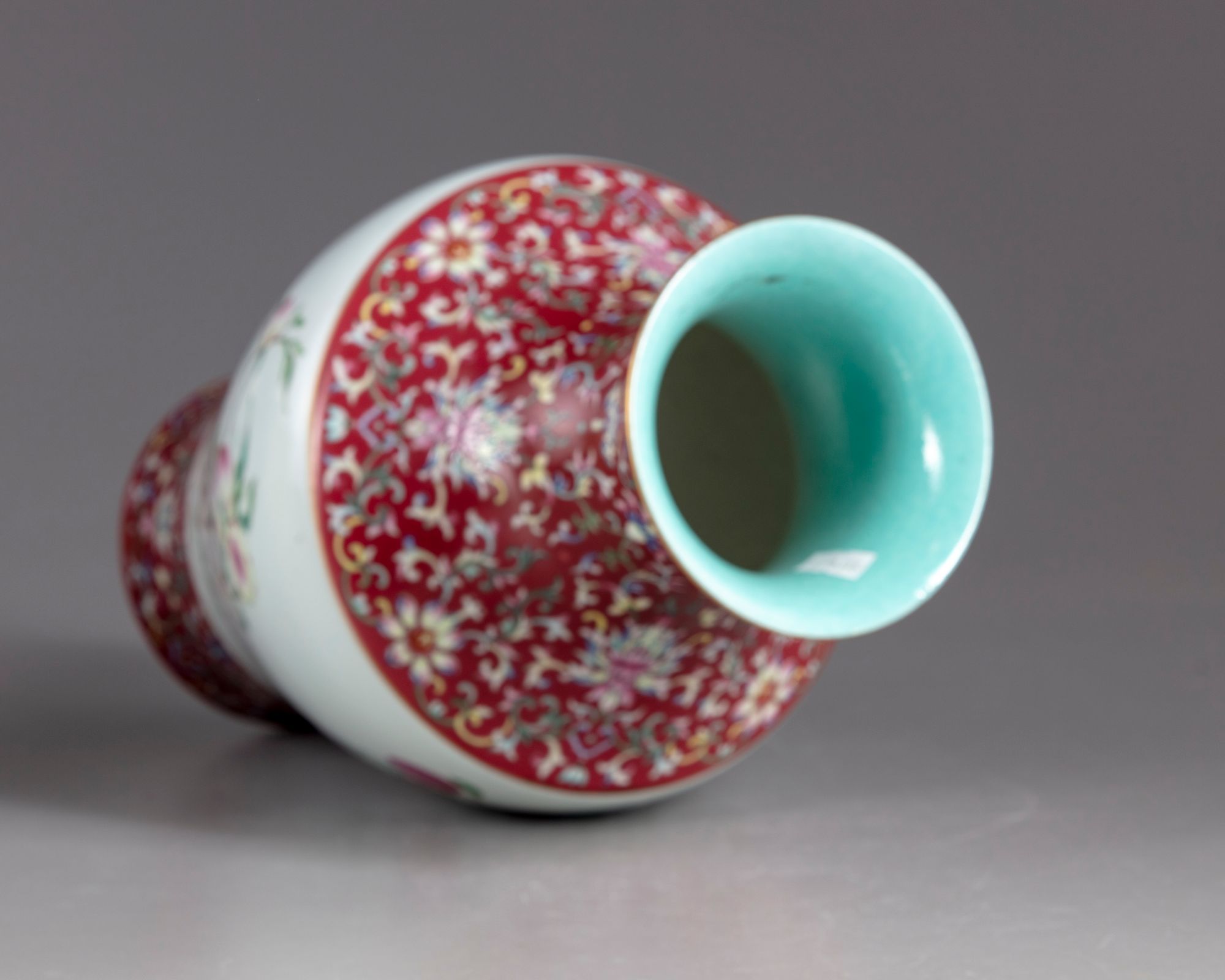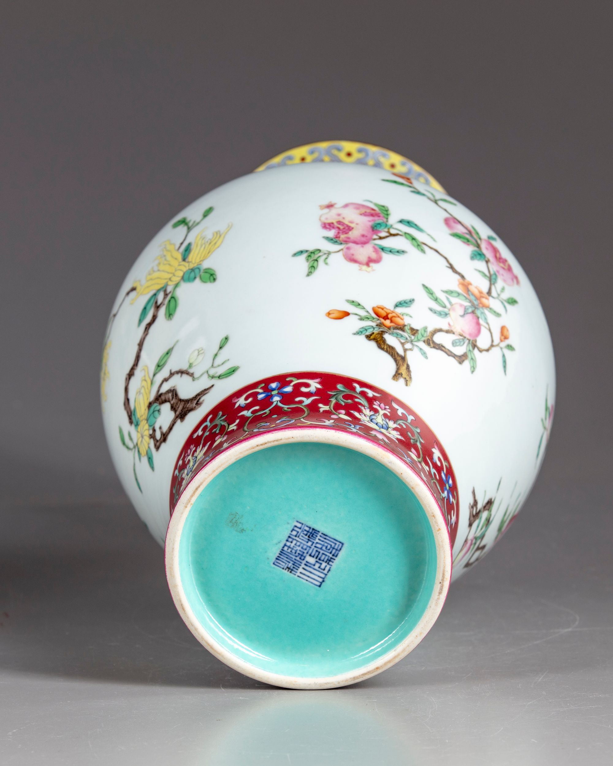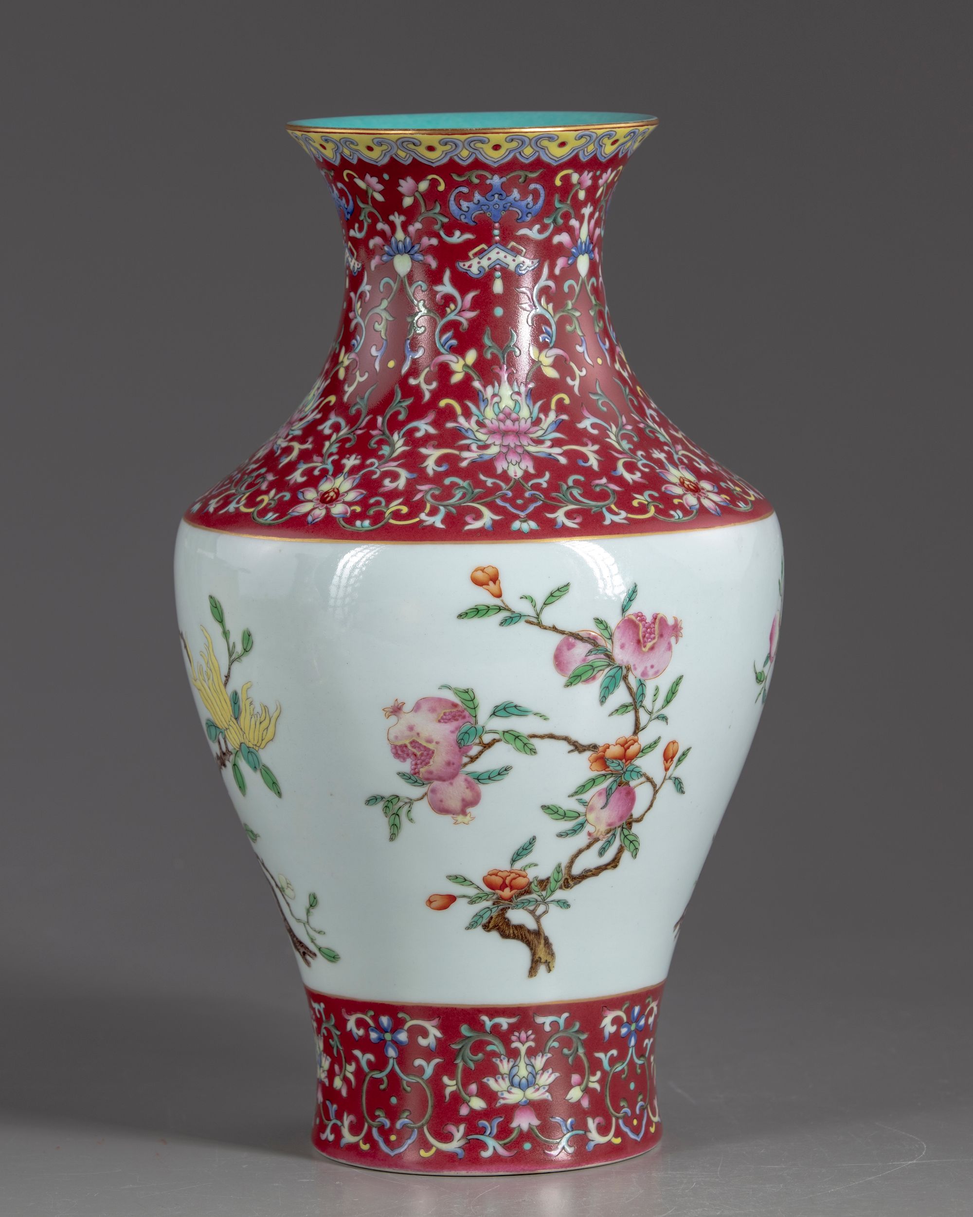 A Chinese porcelain vase, decorated with fruiting branches of Citron, lychee, peaches and pomegranates. The neck and the base are further painted with lotus heads interspersed with foliage below Fu-bats. The interior and the base are turquoise glazed with a Chinese Qianlong seal mark.