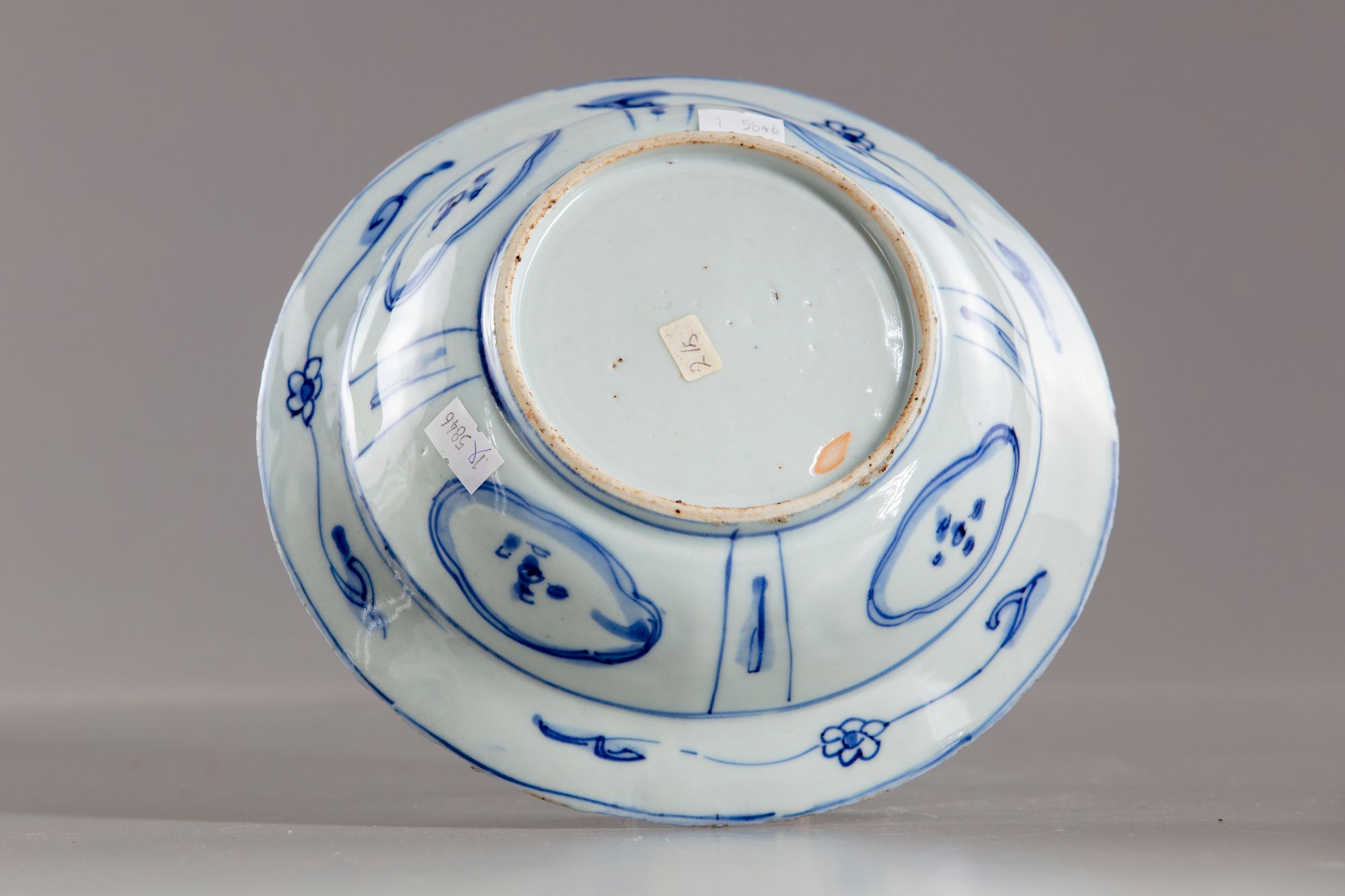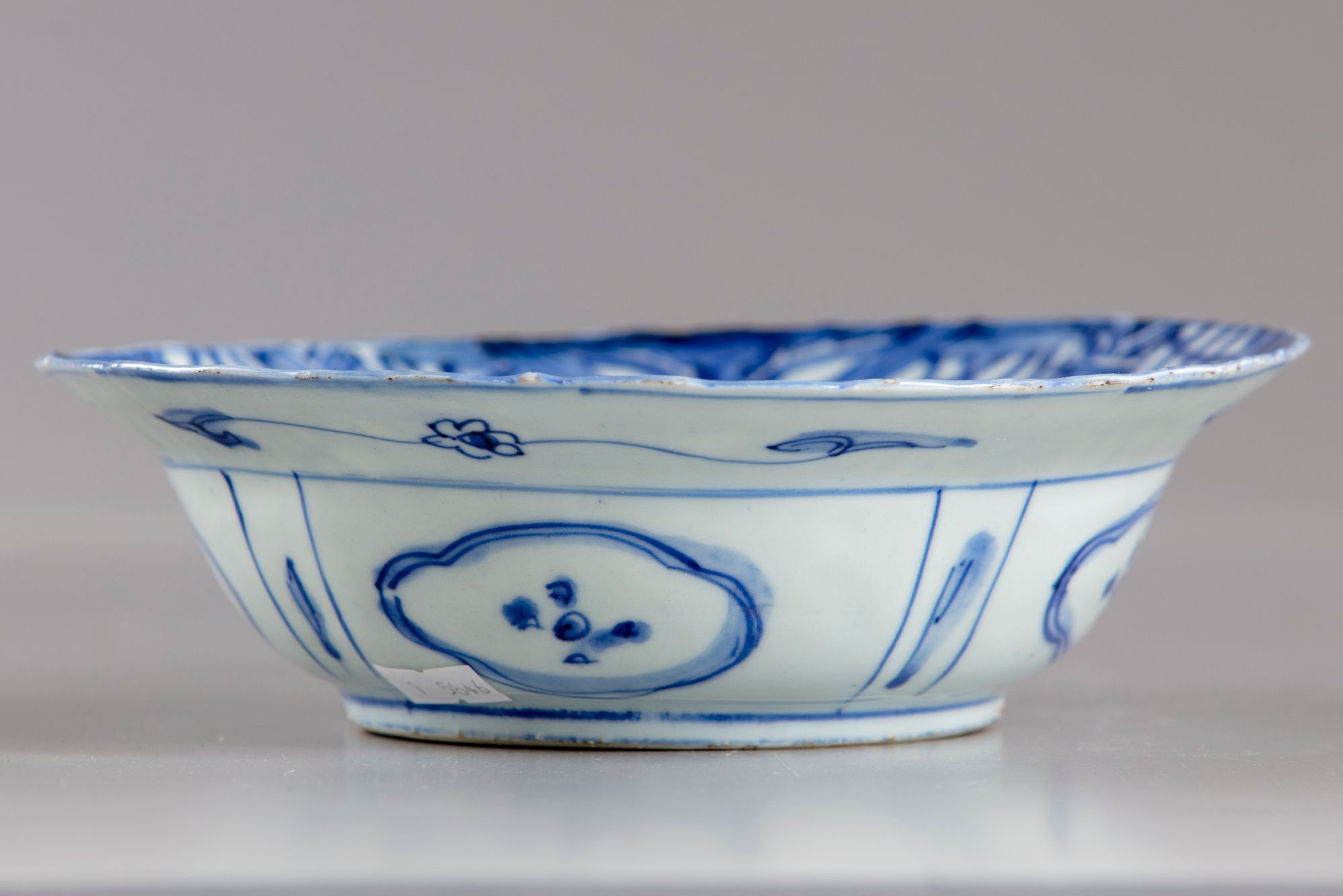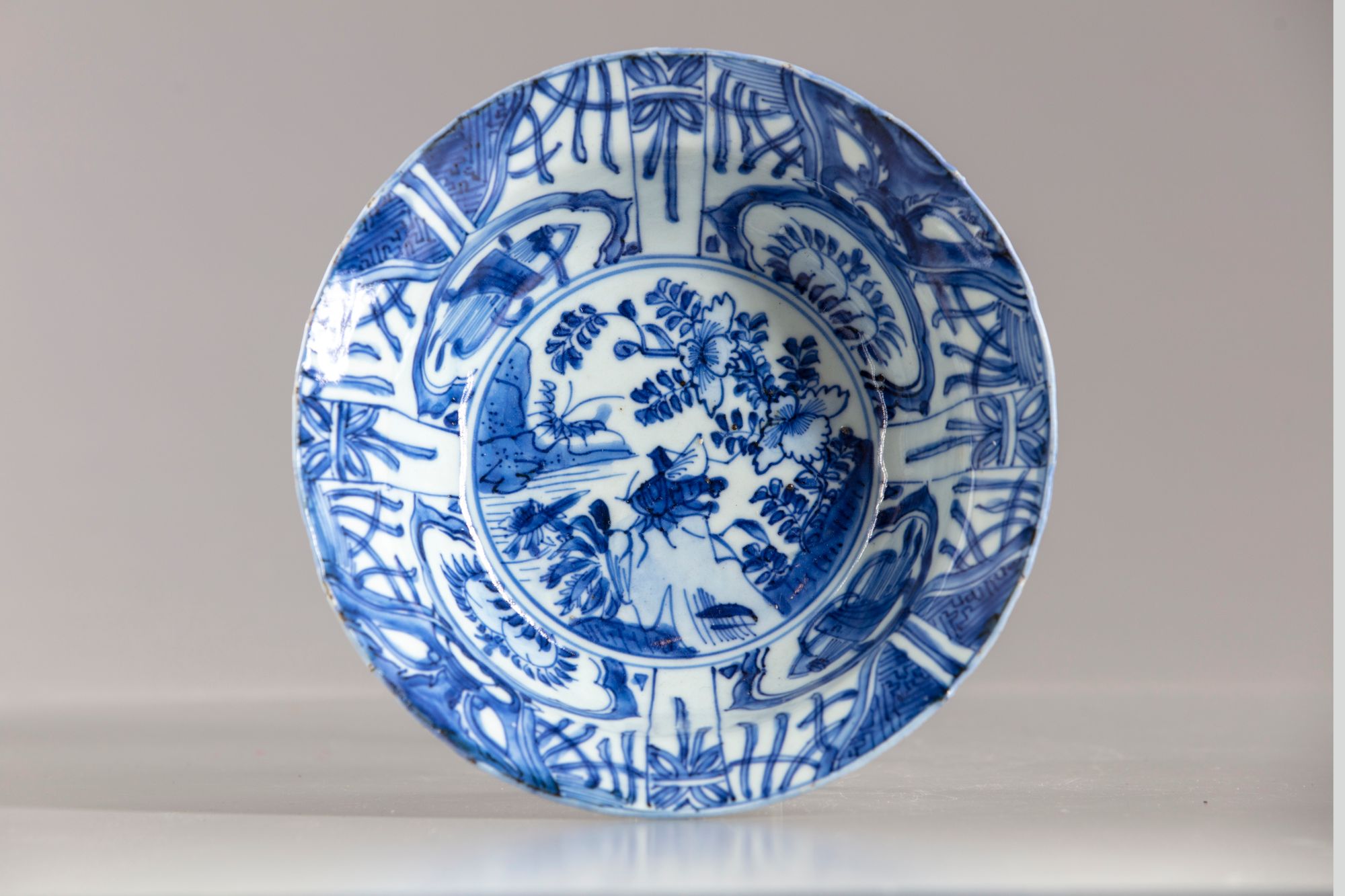 The bowl is finely decorated to the centre with a grasshopper perched on a rock below blossoming flowers, the cavetto is decorated with four panels enclosing alternating precious objects and peaches, all below suspending tassels, masks, and a brocade pattern. The reverse is decorated with further roundels. Provenance: from a private Dutch collection