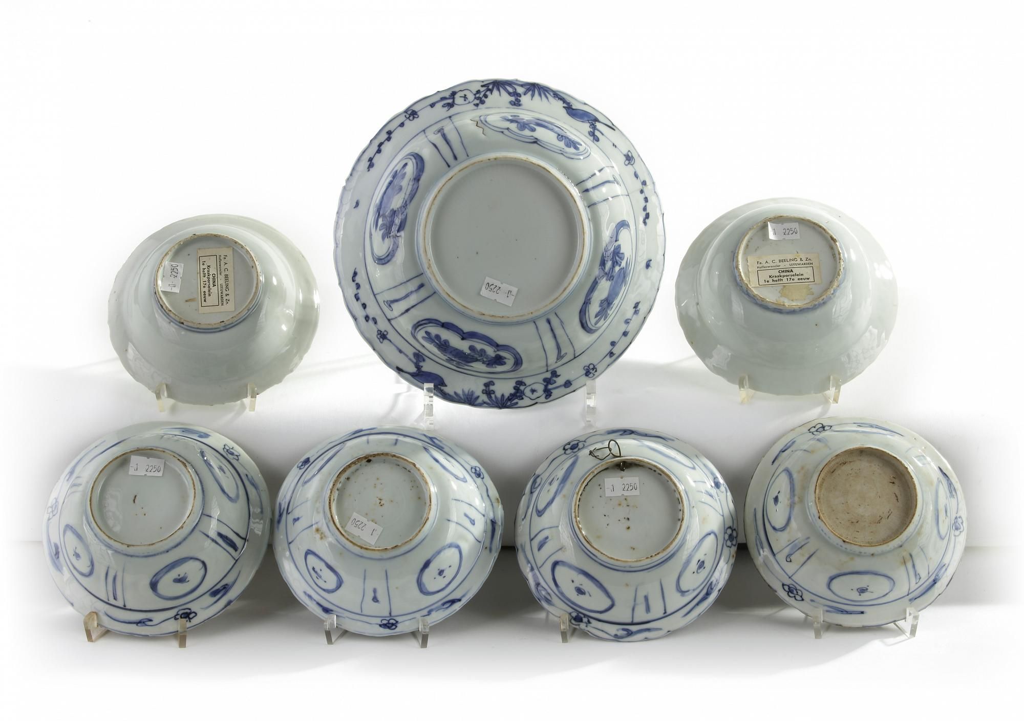 The group comprises a medium-sized bowl finely decorated to the centre with peaches and peonies in a basket, growing roots, the interior and exterior walls are decorated with shaped panels of precious objects and auspicious plants; four smaller bowls, two decorated with birds and flowers to the interior, one with a scholar in a fenced garden, one with auspicious objects; and two bowls decorated with a birds and flower roundel to the centre and the walls are left white with moulded ruyi-head decoration. The largest bowl: 21.5 cm. diameter