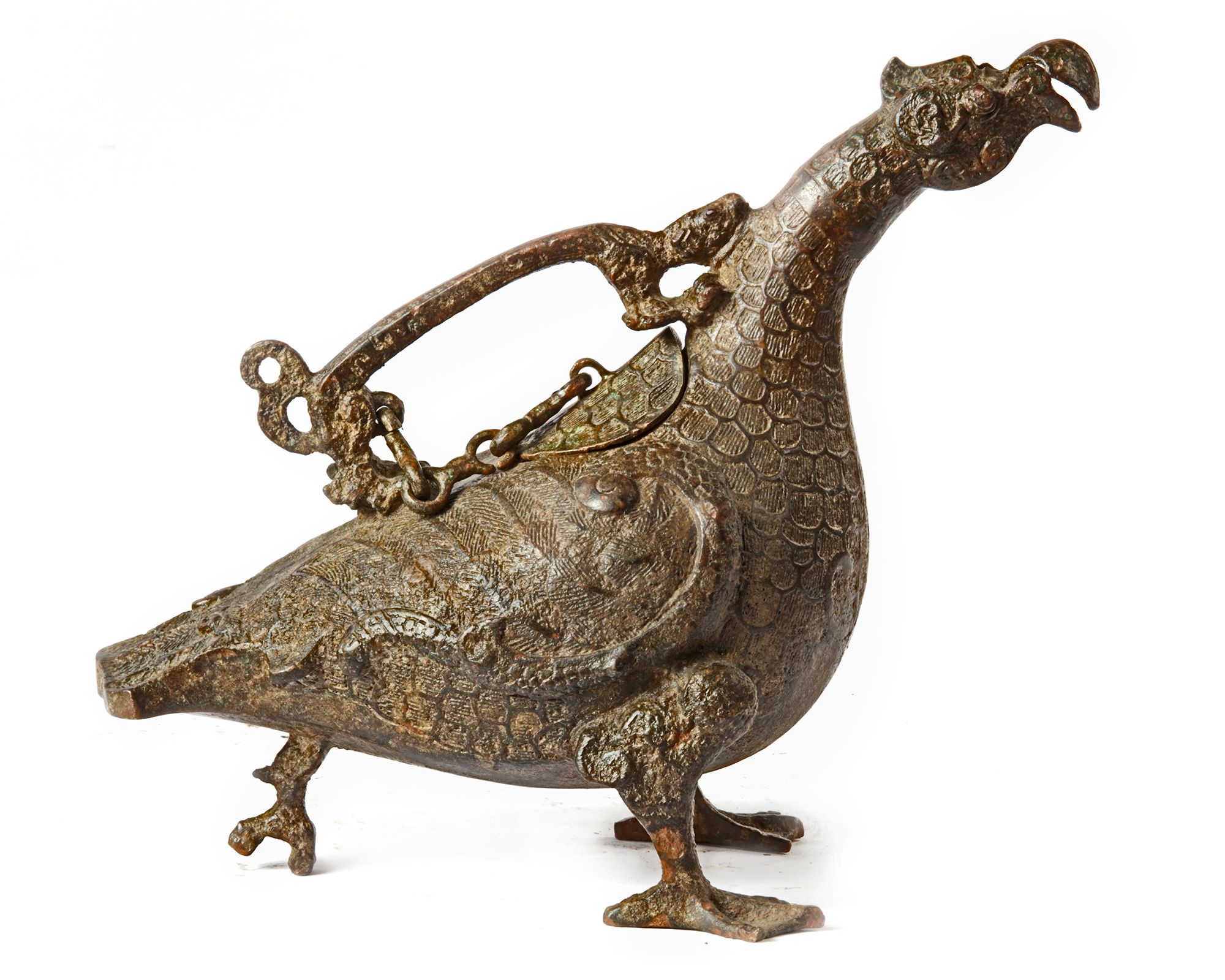 This unique and superb rare bronze wine ewer is shaped in the form of a mythological bird. Clearly it is nearly impossible to ascertain the type, but one can see that its feels at home in the water considering his membrane feet. Its heels are carved in a rather long and broad fashion to facilitate the ewer’s stability. Most likely this is dodo bird extinct in Europe in the 17th century and originating from Asia where it has most likely extinct in the Han period due to climate change. The dodo achieved wide spread recognition form its role in the story of Alice’s adventures in Wonderland and it has since become a fixture in popular culture often as a symbol of extinction and obsolescence. The bronze head serves as a sprout and it is cast with a pair of minute bulging eyes, crest on top of the head and hinged, hooked beak. The latter opens automatically when the vessel is tilted forward. The head seems separately cast of the body, carved in relief with striated petal-shaped scales simulating feathers. Traces of silver and gold inlay are found in this area. A pair of feathery wings in high relief, almost executed like spiraling snakes is placed along his body. The voluminous and hollow body terminates in a shaped tail that helps balancing the vessel. The bird’s backs carved with a circular cavity closed with a bronze lid with silver and gold traces. The latter is attached with a short bronze chain to a bronze handle, slightly curved and shaped in the form of a dragon. Its front claws and head are fixed into the bird’s neck, suggesting biting the bird, while both dragon’s hind legs are inserted in the back of the bird. A short tail is curling upwards in a S-shape. The bronzed bird must have been cleaned at some moment in time, however, still traces of green and reddish-brown corrosion and silver and gold inlay are to be found all-round this unique ewer.