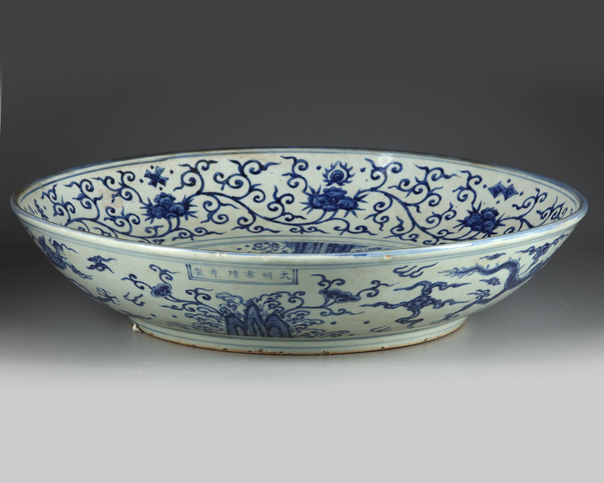 The exterior with two dragons chasing a flaming pearl with a Chinese Jiajing six character mark.