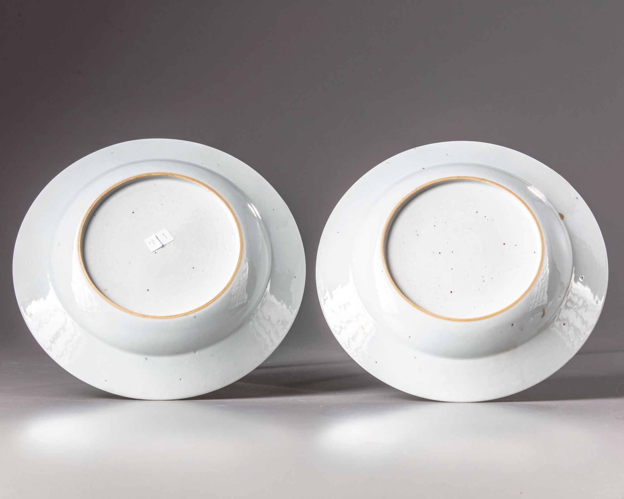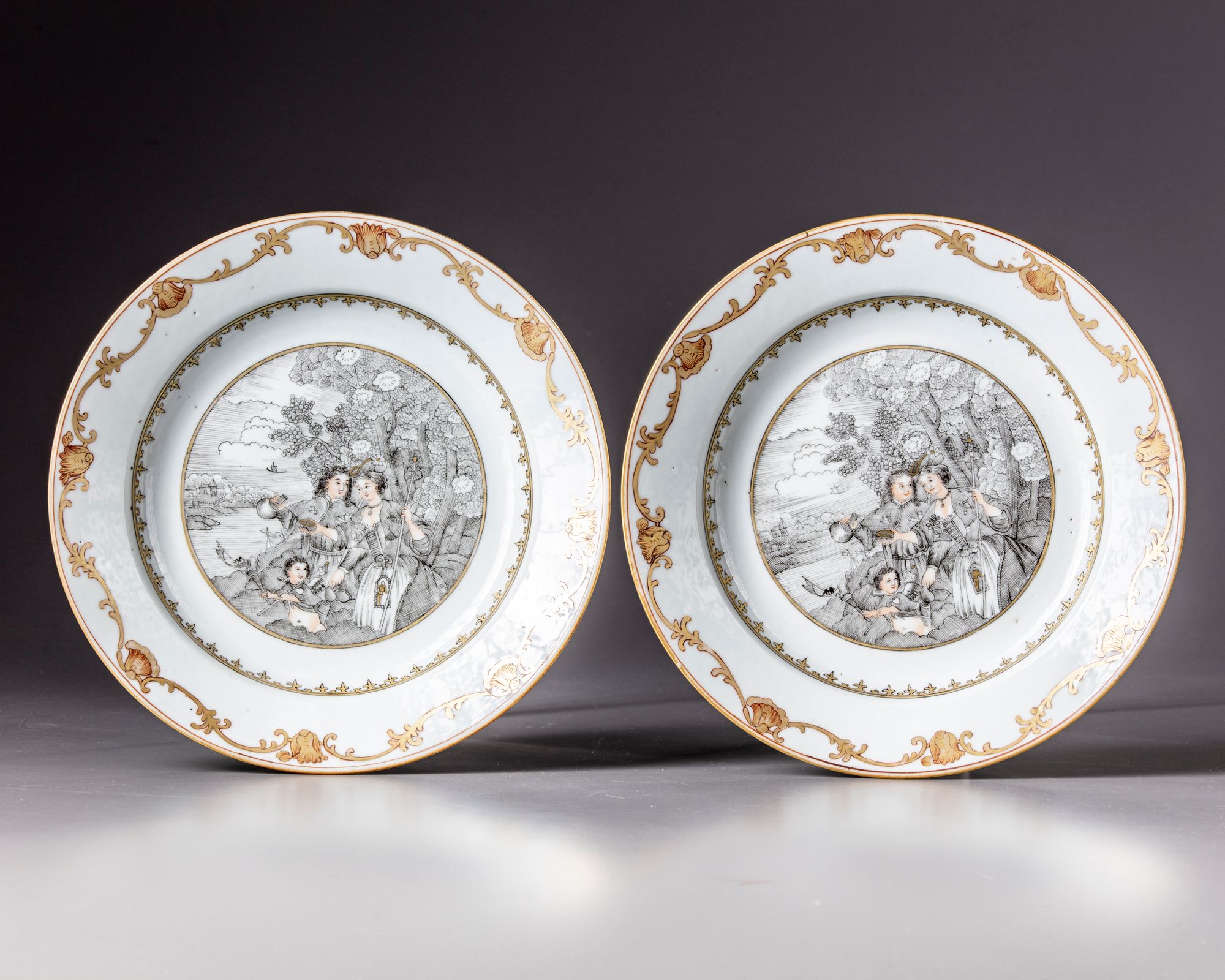 The dishes are decorated with a gilt roundel enclosing European figures amongst trees.The rim with a gilt flower scroll.