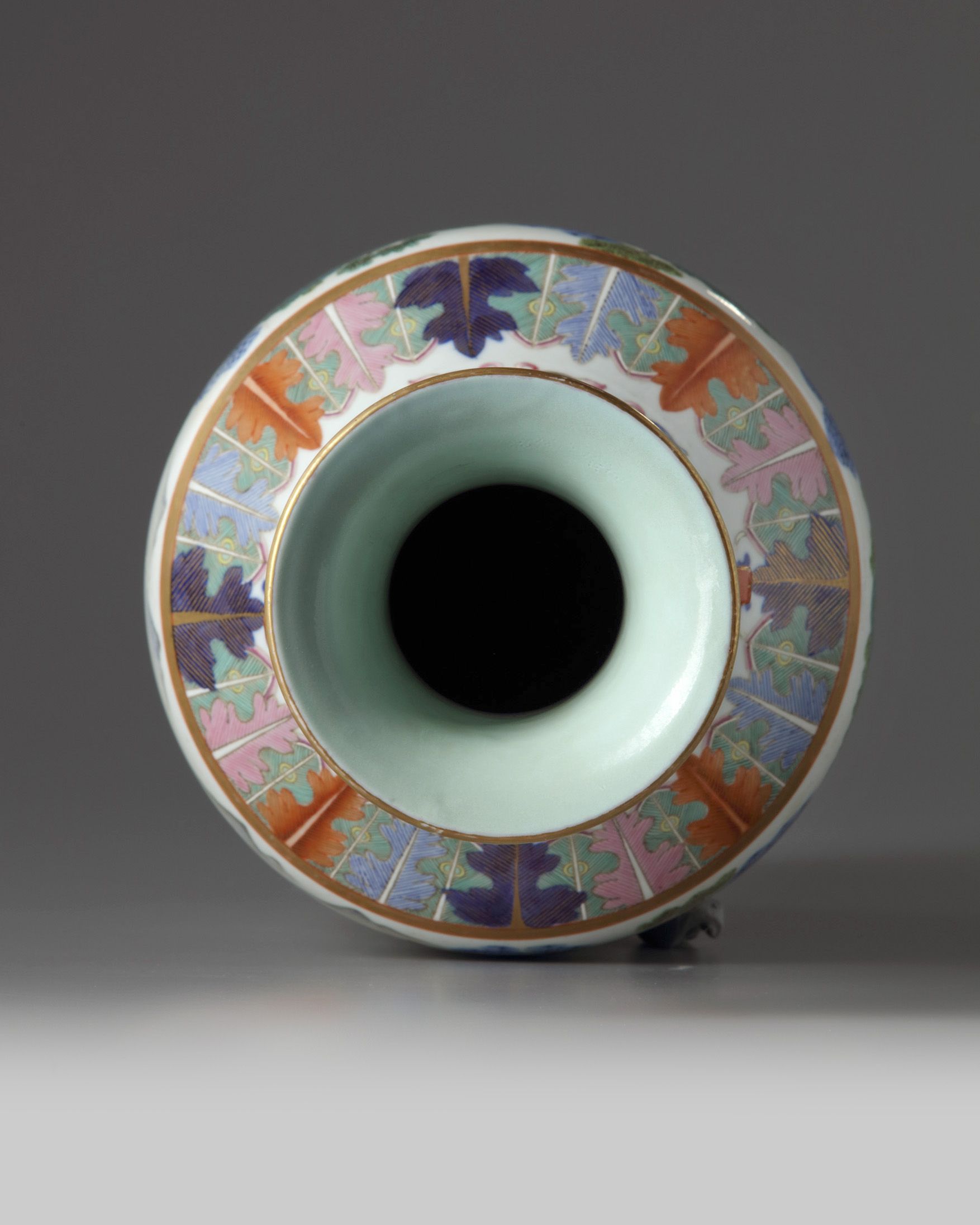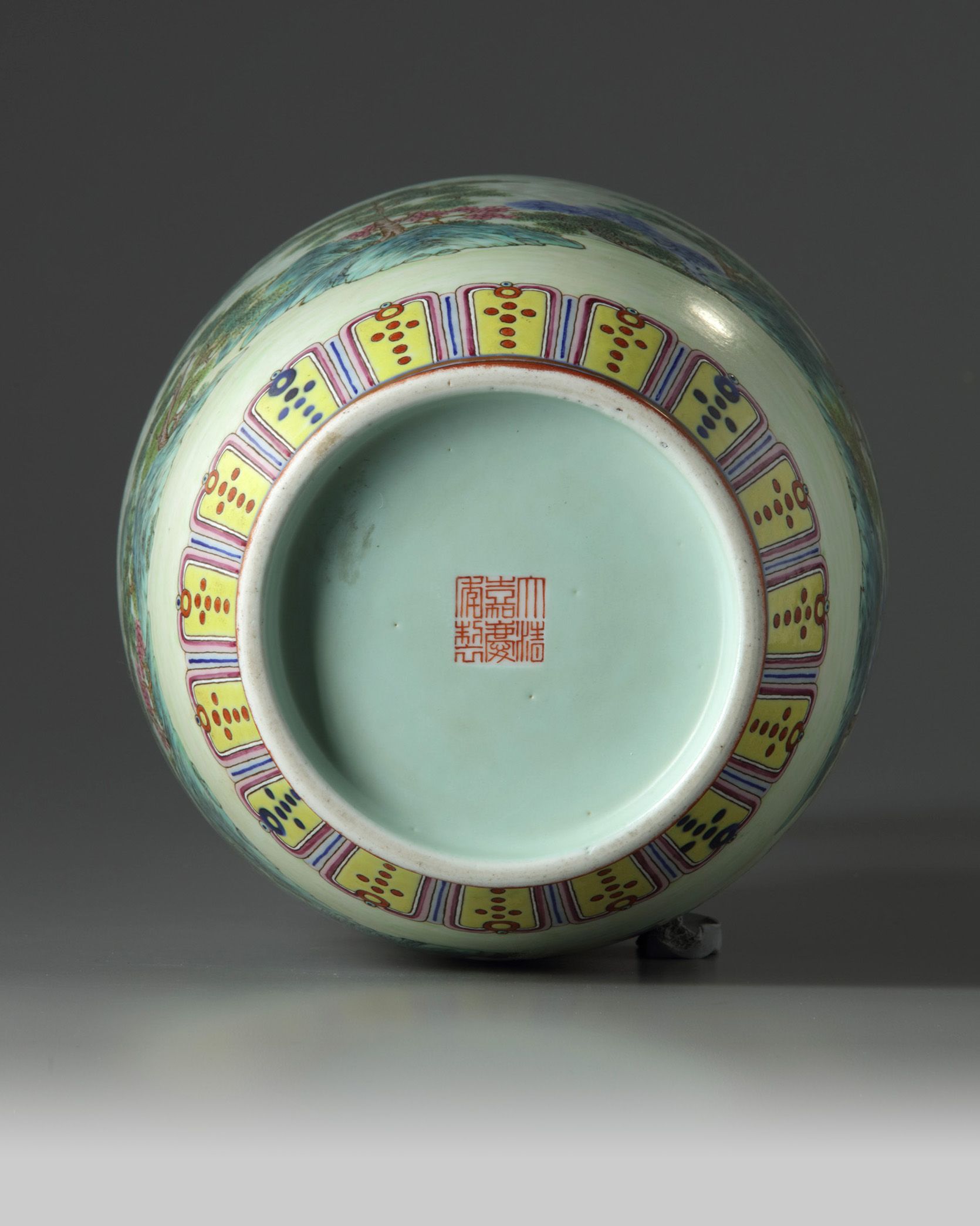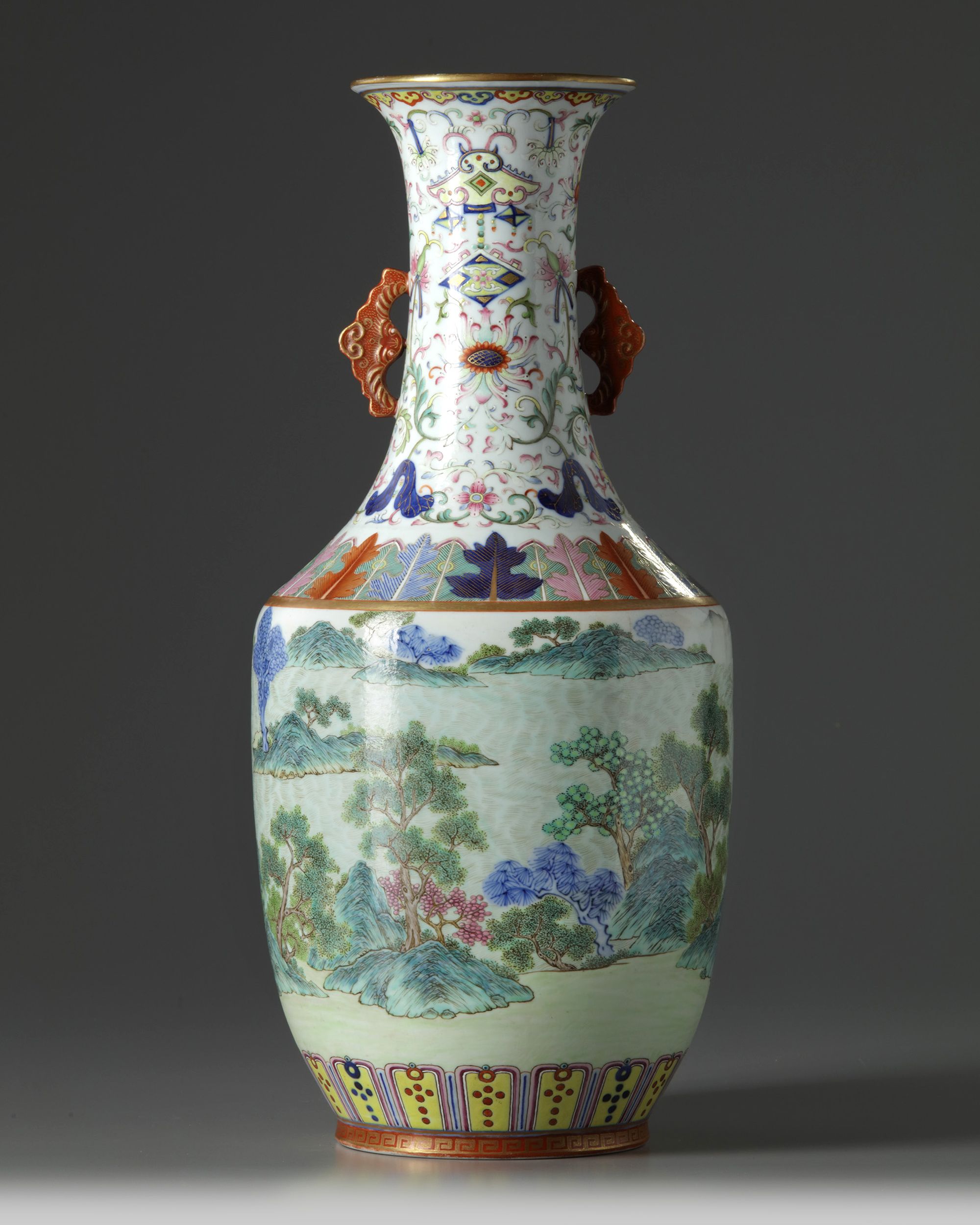 The vase is decorate with two gilt and iron-red bat handles to the neck. The body is decorated with a continuous scene of boys in a dragon boat competition in a mountainous river landscape, all below a band of stiff leaves to the shoulder. The neck is decorated with a chime amongst lotus scrolls The interior and base are glazed turquoise, with an apocryphal Jiaqing mark in iron red.