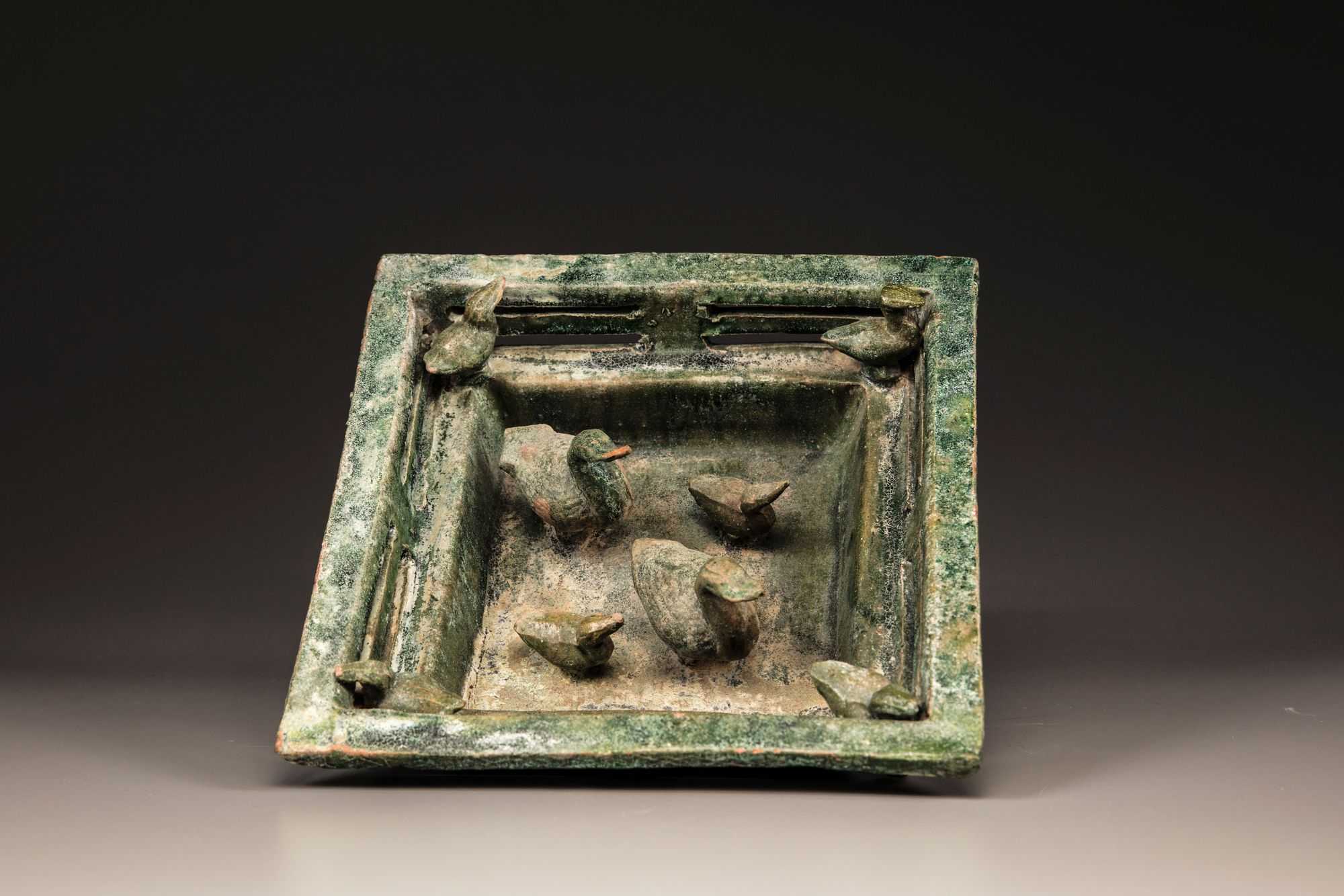 Condition: restoration to two of the corner ducks; chips to the extremities; oxidization and flaking to the glaze consistent with age.
