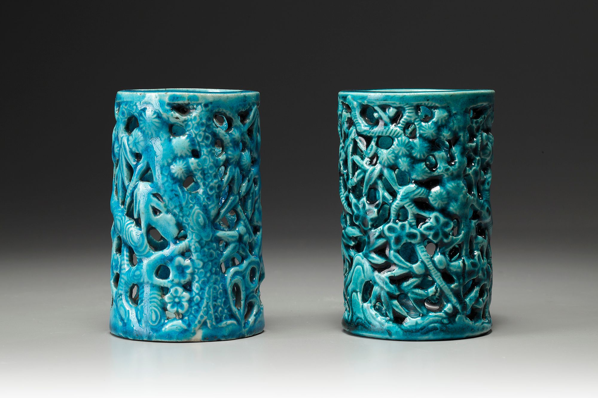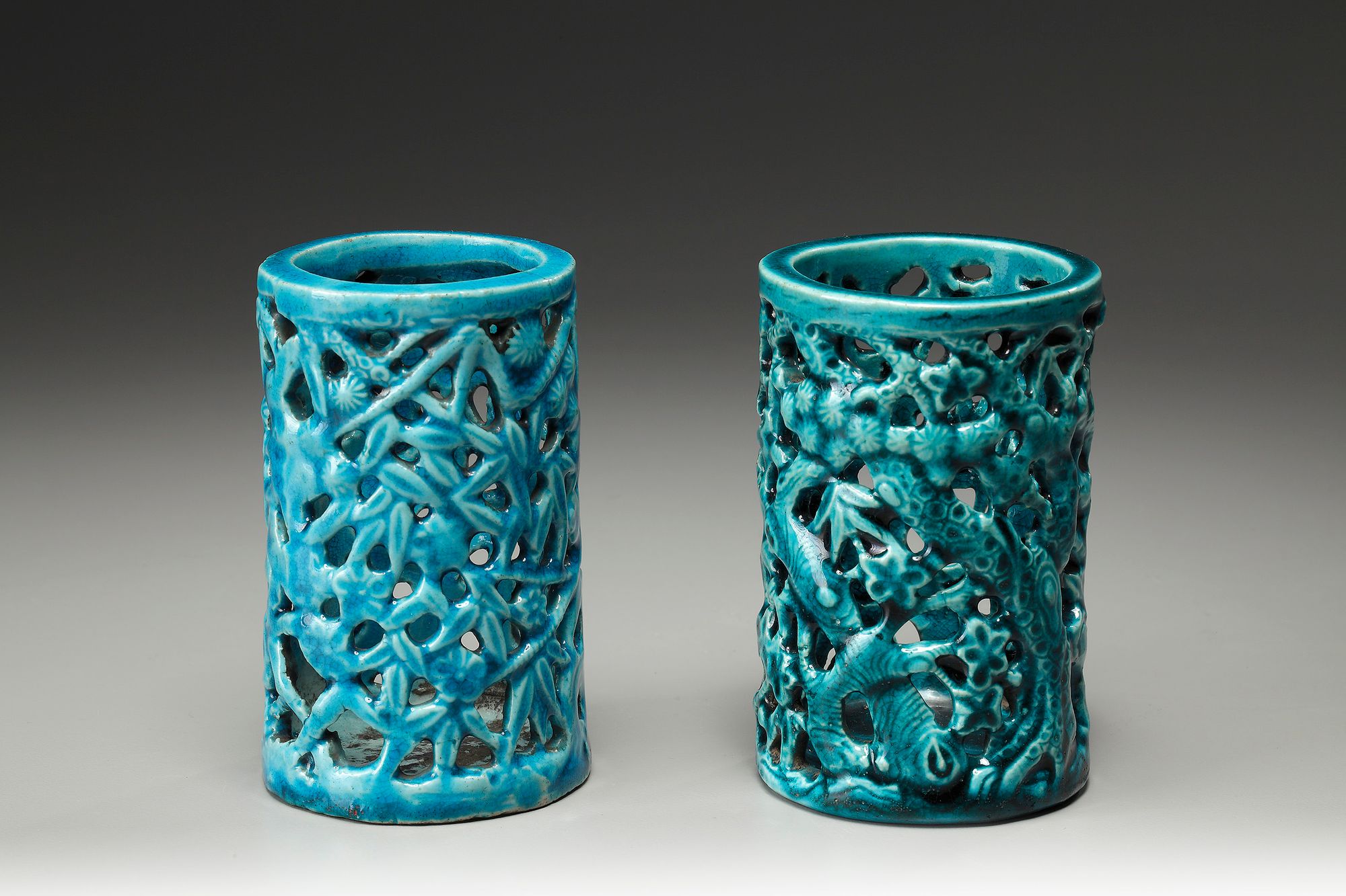 Each cylindrical brush pot is similarly decorated with the 'Three Friends of Winter' in openwork: prunus, pine, and bamboo, all within a plain band to top and bottom.