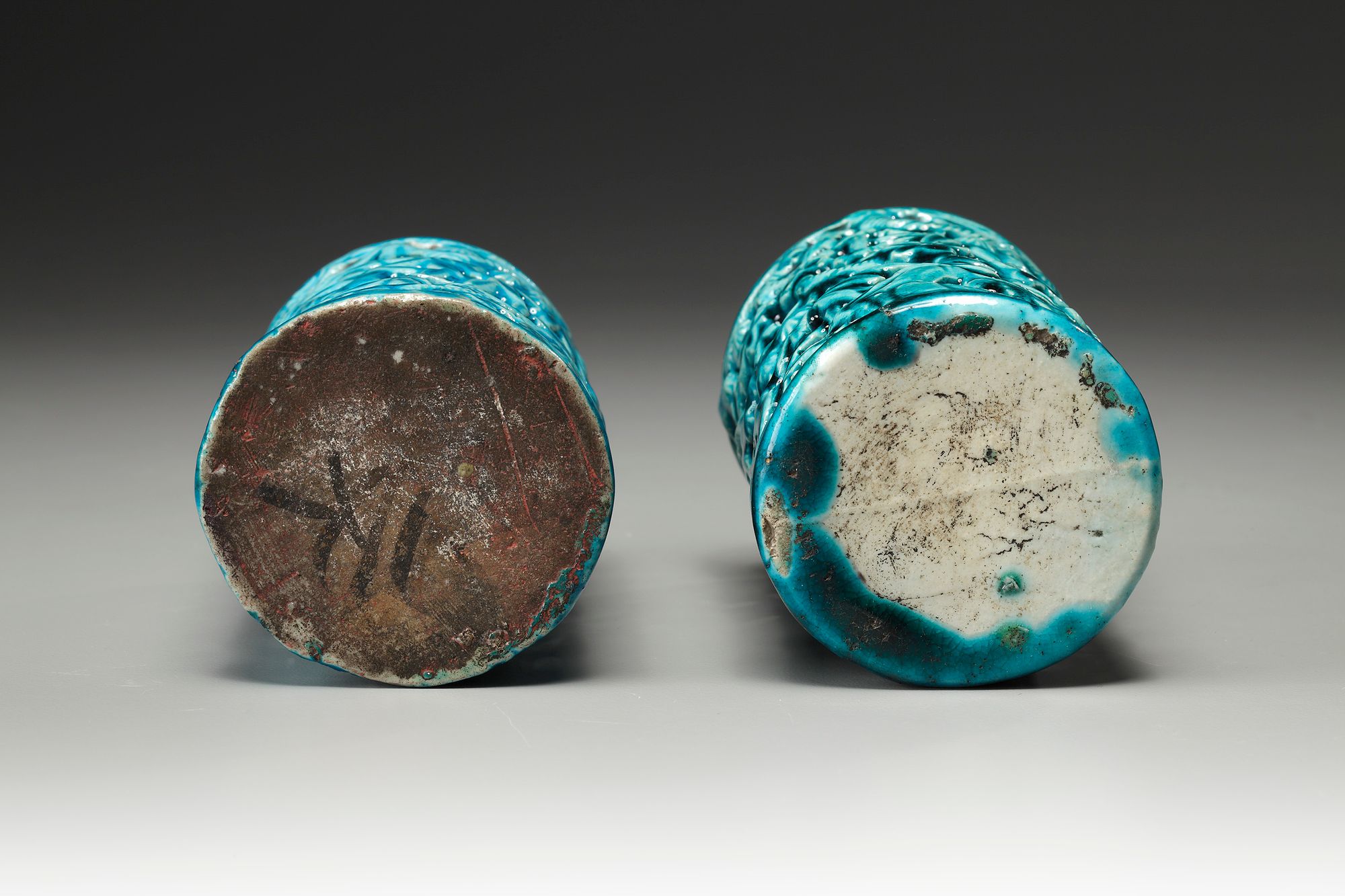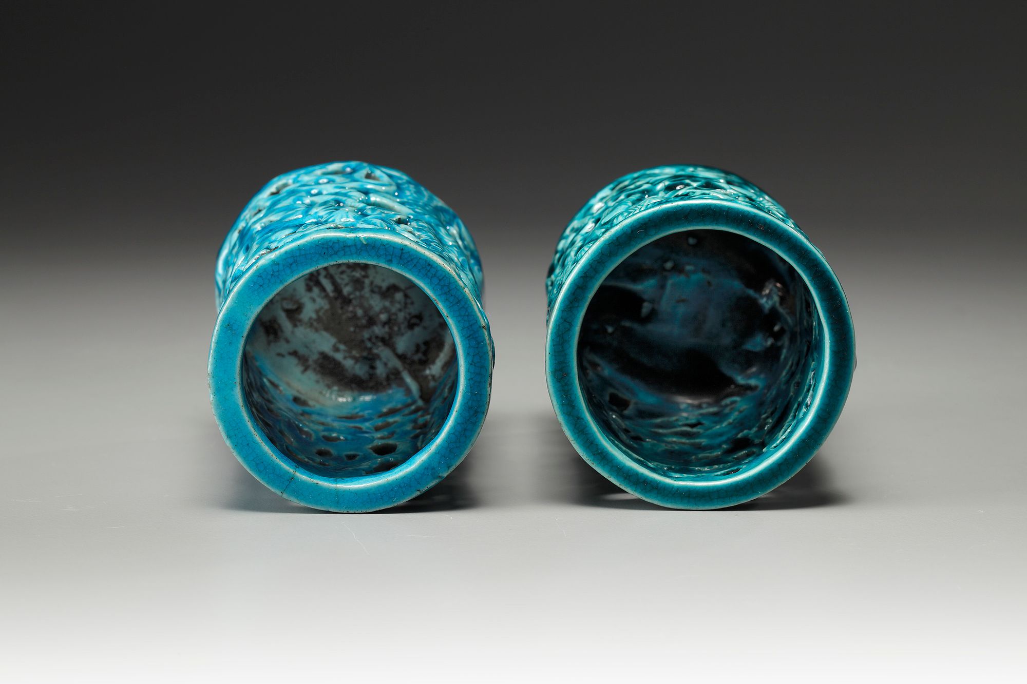 Two Chinese turquoise-enamelled 'Three Friends of Winter' brush pots, bitong