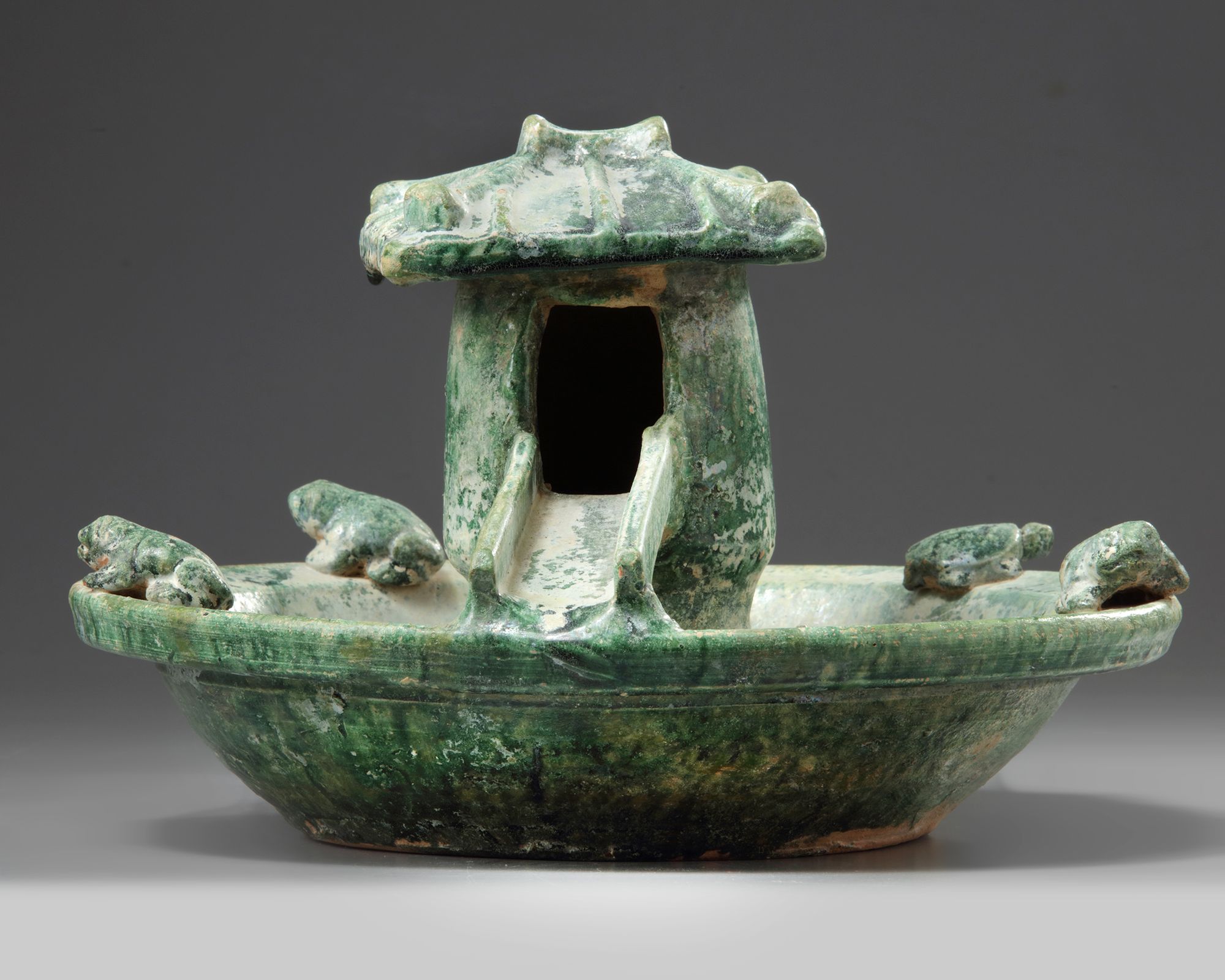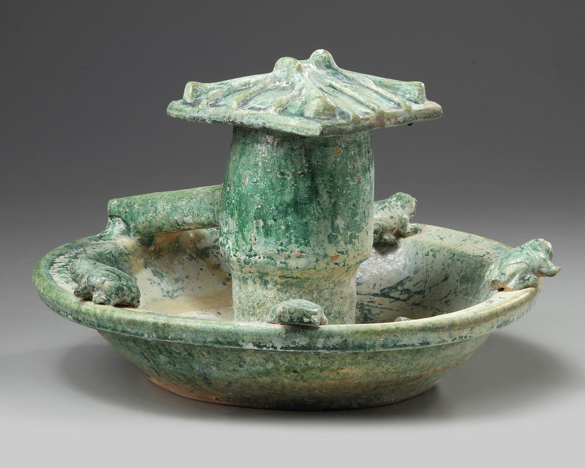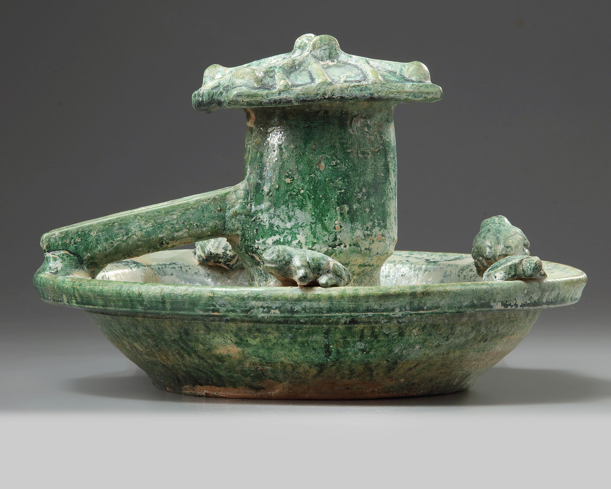 The vessel is modelled as a curved basin with four frogs perched on the rim, the centre with a pavilion rising from the interior.
