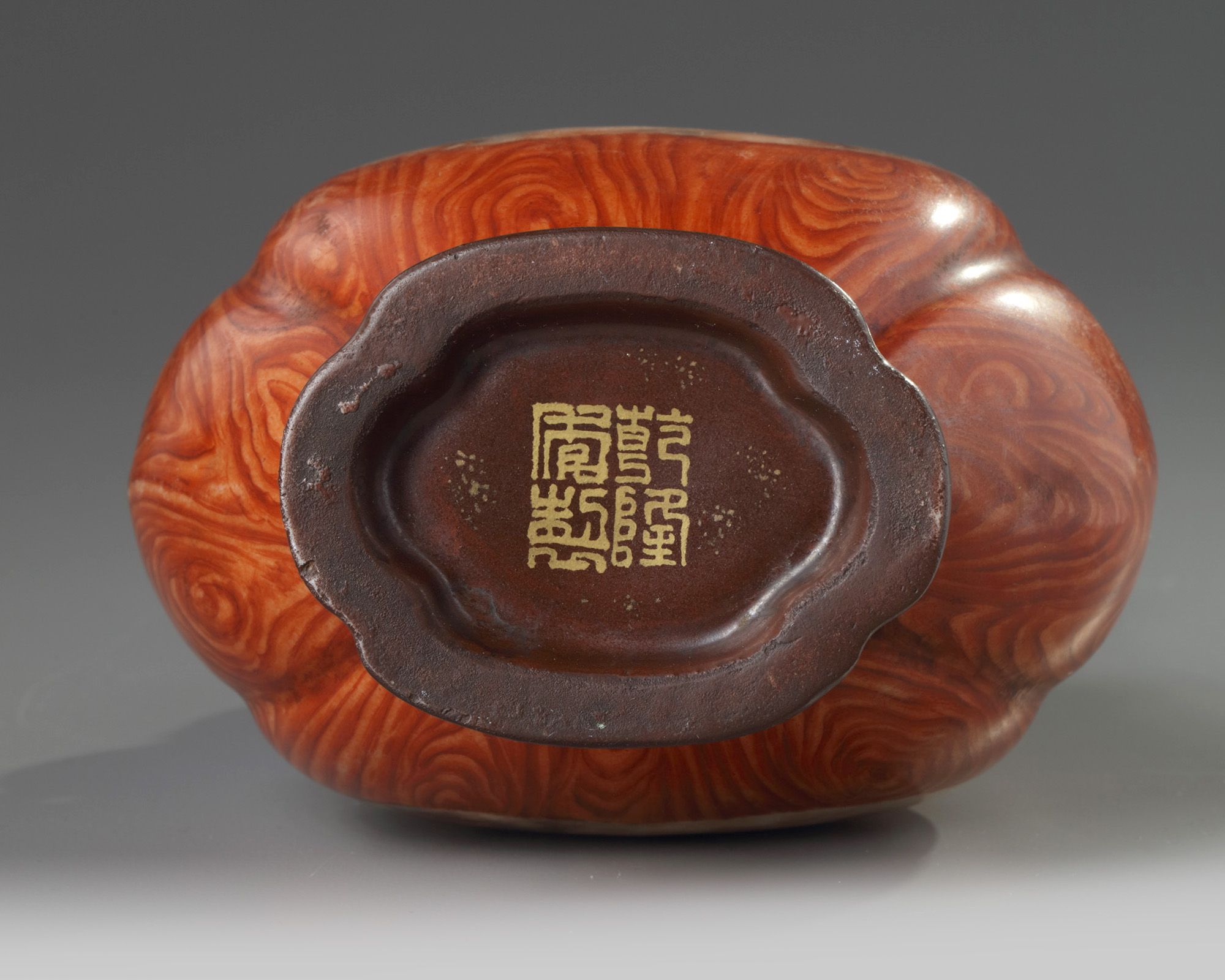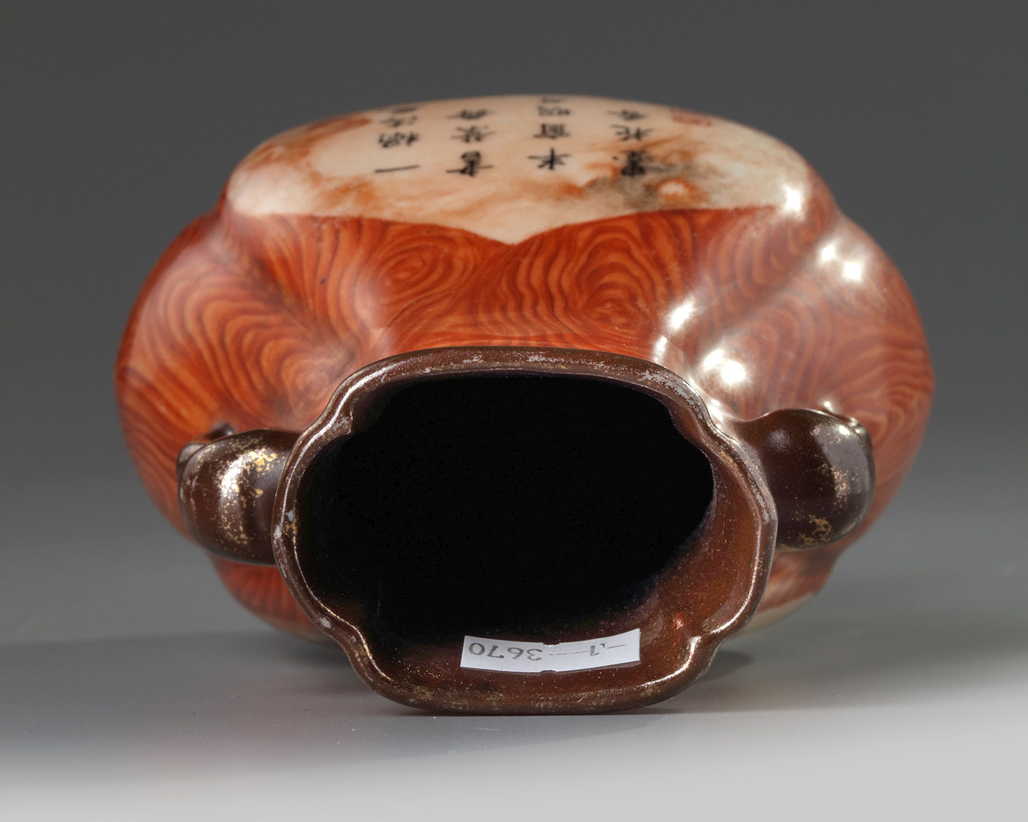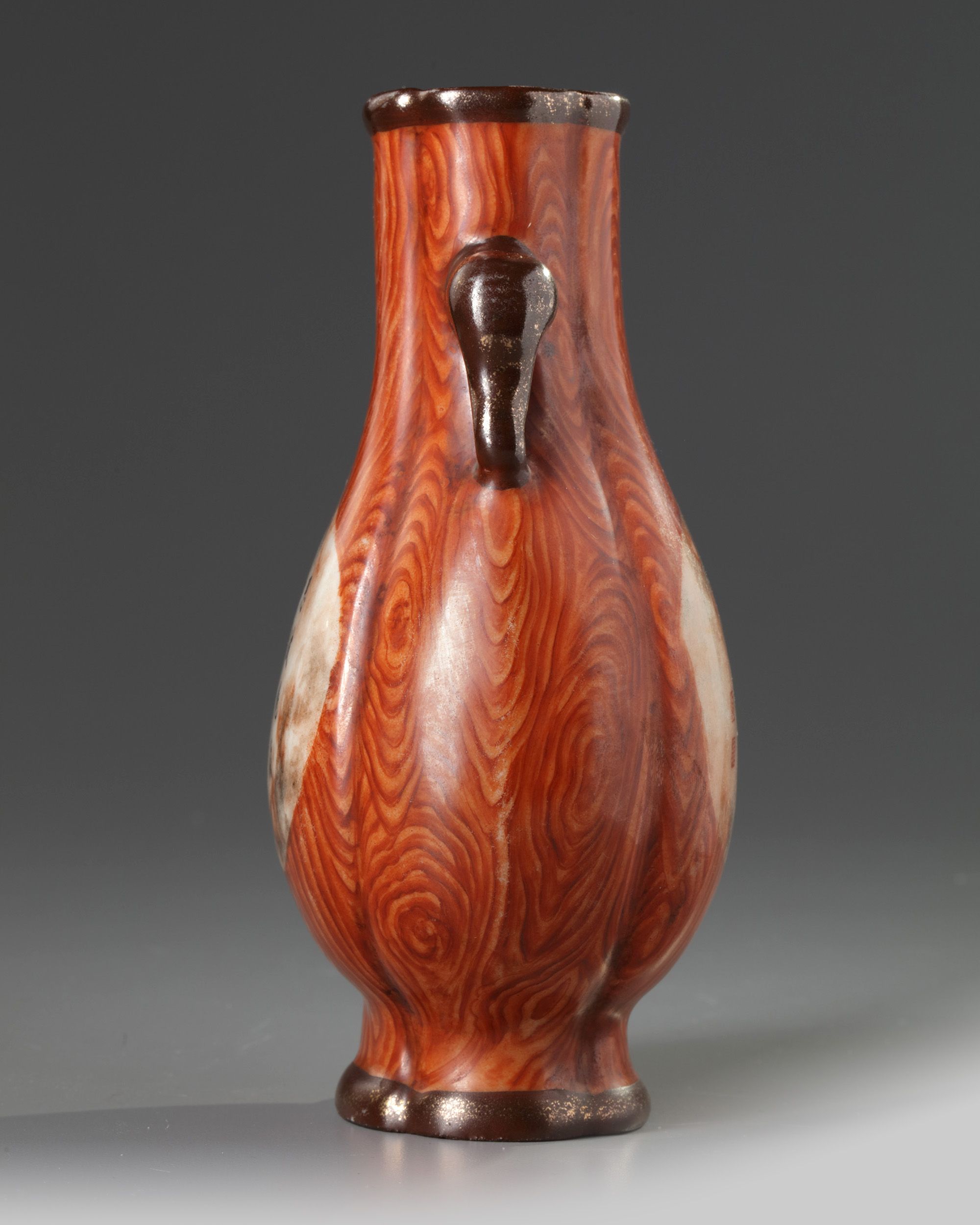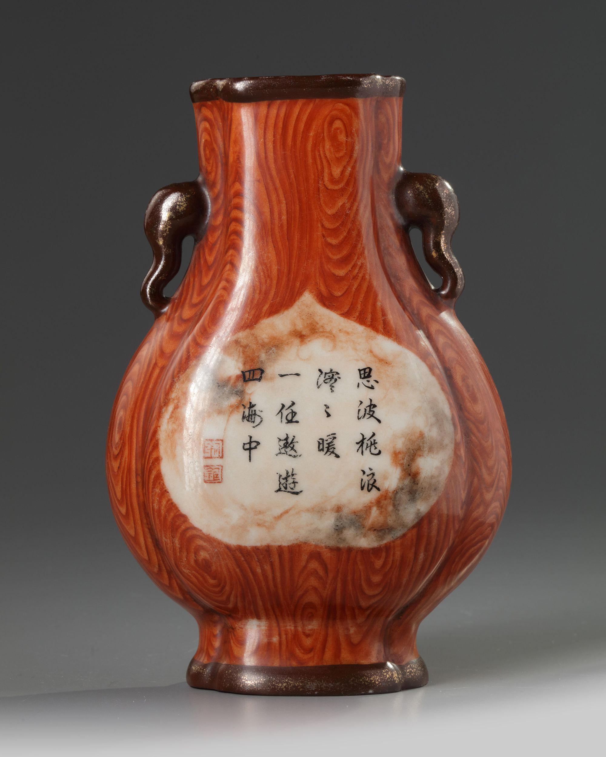 The vase is decorated with two elephant head handles to the neck, the body with moulded panels each enclosing a poetic inscription and two seals, all reserved on a mottled brown ground imitating wood. The base with an apocryphal Qianlong mark.