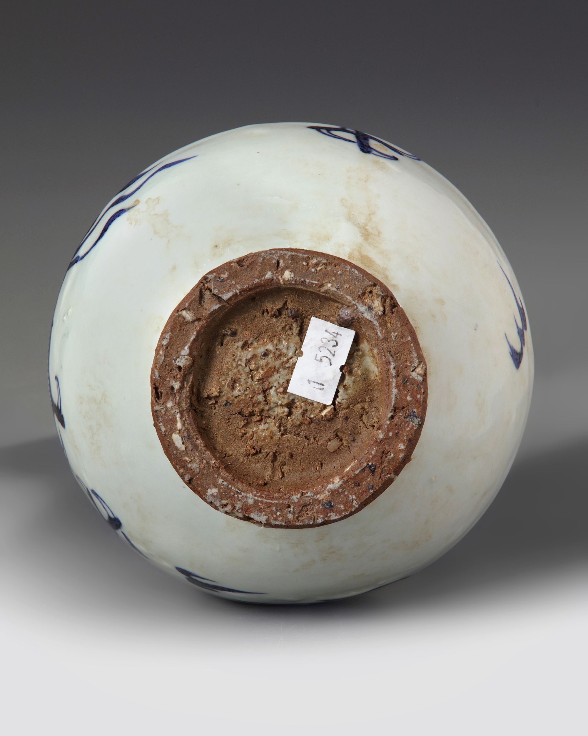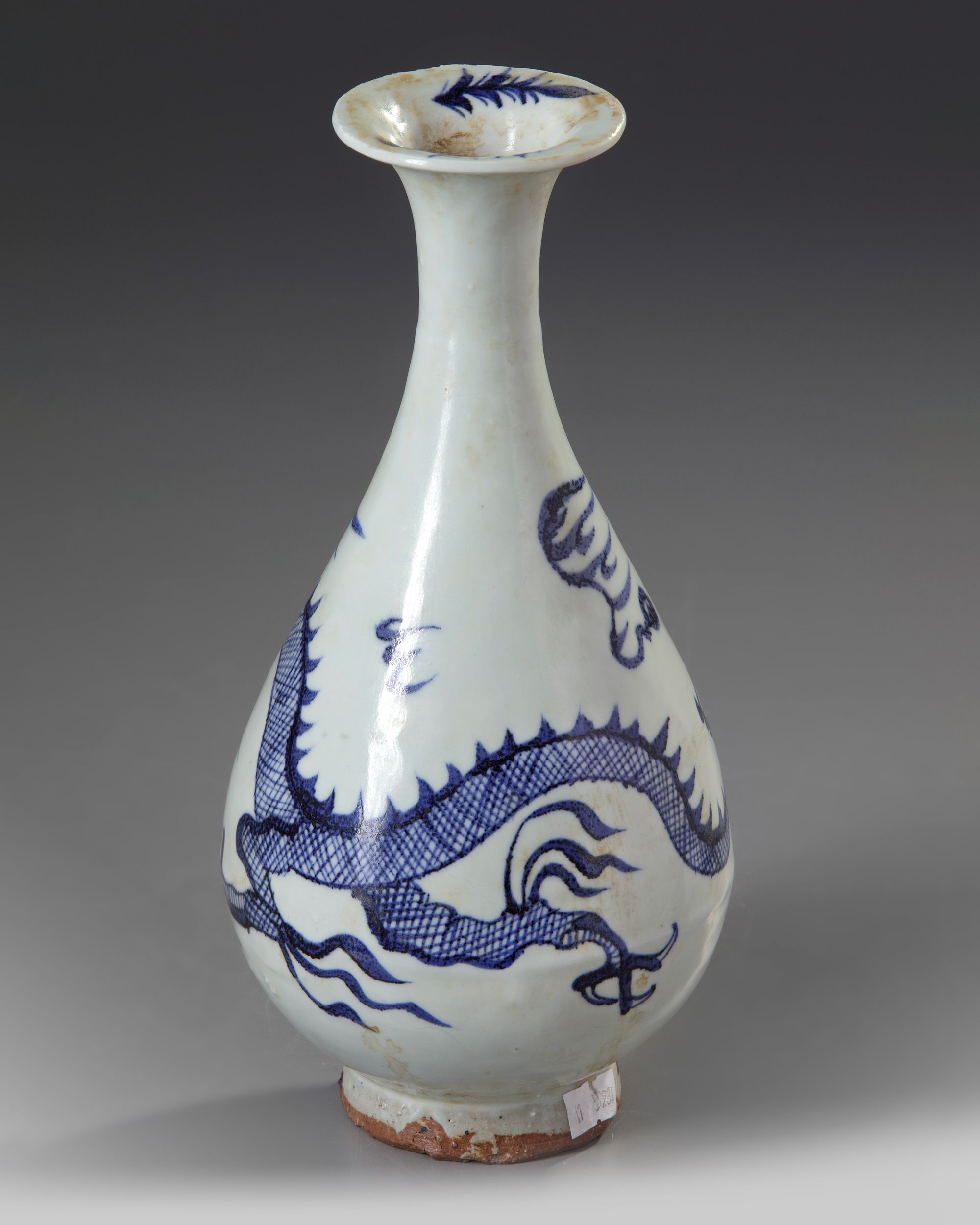 The full, pear-shaped body raised on a short, slightly spreading foot, rising to a slender neck and widely everted trumpet mouth, freely painted in vivid tones of purplish-blue cobalt with a powerful striding three-clawed dragon among flame scrolls in pursuit of a 'flaming pearl' with an unglazed base.