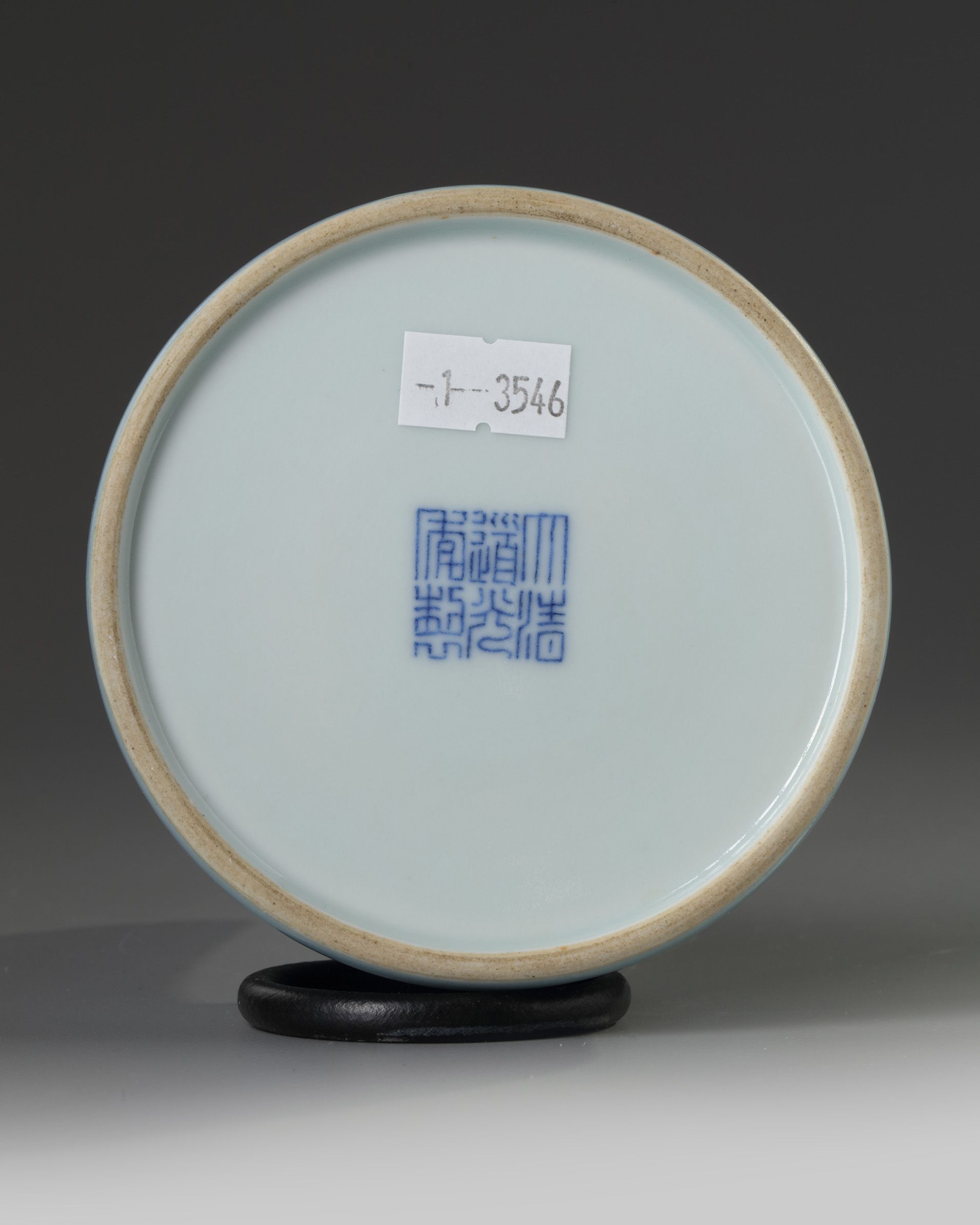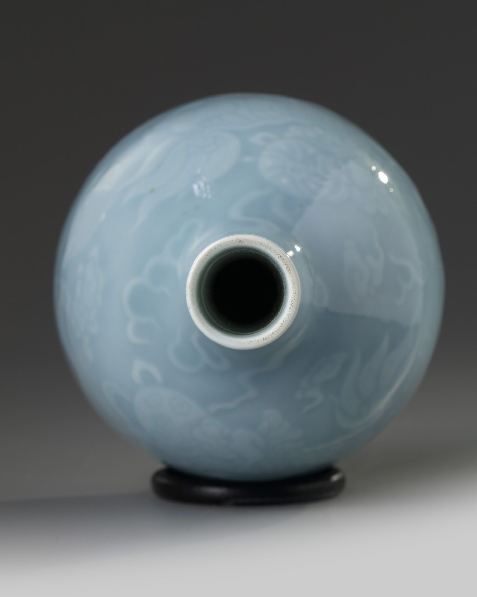 The vase is decorated in relief with two Buddhist lions at play with brocade balls amongst flame scrolls and clouds, all covered in a blue glaze. The white-glazed base with an apocryphal Daoguang mark.