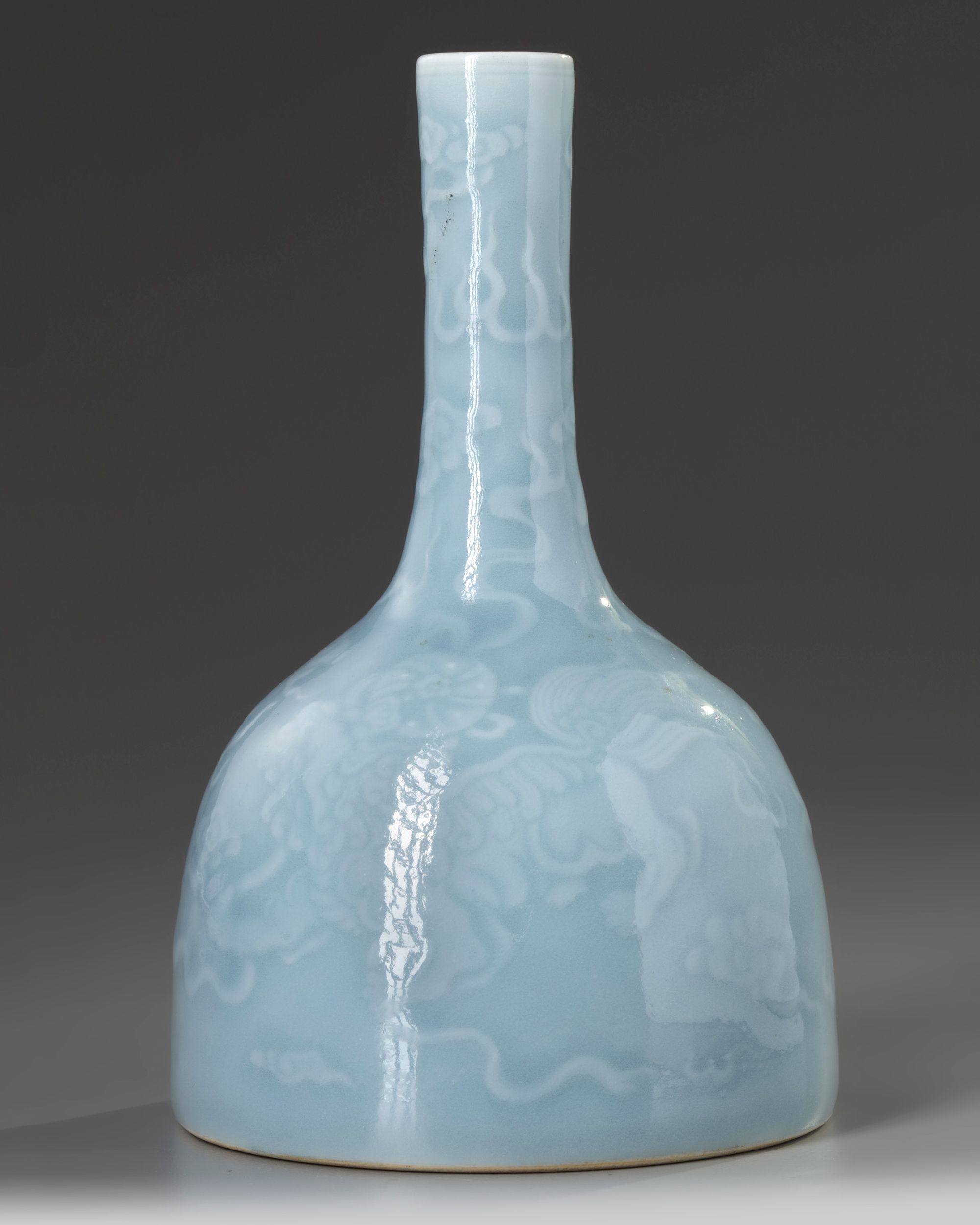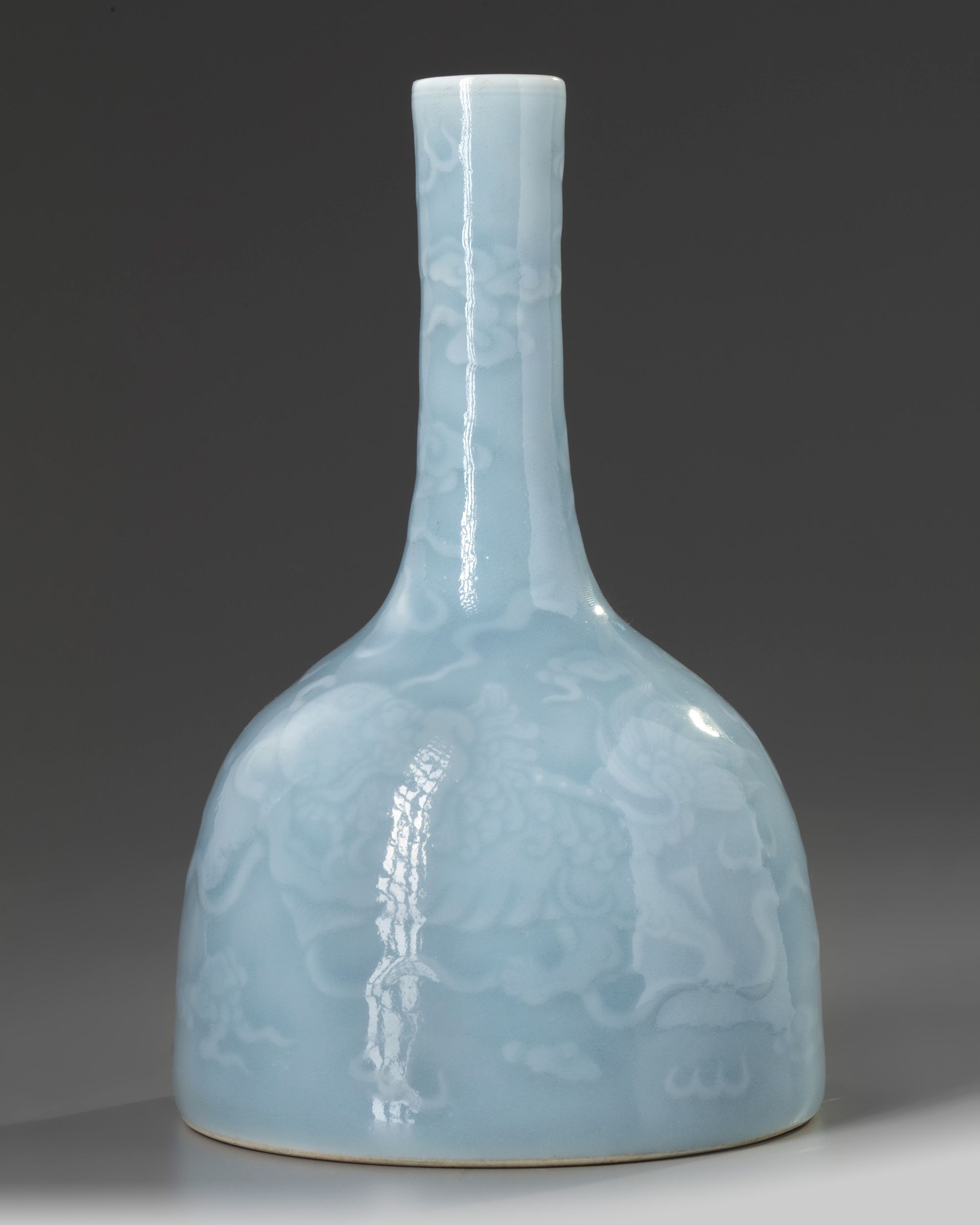 A Chinese pale blue-glazed 'Buddhist lions' mallet vase