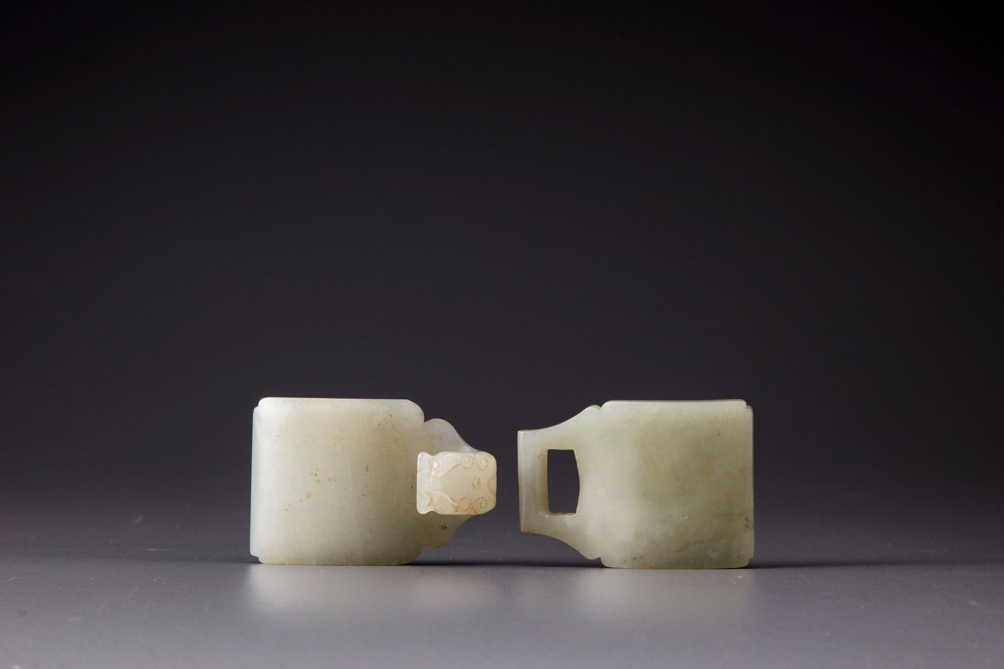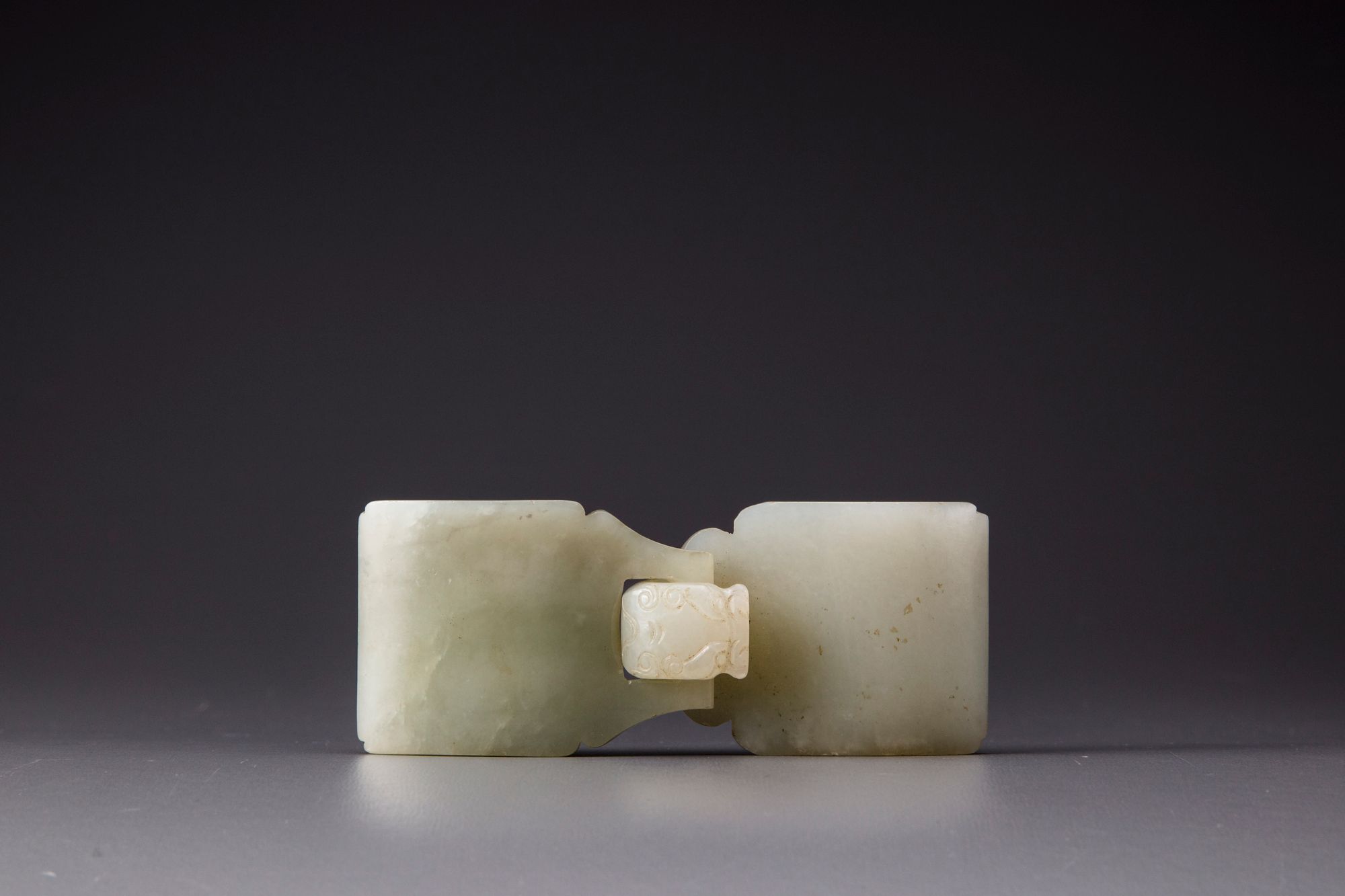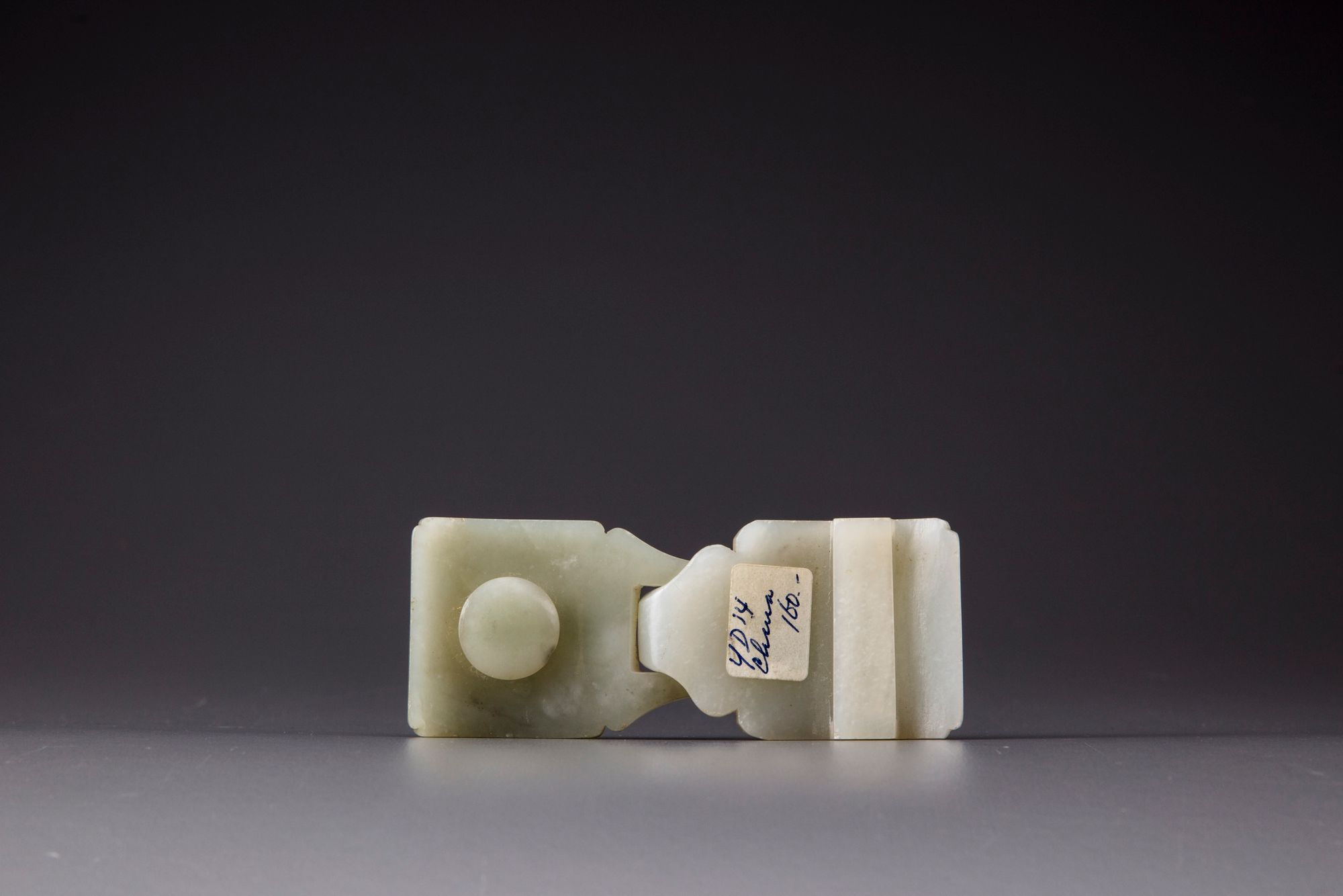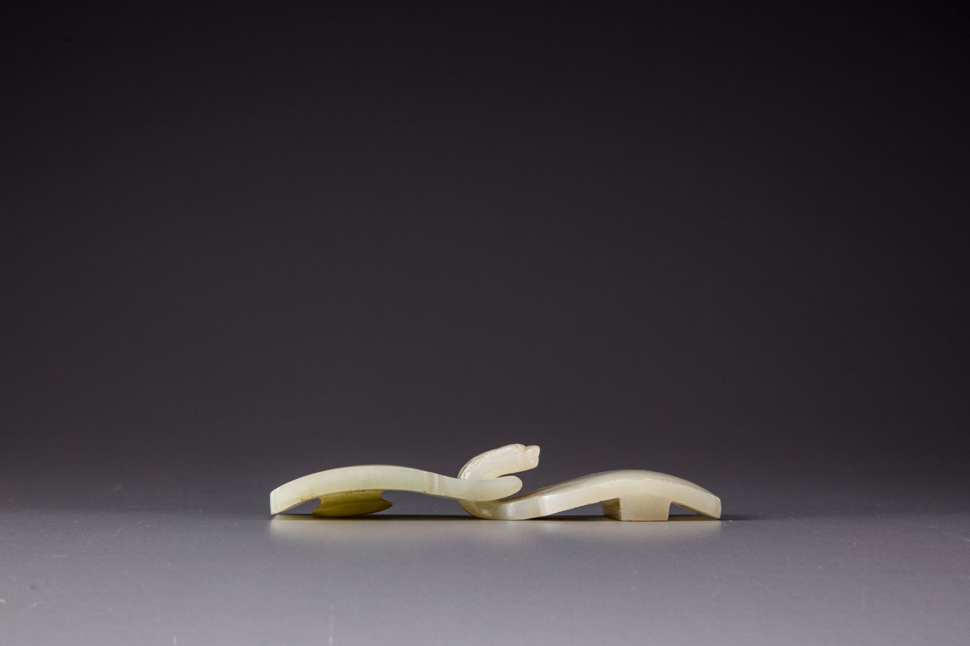 The elegant buckle is composed of two square-form sections with canted corners, one side with a finely carved dragon-head hook. The reverse of one side with a button, and the other with the rectangular aperture. The stone is of an even pale tone with an attractive patina.