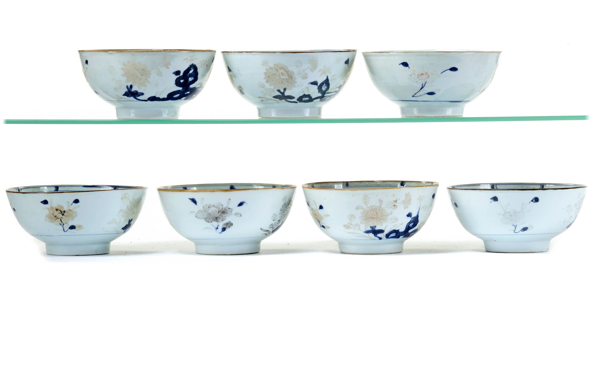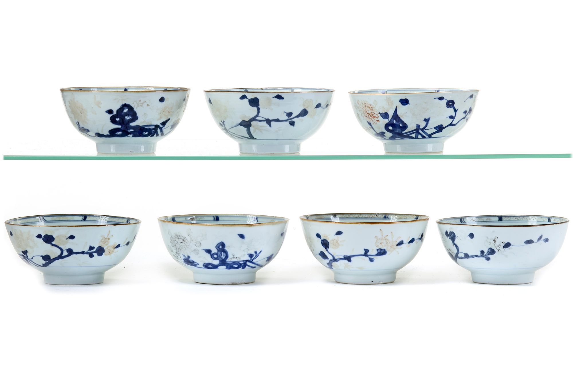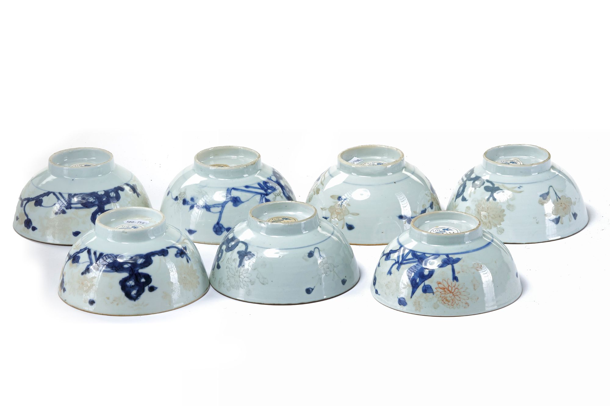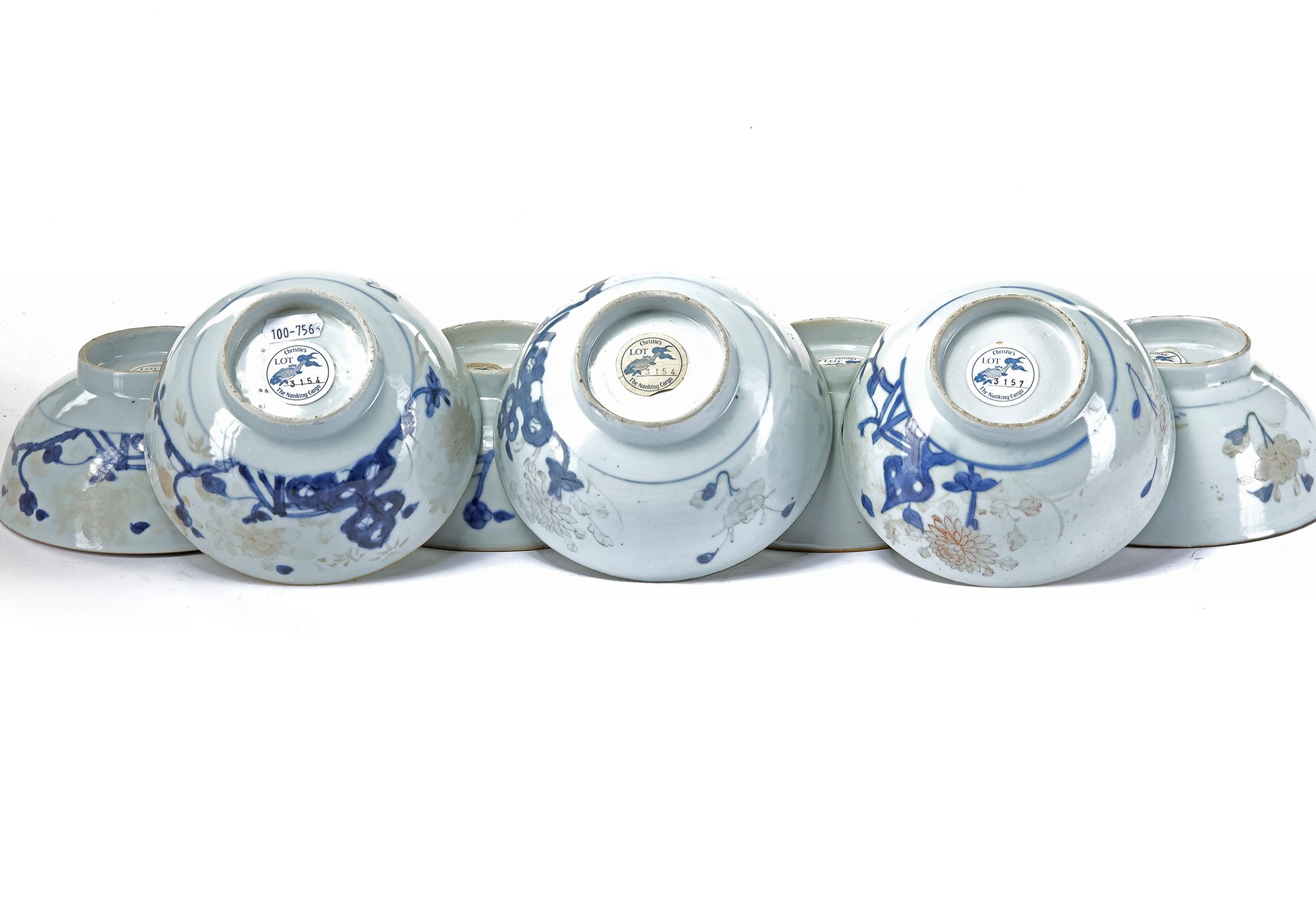 Chinese Imari bowls decorated in underglaze blue, and overglaze iron-red with the 'Peony Rock' pattern. Painted with peony, chrysanthemum, bamboo and flowering peach issuing from a rocky terrace on the exterior and a camellia spray in the interior below a trellis-pattern border. On the bowl the original Christie's The Nanking Cargo sale label proving it has been one of 240 bowls sold in lot 3154. Near all the gold and iron-red decoration have worn off. In total 2,779 bowls with the 'Peony Rock' landscape pattern, were sold divided over the lots: 3126-3157. (Amsterdam 1986) 7 by 15 cm.