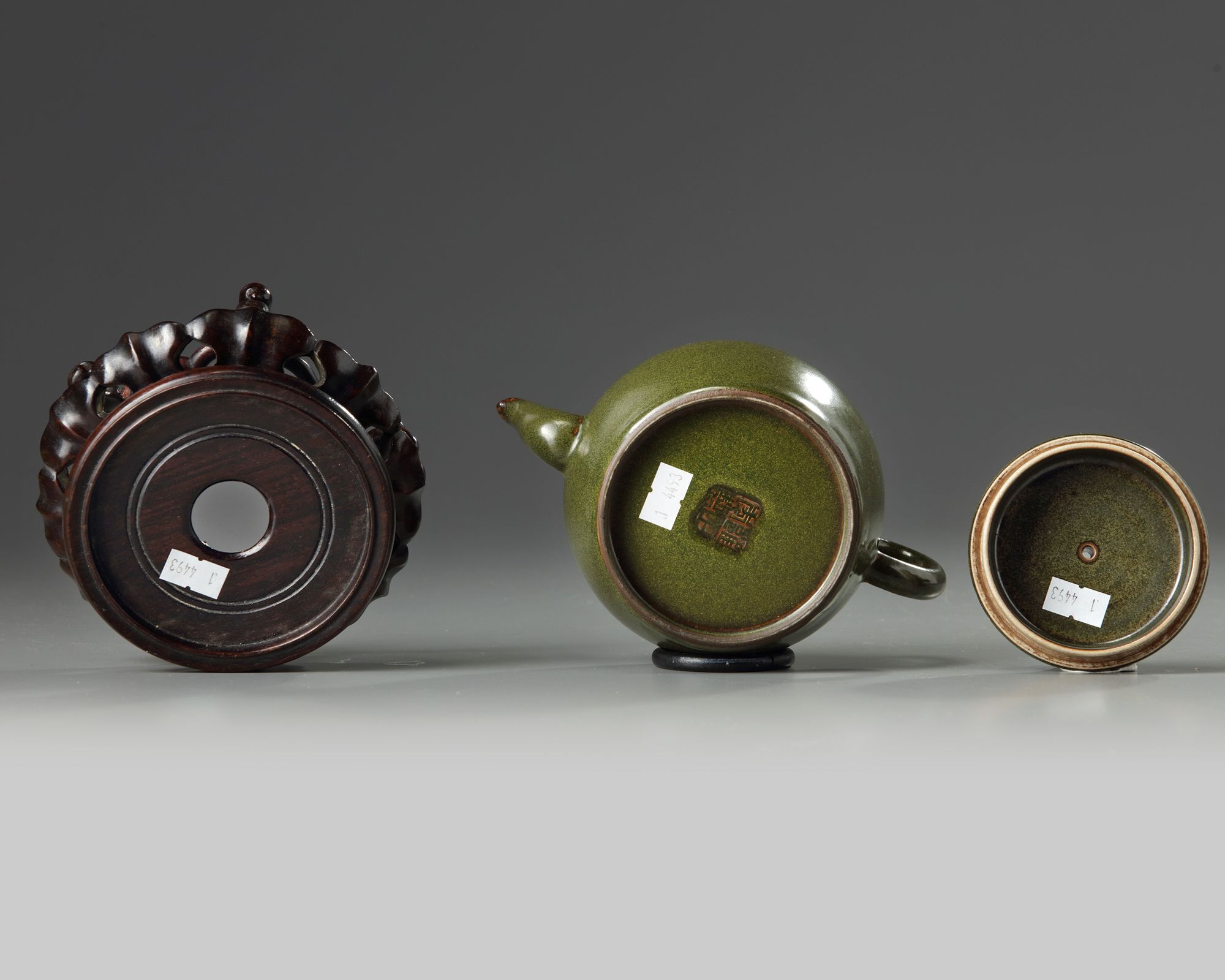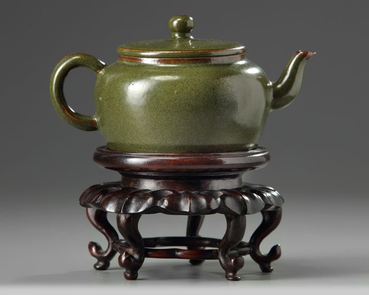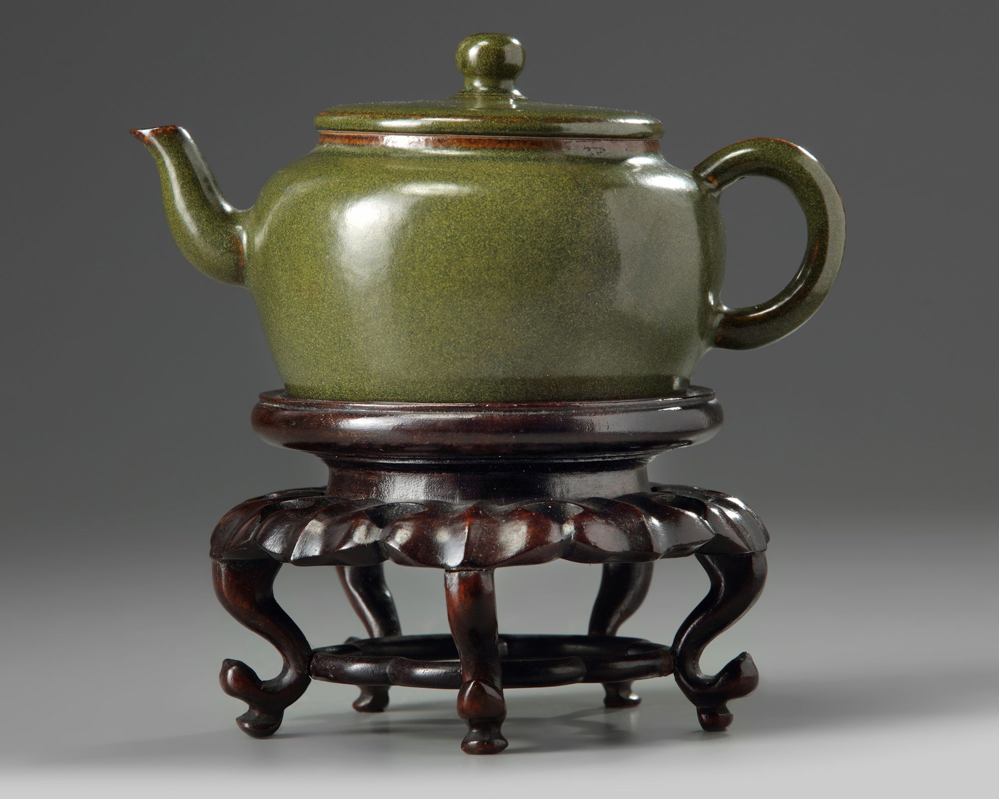 The teapot is fashioned with a c-shaped handle and an s-shaped spout. The base bears an apocryphal Yongzheng mark. The flattened cover is surmounted with a ball finial.