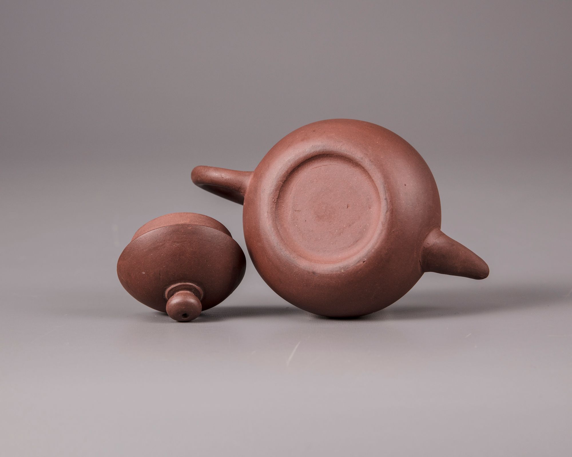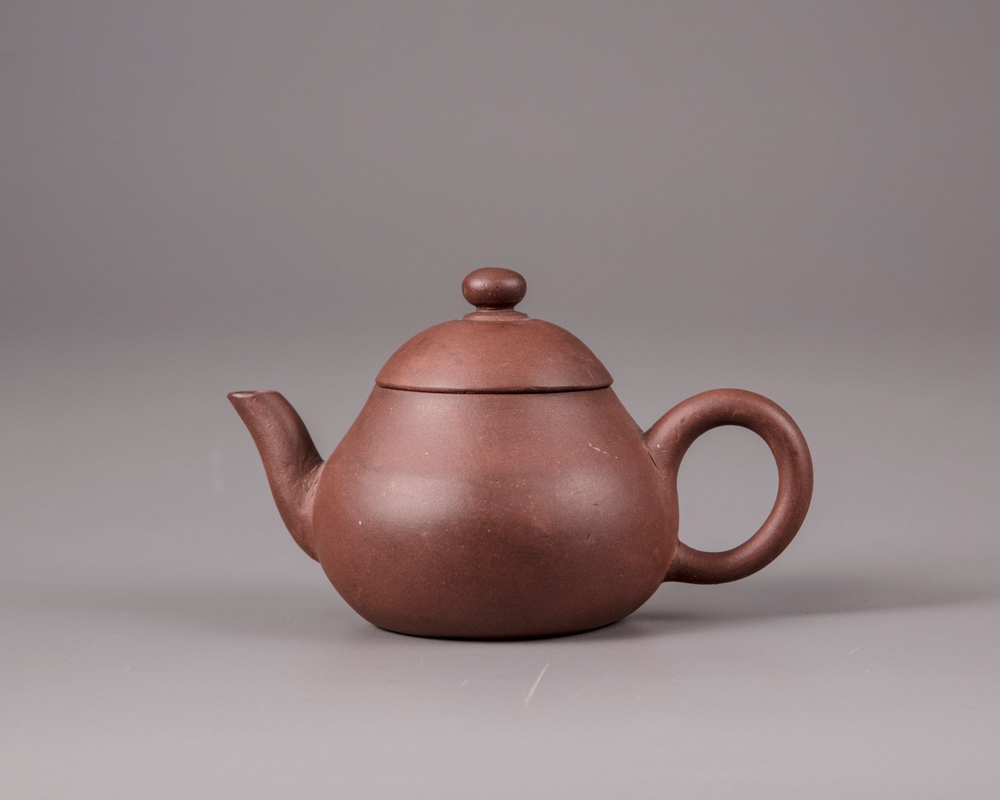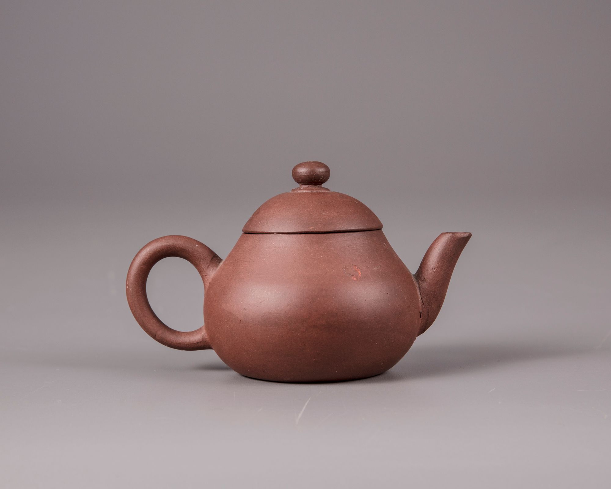 The teapot is affixed with a c-shaped handle and a slightly everted spout, the domed cover is surmounted by a knop finial.