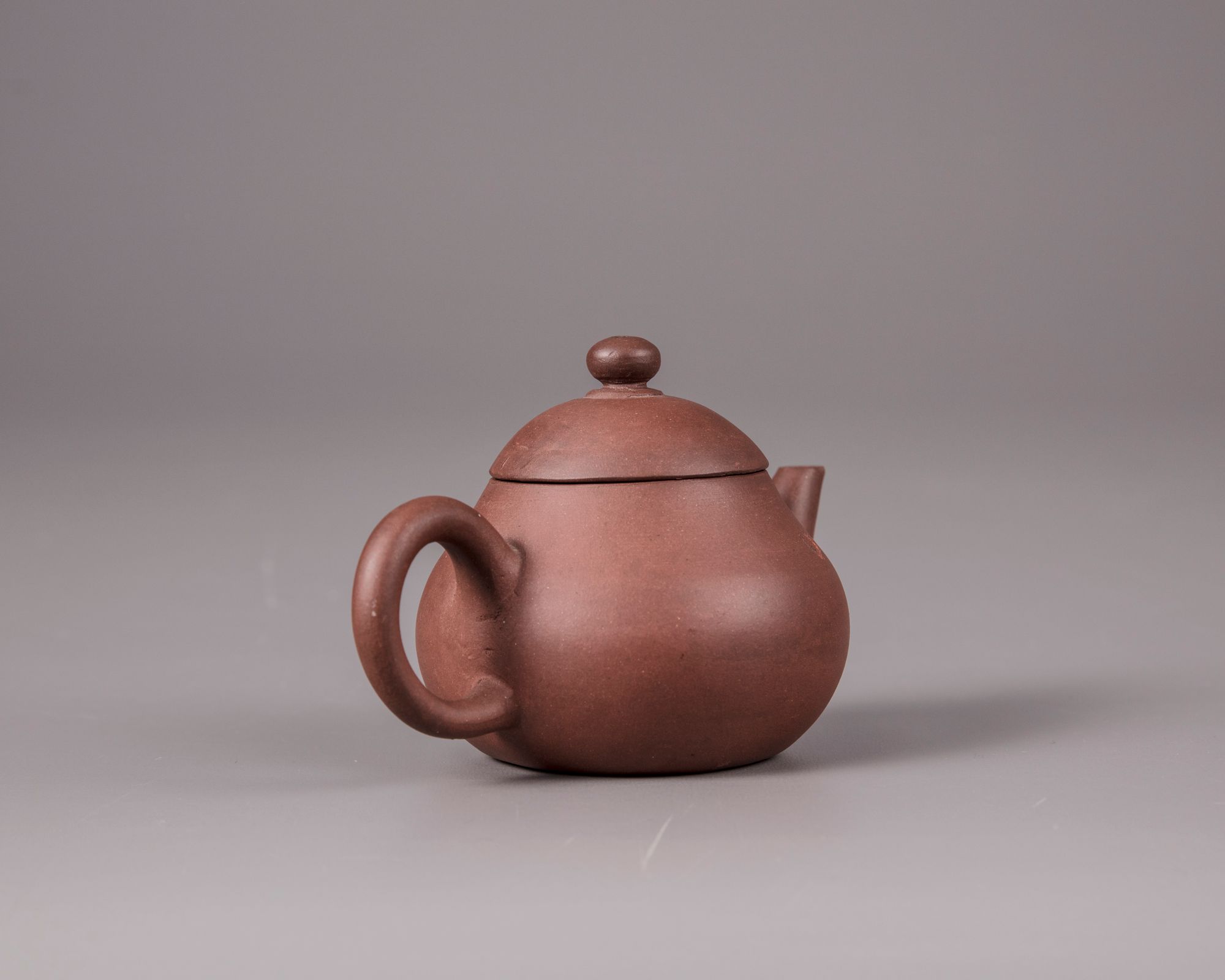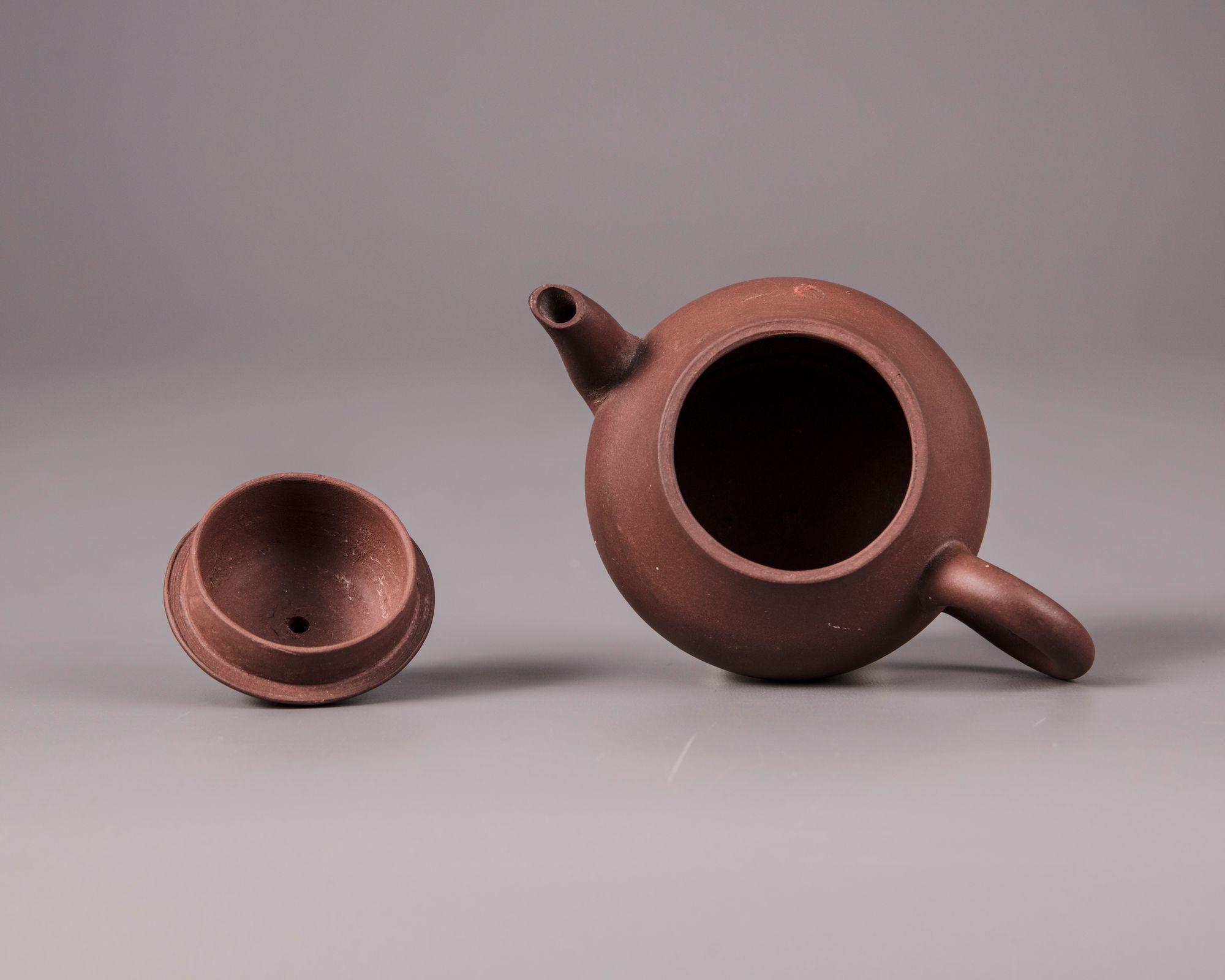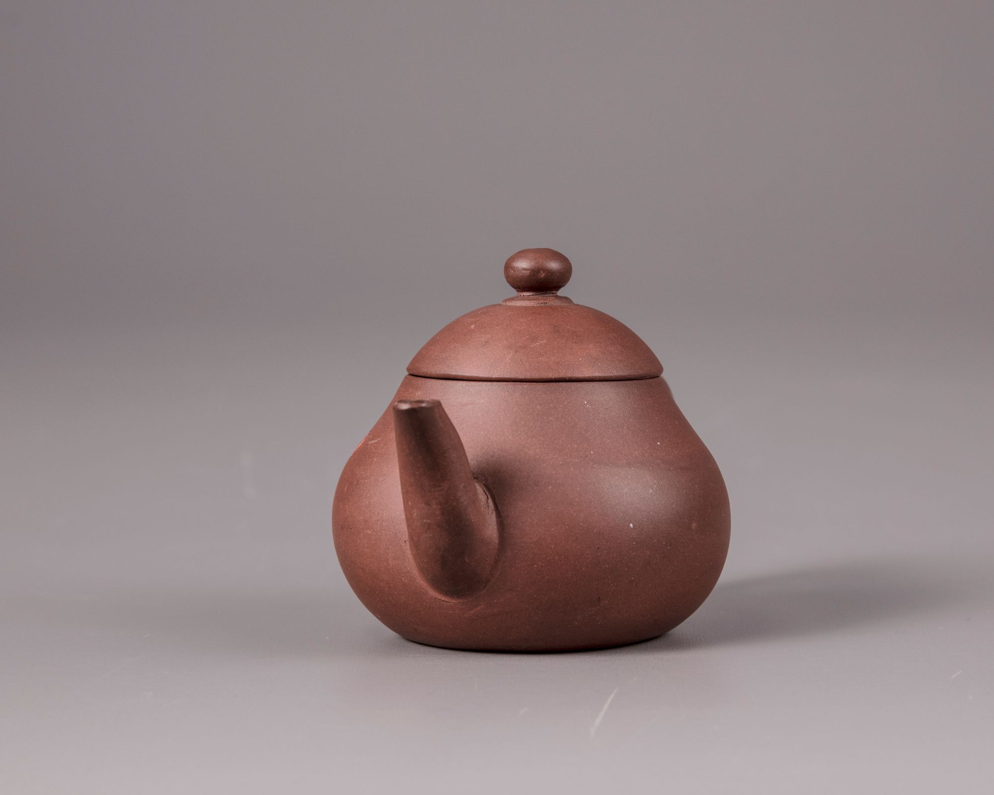 The teapot is affixed with a c-shaped handle and a slightly everted spout, the domed cover is surmounted by a knop finial.